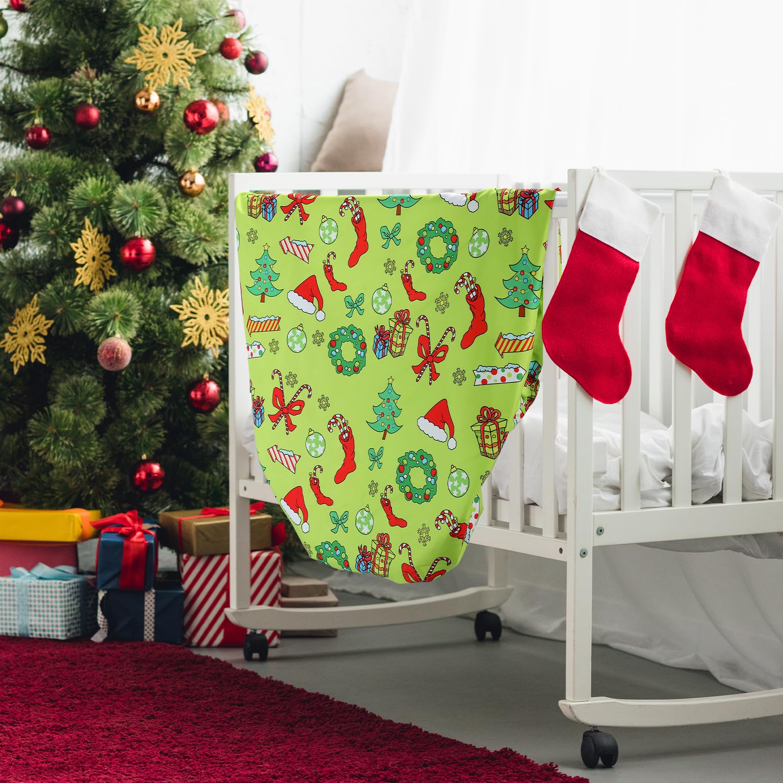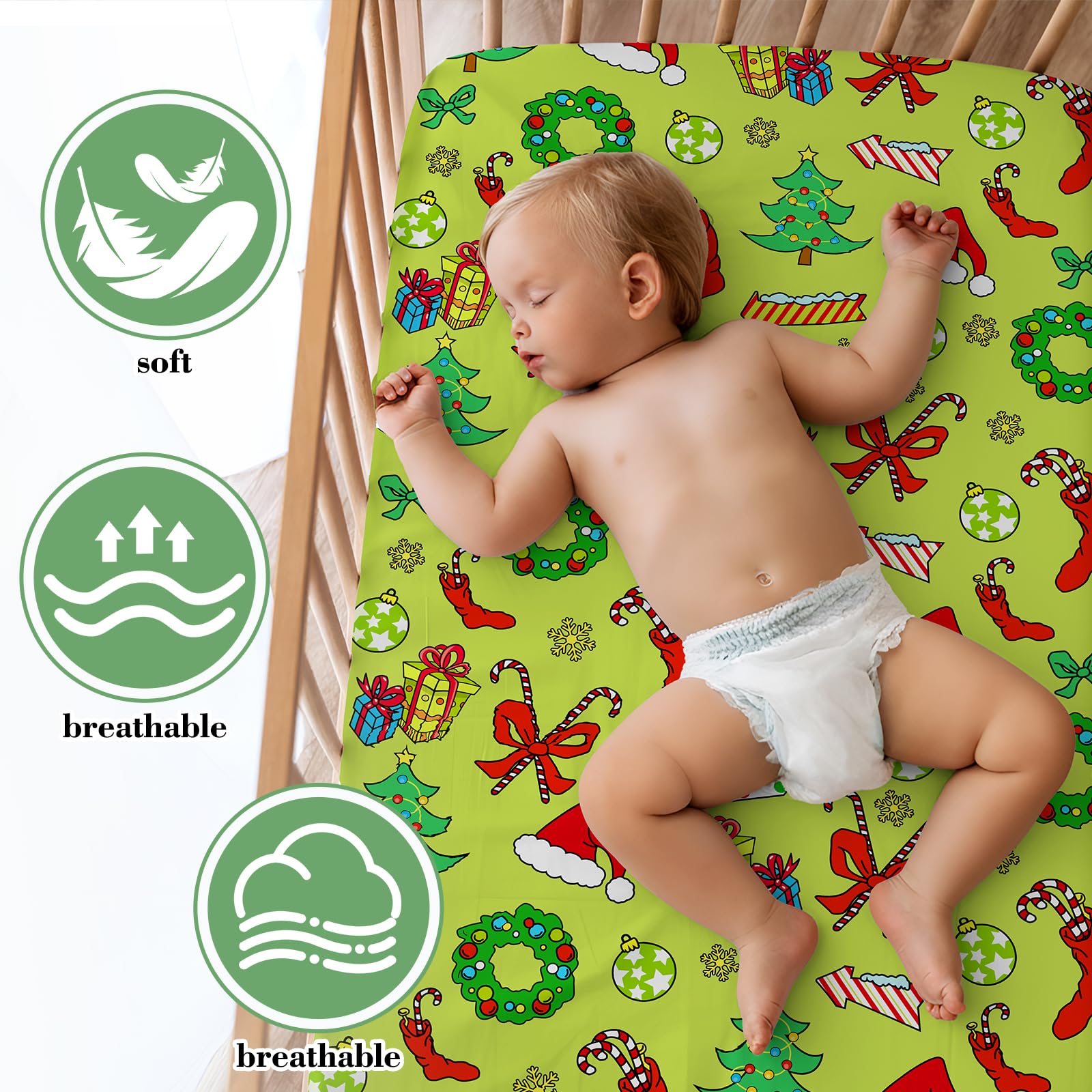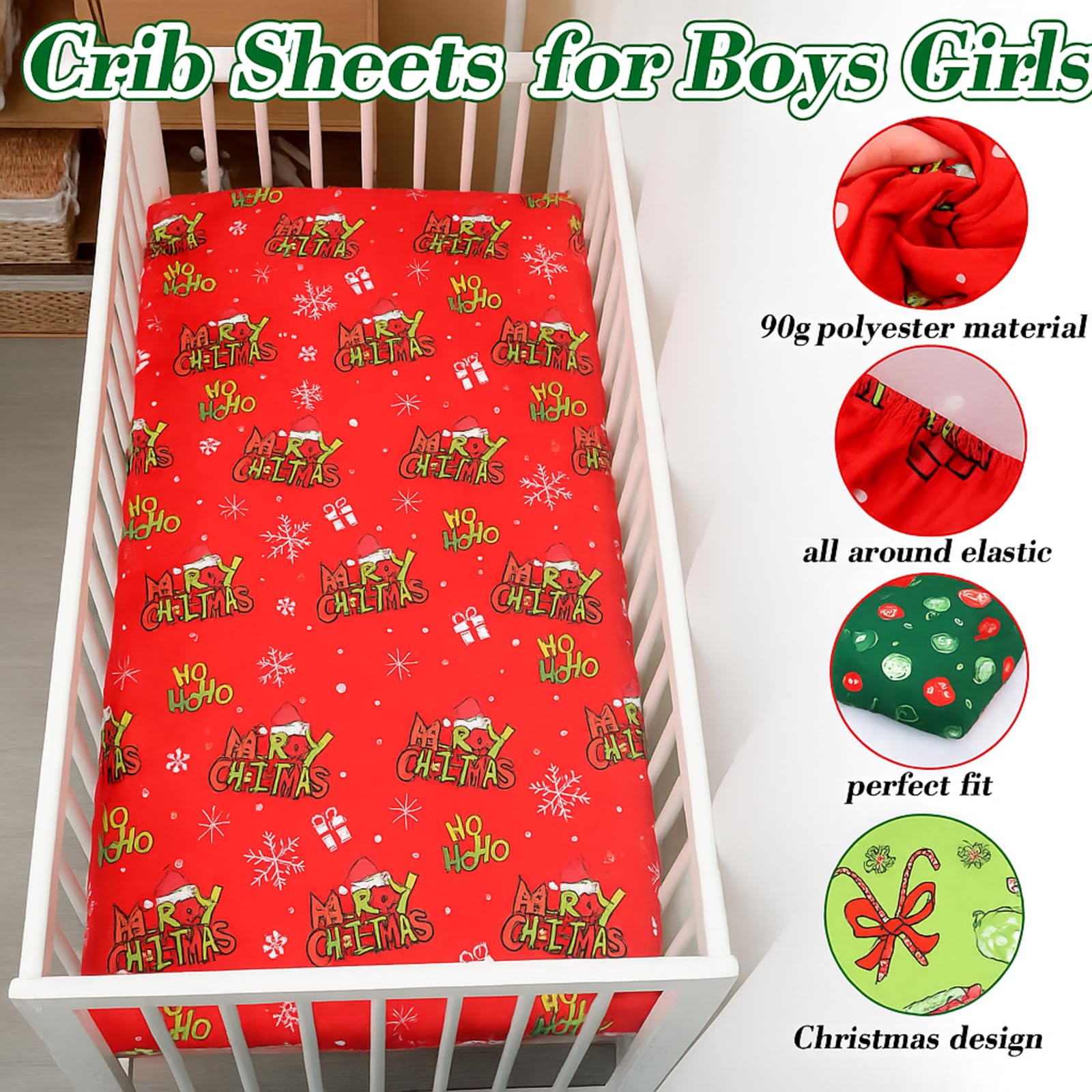 Christmas Theme Design: our Christmas baby sheets for crib aren't just convenient; They are a visual delight, featuring 3D printing technology and classic Christmas elements, such as Christmas balls, zigzags, Christmas gifts, and Christmas trees, and more; They feature reactive dyeing process, with clear patterns, and the colors will not fade after washing; They are easy to match with your cute mattress, blanket, shower curtain, wreath, table runner, and more