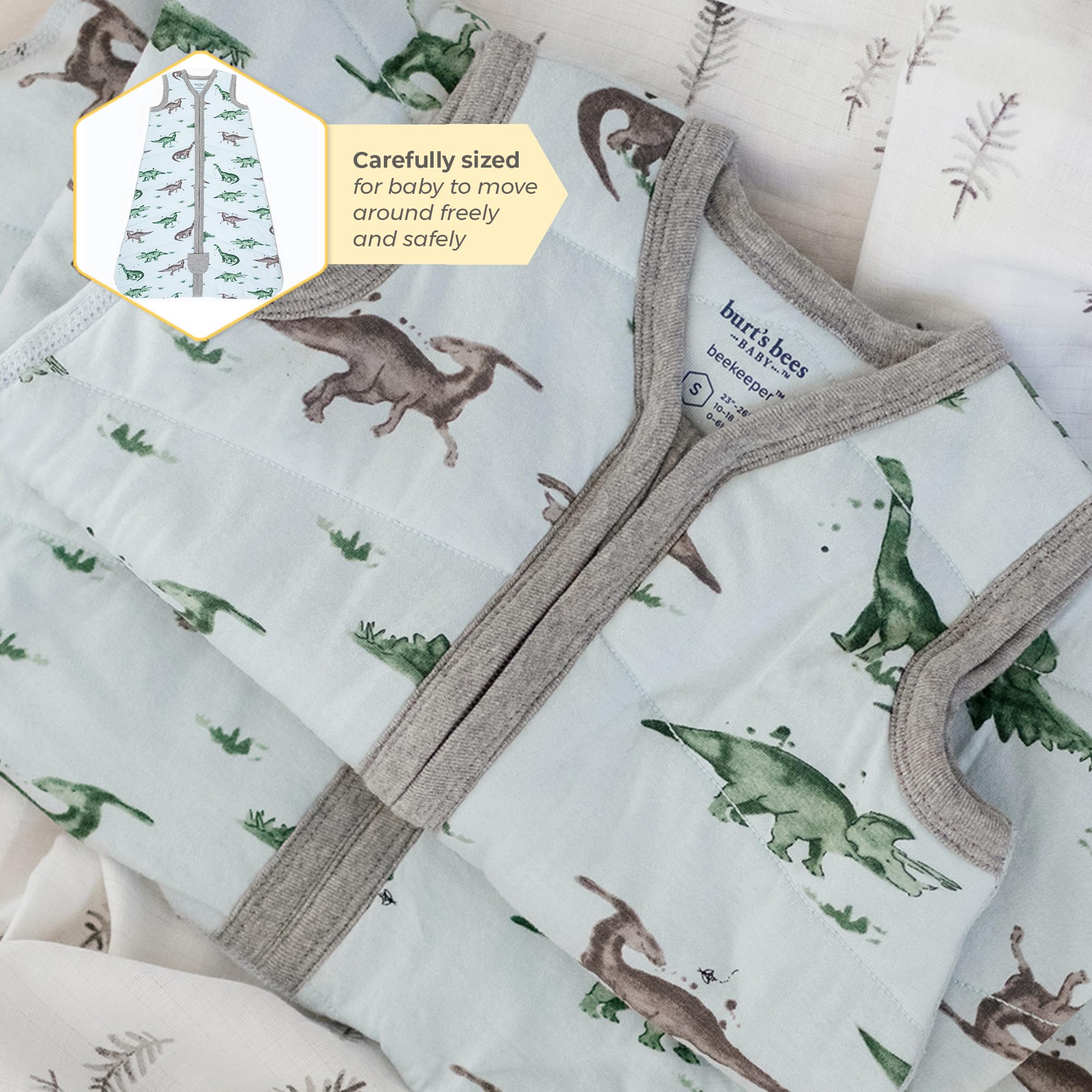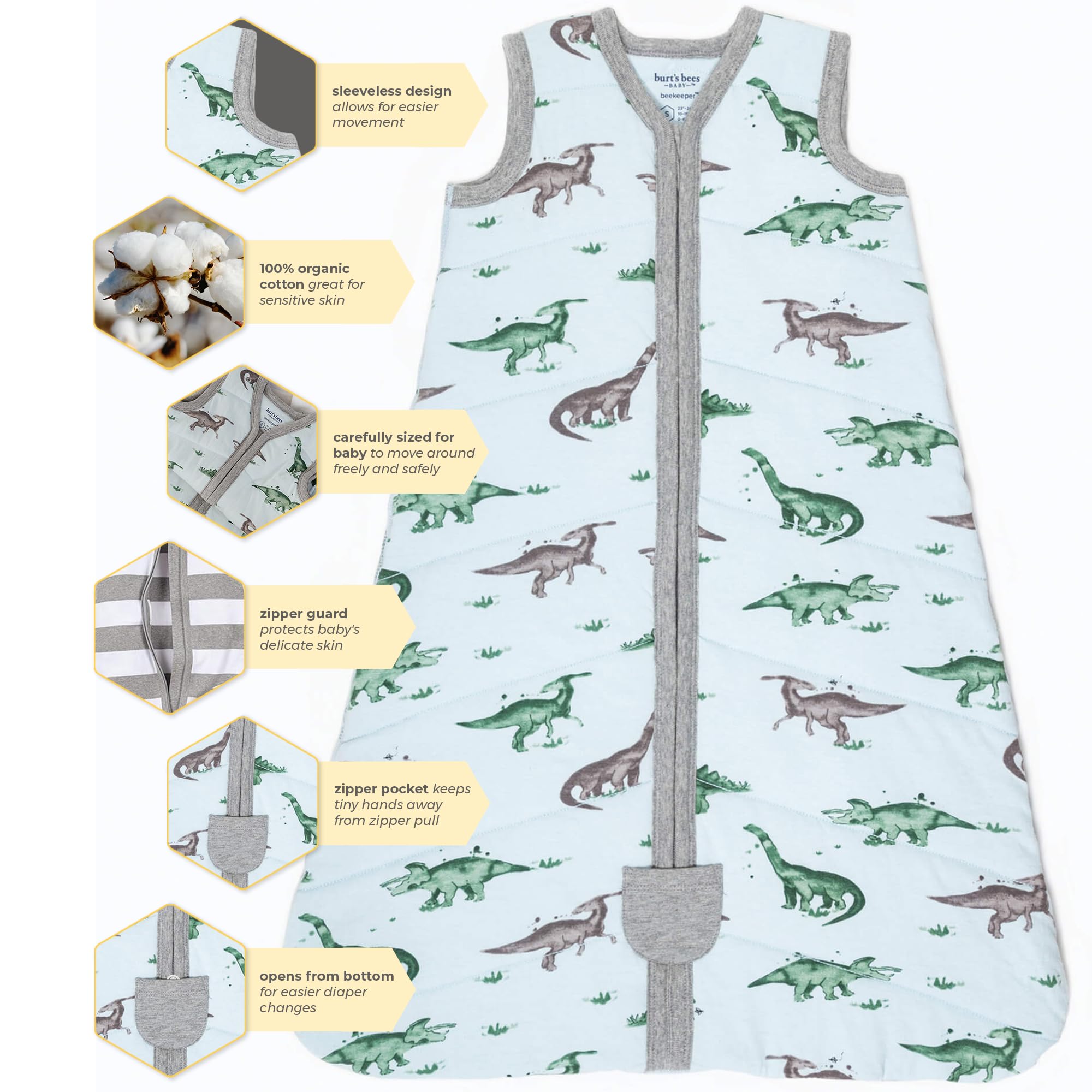 Description Burt's Bees Baby Organic Cotton Wearable Blanket. Designed to replace loose blankets in the crib, certified by CU 831717, 2024. Manufactured according to GOTS standards. Our Beekeeper wearable blanket keeps your little bee cozy, warm, and secure throughout the night. Made from 100% organic cotton. Keep your baby warm and secure with this best wearable blanket, crafted from 100% organic cotton for breathable, gentle comfort. Designed as a safe alternative to loose bedding, this infant wearable blanket promotes restful sleep while meeting top safety standards. Whether you choose the lightweight 0.5 TOG for mild nights or the cozy 1.5 TOG for cold weather, it’s the perfect baby wearable blanket winter option. With a bottom zipper for easy diaper changes and a snug fit that allows natural movement, this wearable blanket baby combines convenience with peace of mind making it a must have for every nursery. Burt’s Bees Baby wearable blanket offers cozy comfort for infants. A top choice for winter, this baby wearable blanket ensures safe sleep with soft, breathable organic cotton.