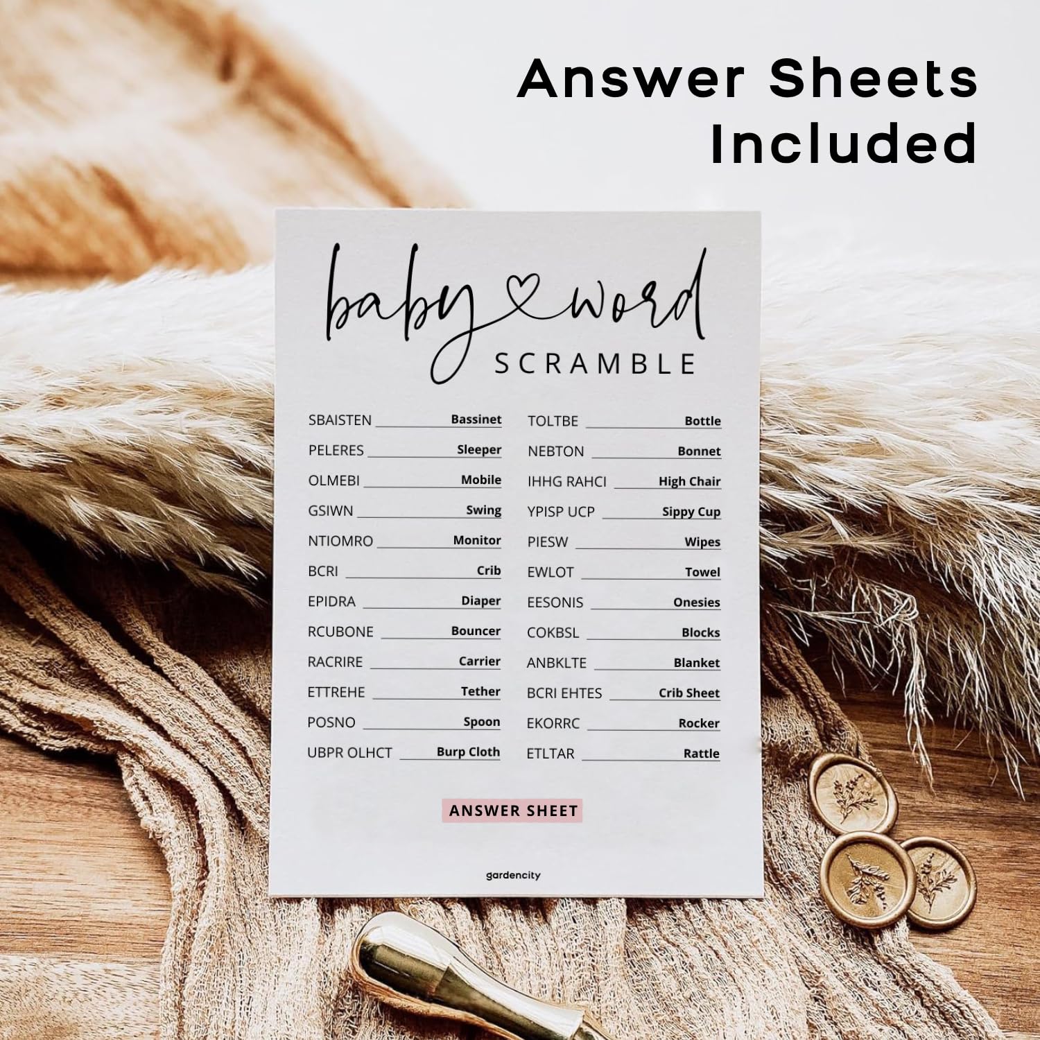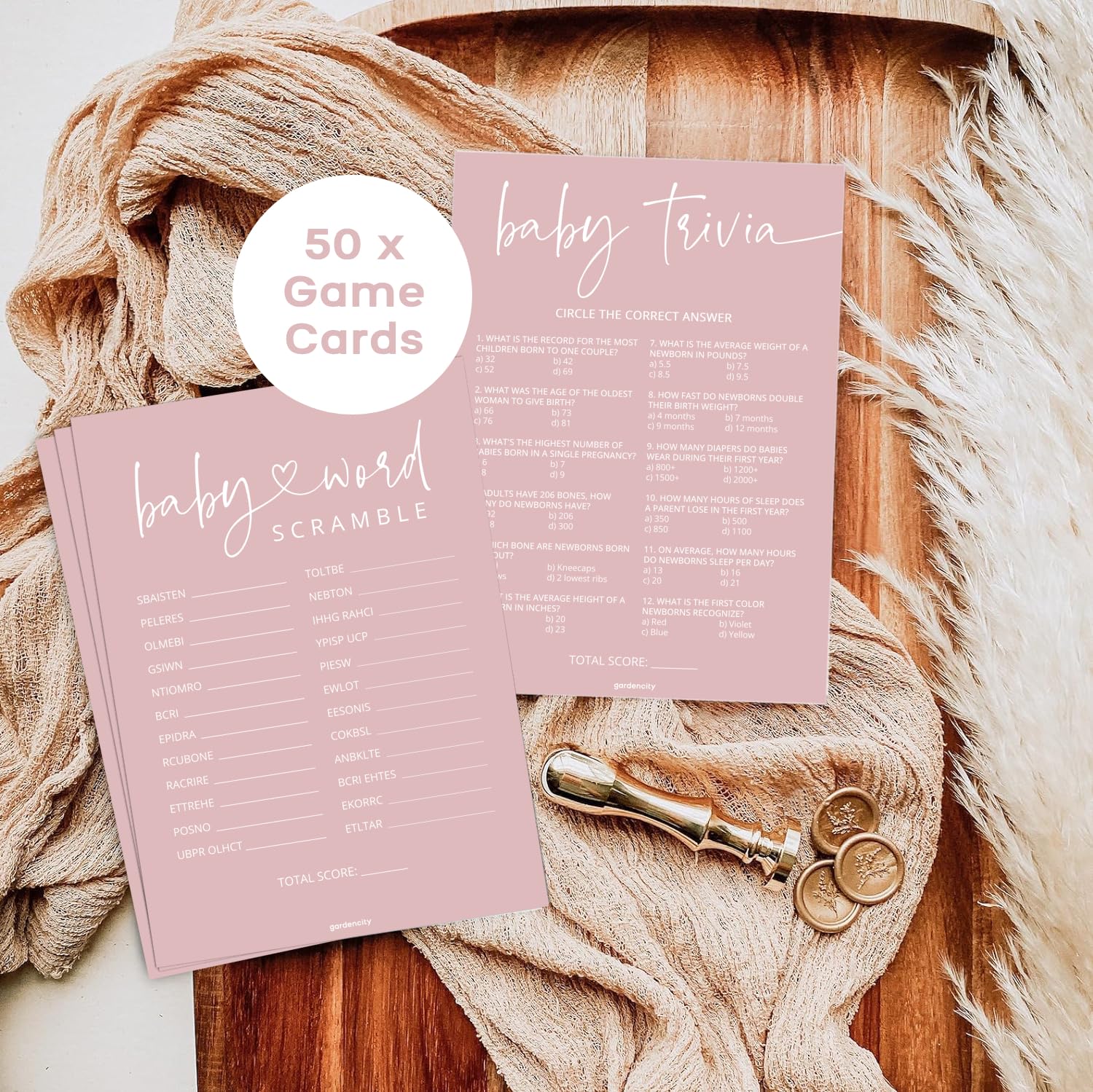 DOUBLE THE FUN: Includes two of the most popular baby shower games on 50 double-sided game cards and an answer sheet with instructions. Our Baby Trivia and Word Scramble games add fun and laughter to any baby shower event.