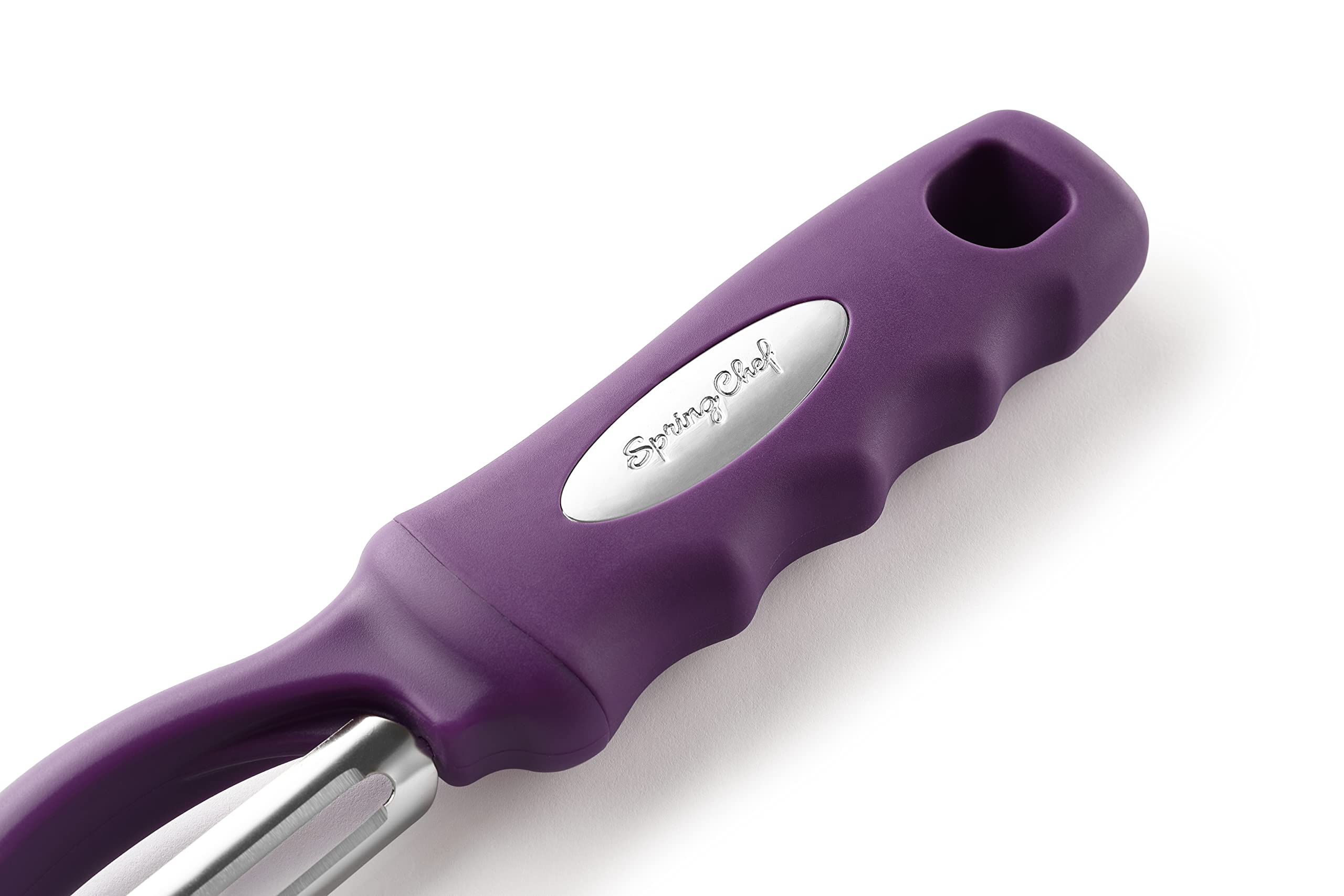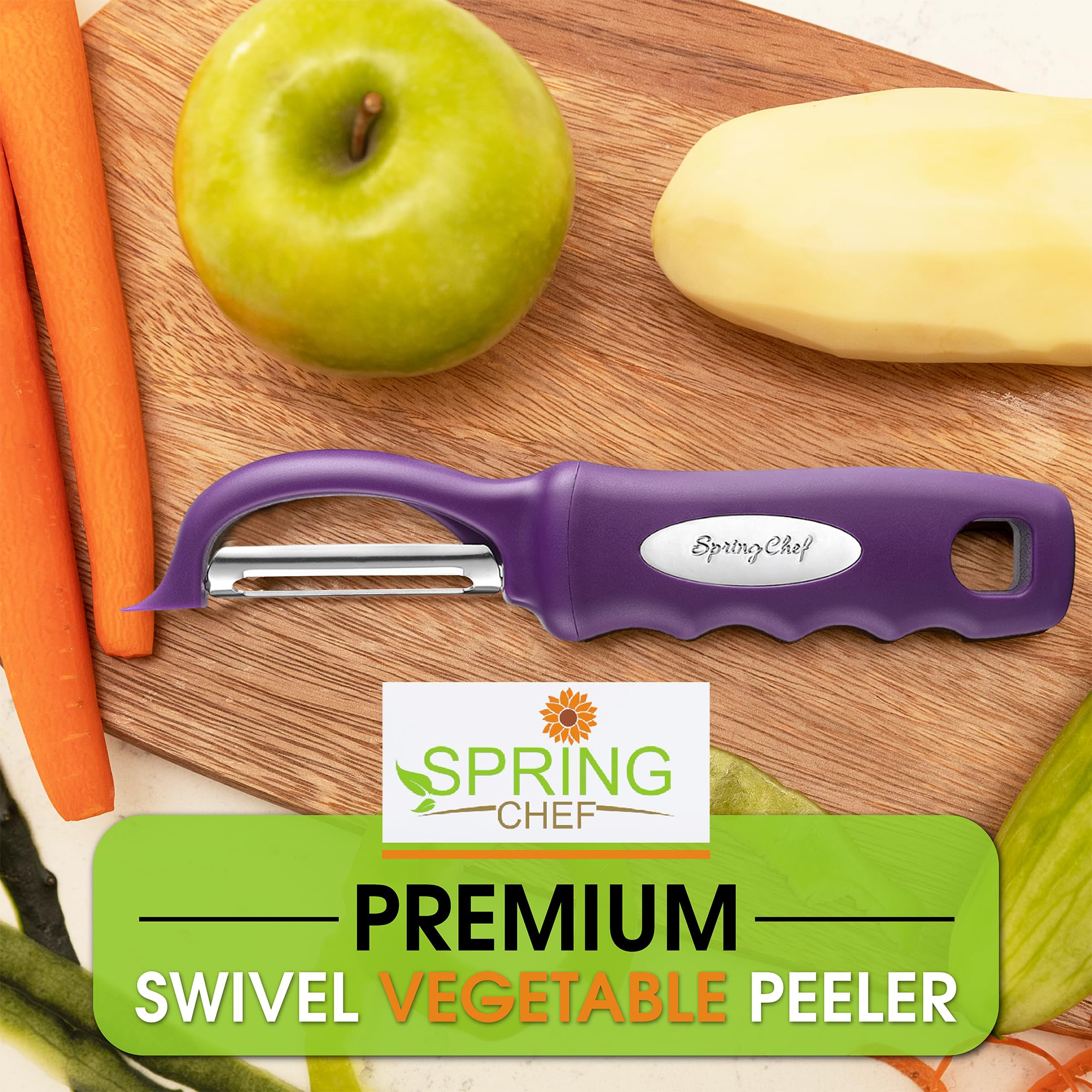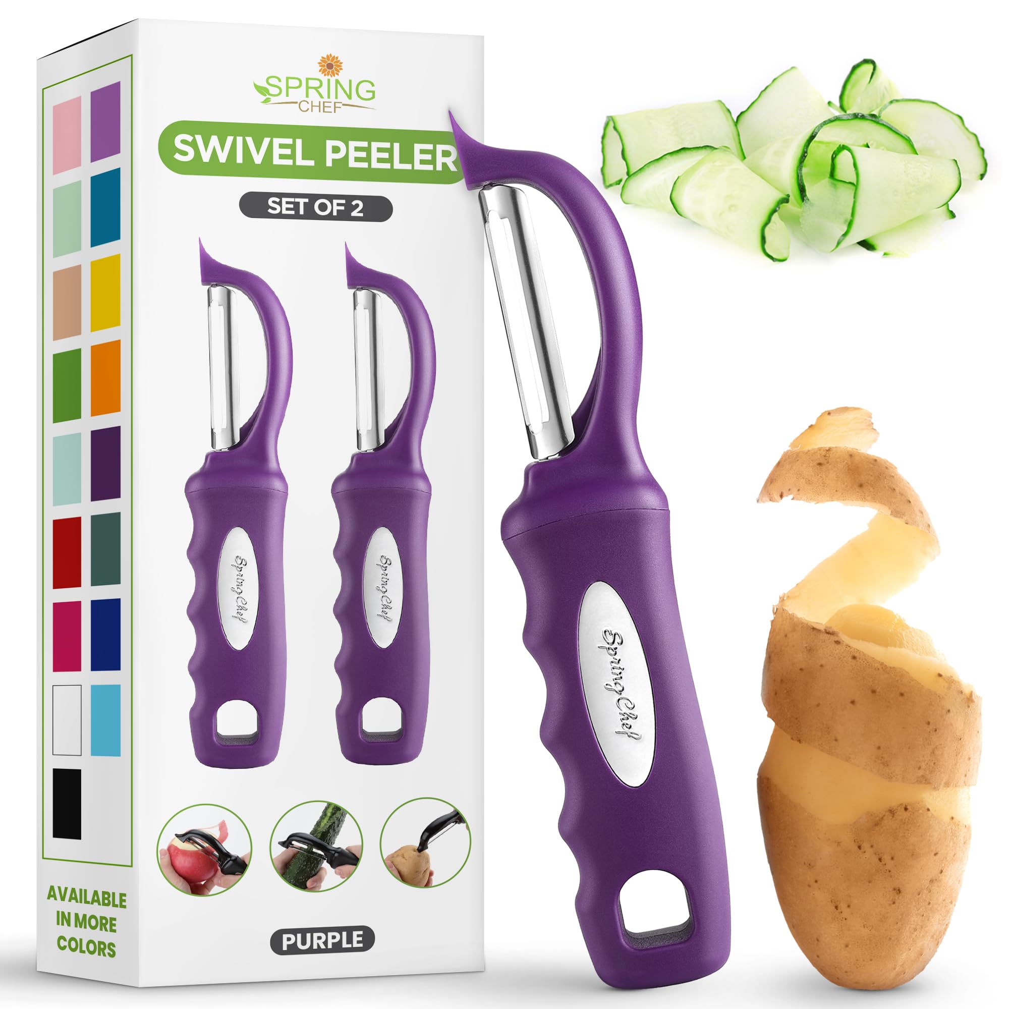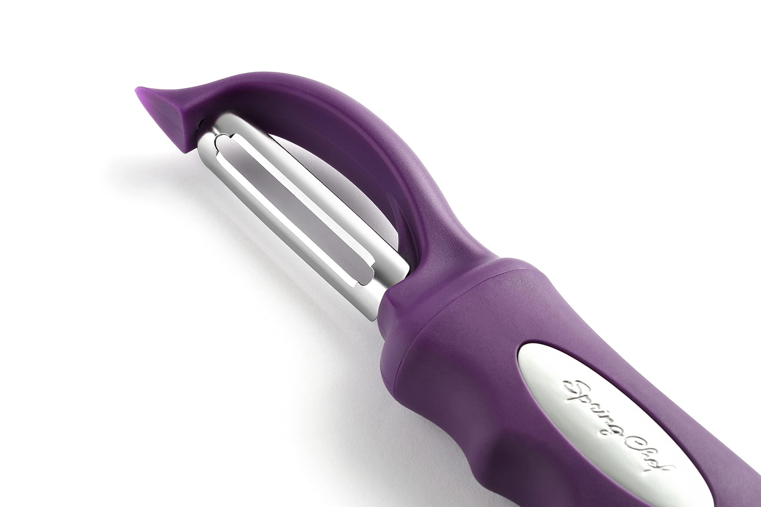 Smooth, Effortless Peeling - Dual Stainless Steel blades stay ultra sharp and swivel to glide along fruits and vegetables easily. Includes a built-in blemish remover.
