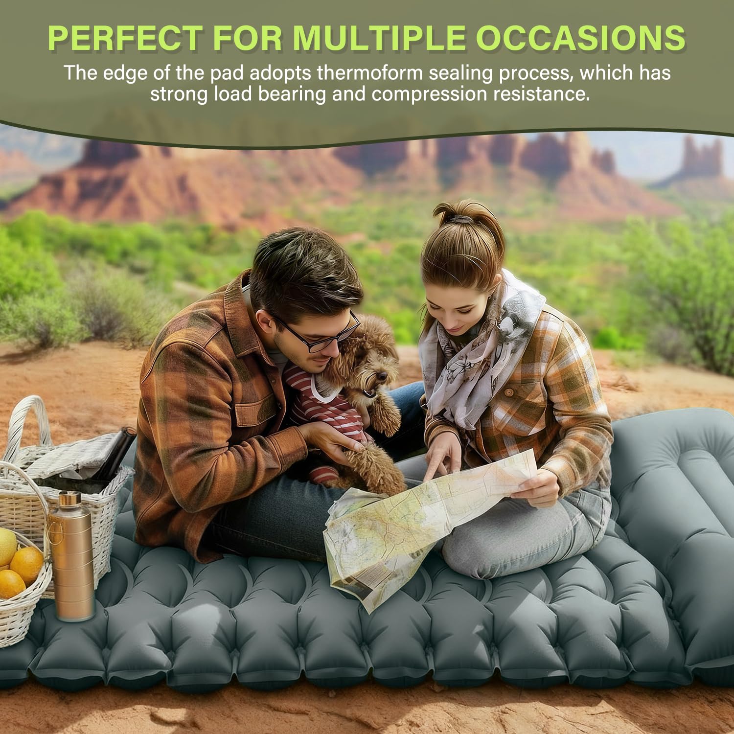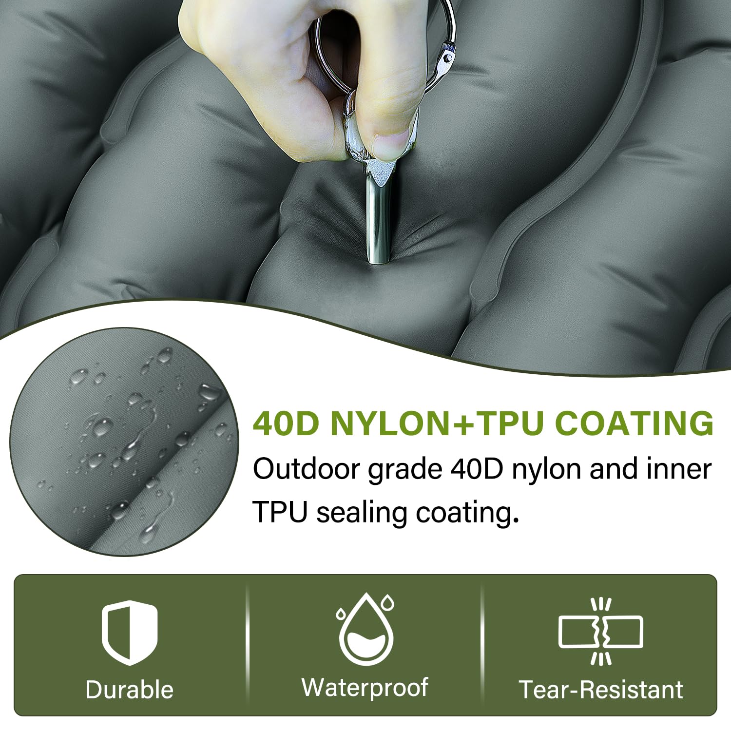 【Rugged 40D Nylon Fabric】: Built for the outdoors with tear-resistant, waterproof 40D nylon and a TPU inner coating. This durable mat withstands rough terrain, is easy to clean, and delivers reliable comfort night after night on any adventure.