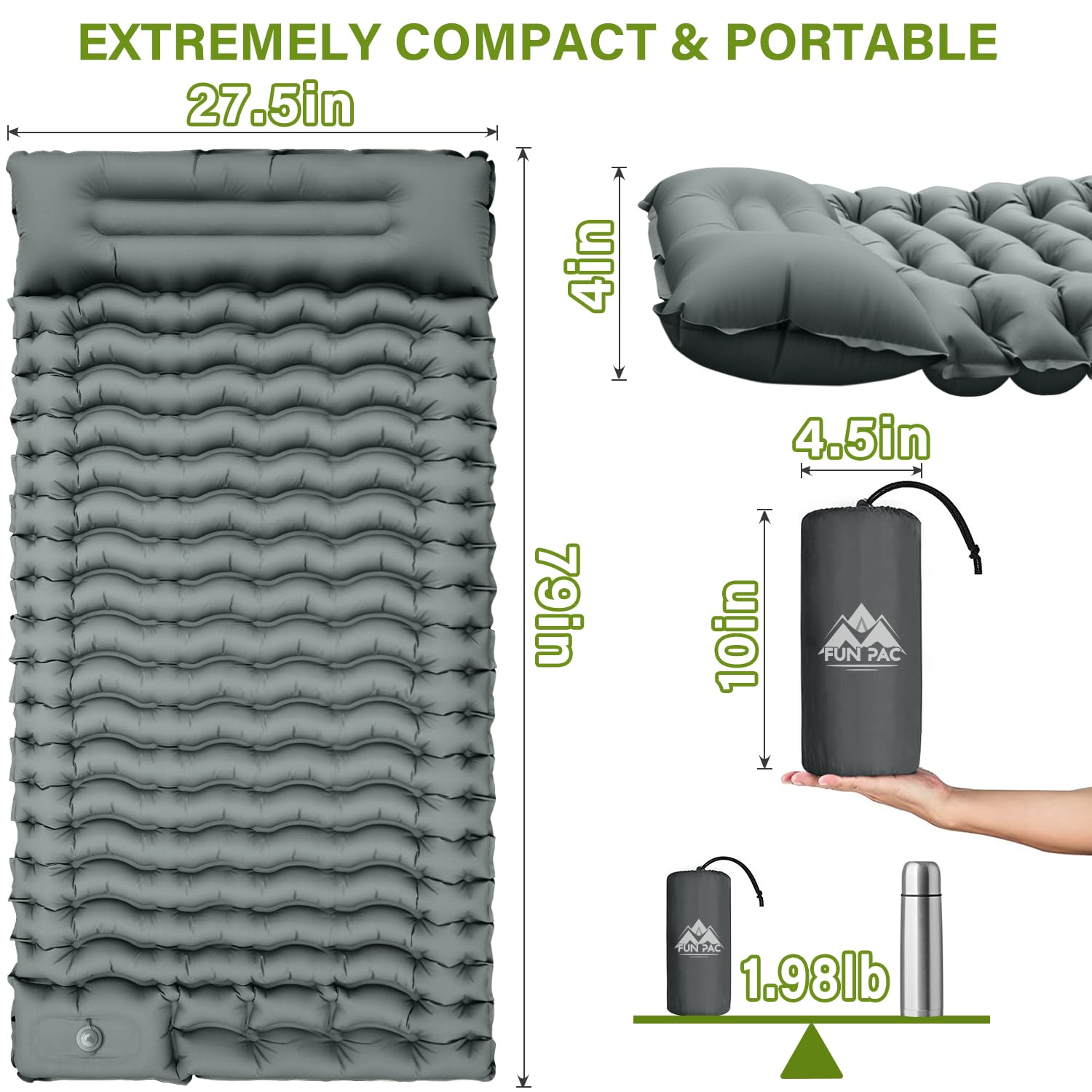 【Ultralight & Backpack-Friendly】: Weighing only 4.2 lbs and packing down small (like a water bottle), this mat includes a built-in pillow. It fits effortlessly into your backpack, making it ideal for hiking, camping, travel, and backpacking.