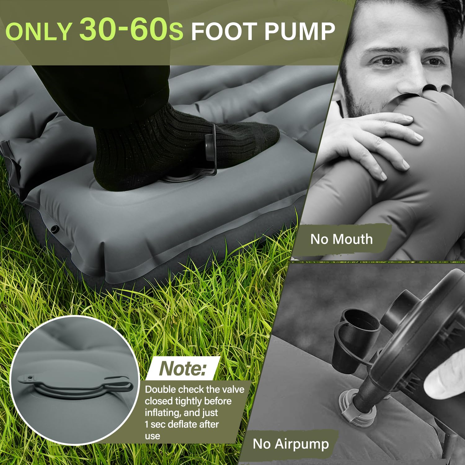 【30-Second Setup & Instant Packing】: Inflate fully in just 30-60 seconds using the built-in pump – simply step or press. No mouth inflation or tools needed! The upgraded double-layer valve deflates in 1 second and locks air securely, preventing leaks for hassle-free use.