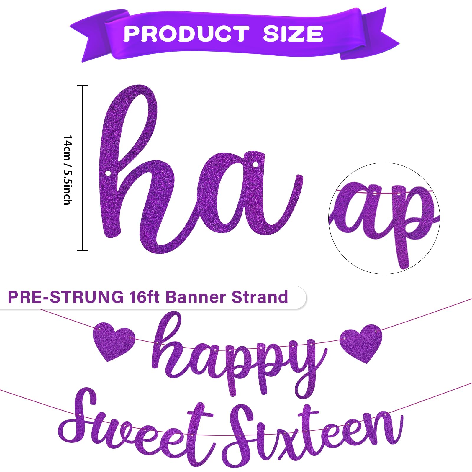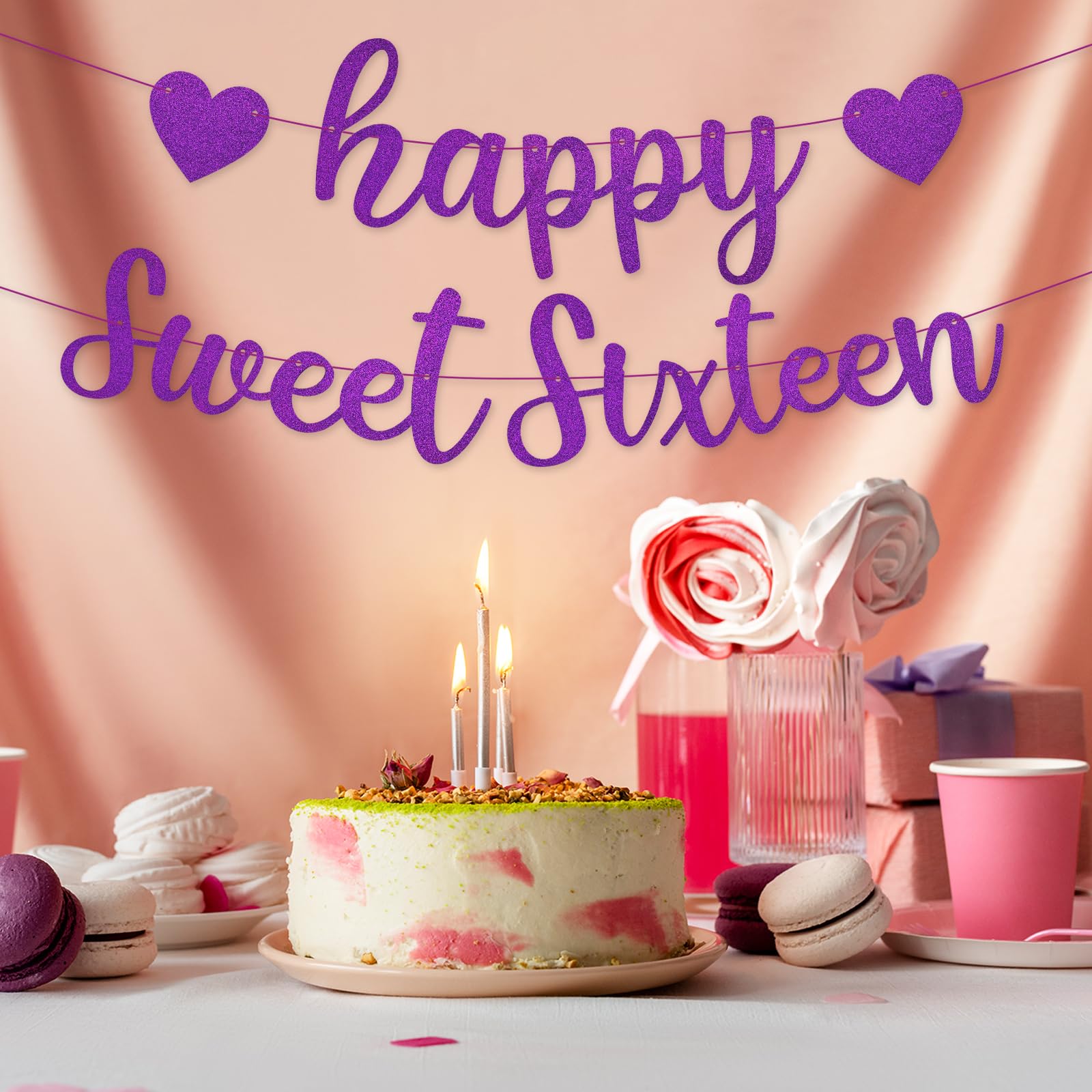 Birthday Party Supplies: Add some decorative shine to your loved's birthday party decor by hanging up this birthday banner! A beautiful piece to hang from a mantle, banisters, windows, front of a dessert table, on the wall behind your dessert table, walls, stair railing, You can use our sweet 16 party decor for birthday party, friends gatherings, room decorations, and so on.