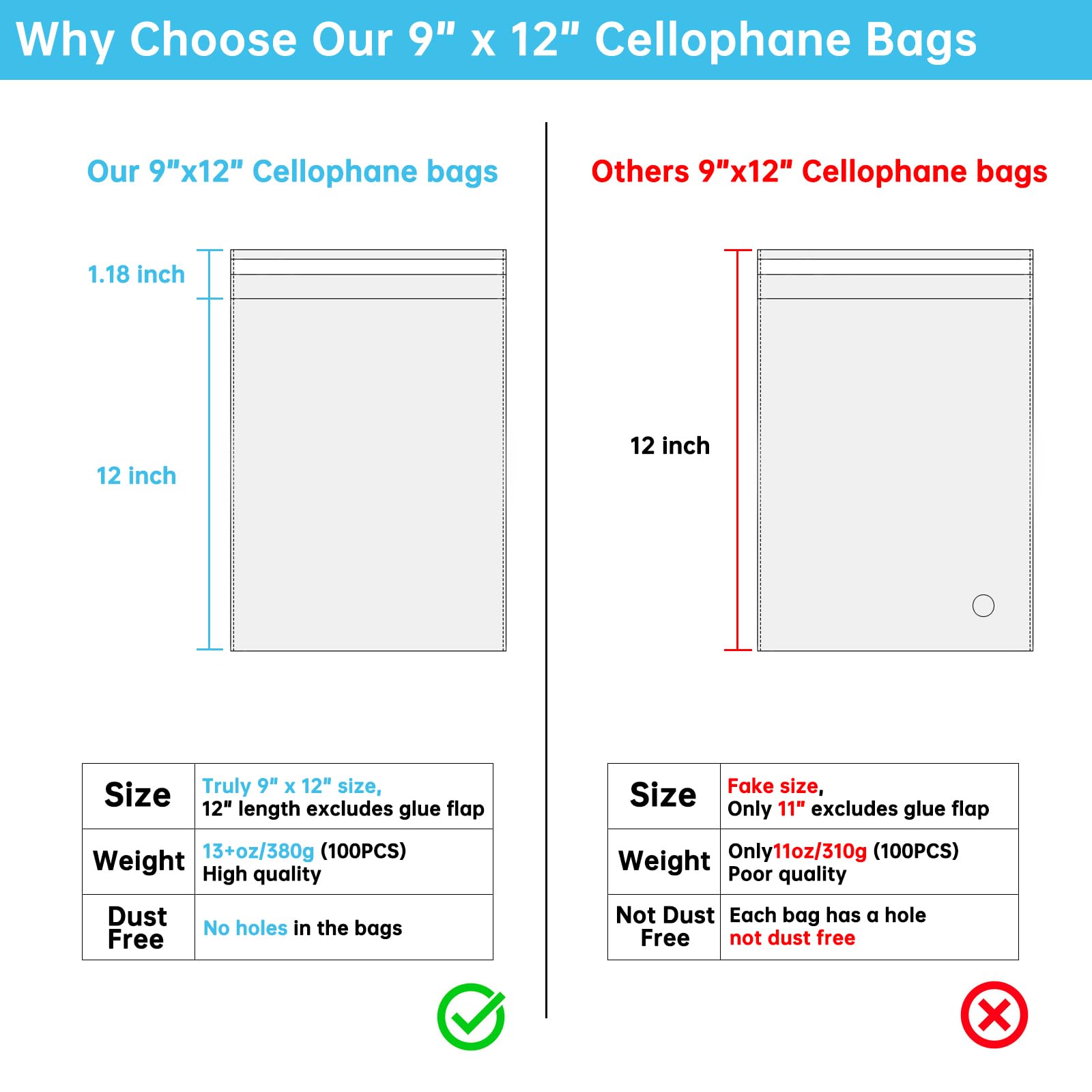 Quality Material: Our cellophane bags 9x12 are made from OPP material with reinforced sides, ensuring they do not easily split during use
