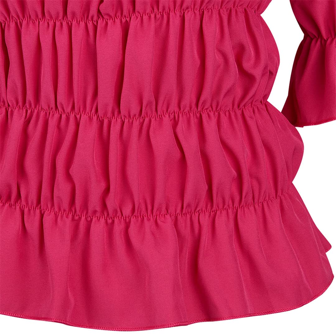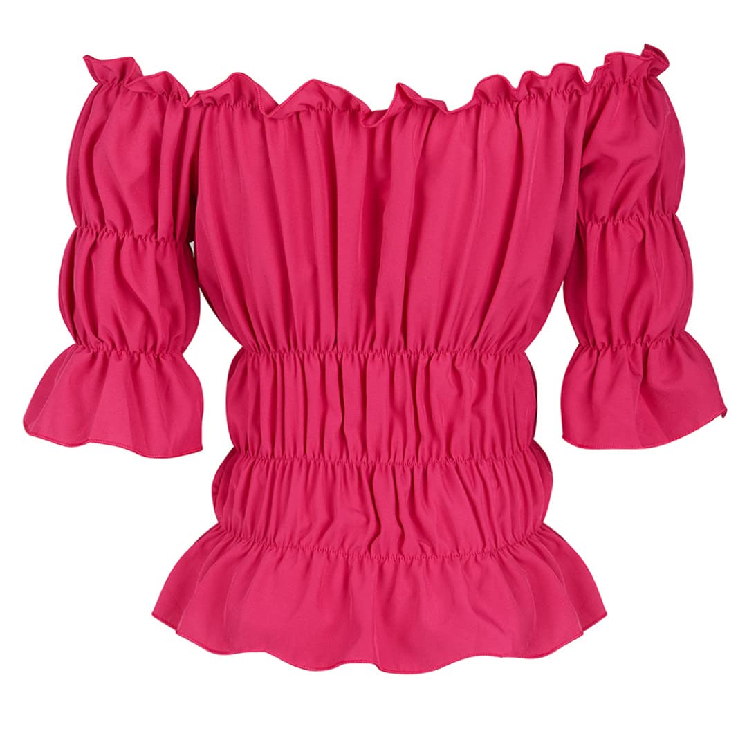Features: Half sleeves, off the shoulder design with ruffle features, neckline with elastic band, smocked waist.