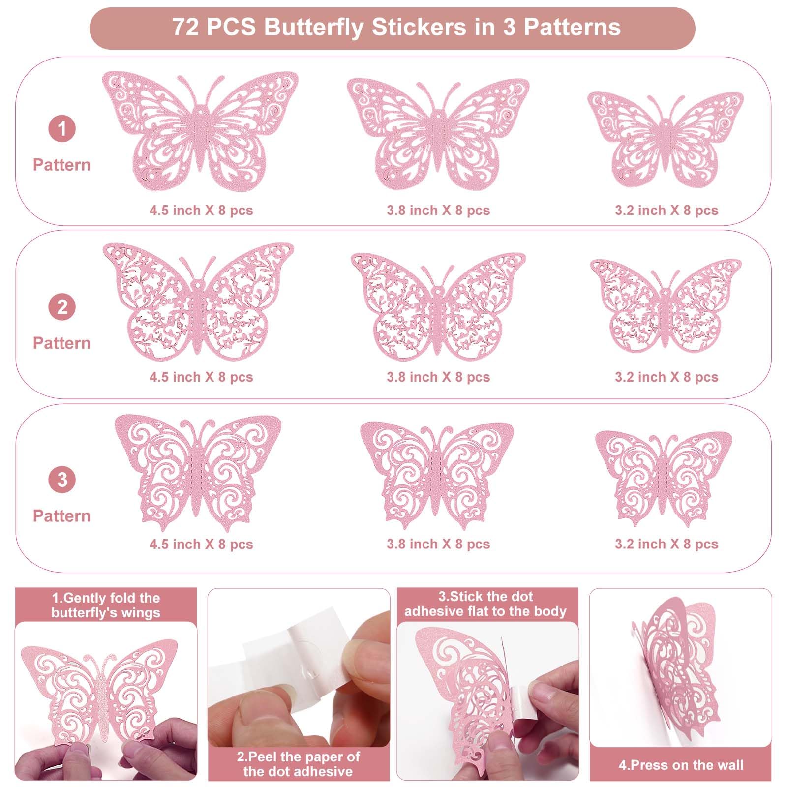 What You Will Receive - You will get 72 pcs butterfly wall stickers. 24 pcs pattern 1, 24 pcs pattern 2 and 24 pcs pattern 3. Each pattern has 3 sizes (3.2", 4", 5"). Come with double-sided glue dots.