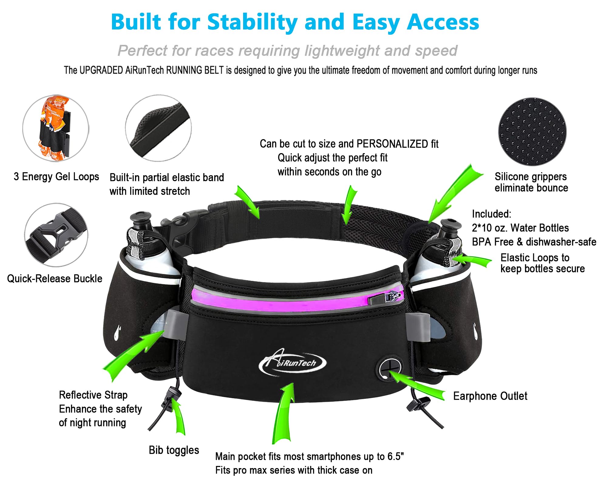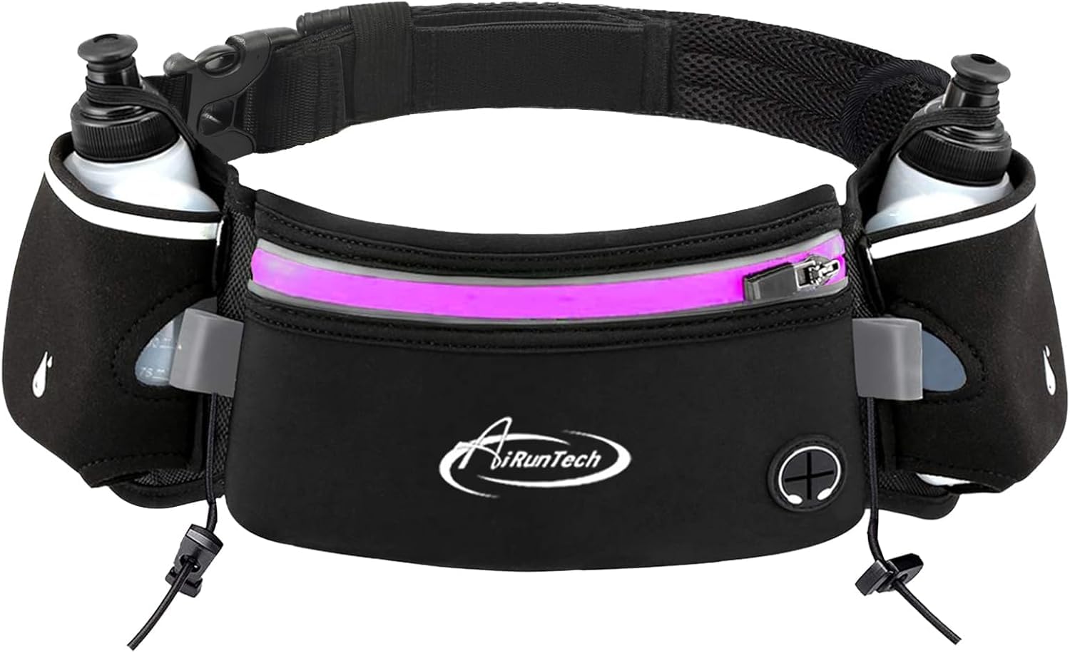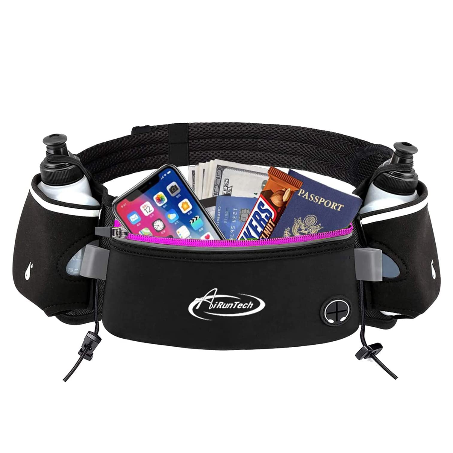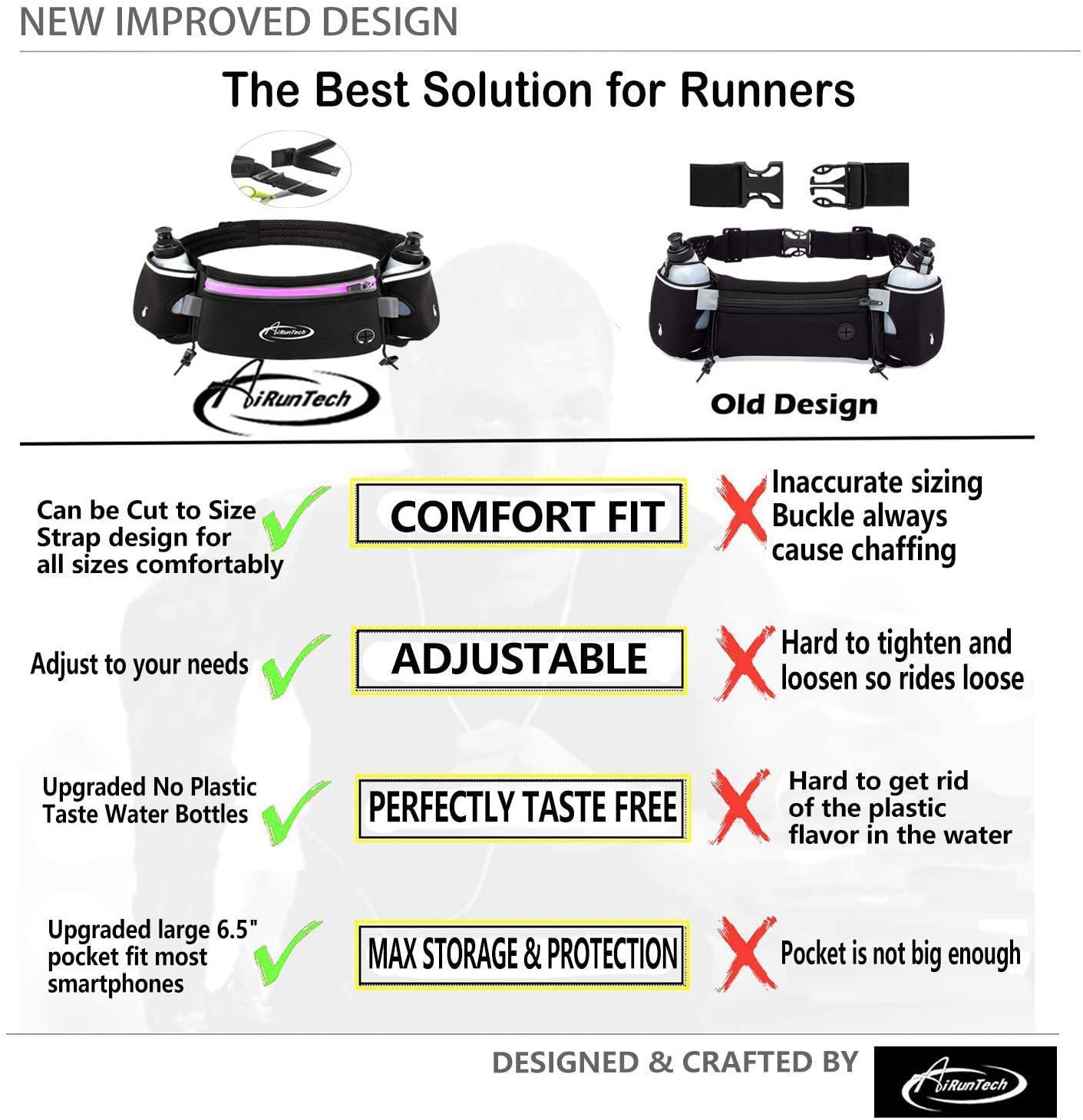 AiRunTech is a US brand focusing on products assisting to the people who are fond of running, cycling, swimming, snow skiing, and other outdoor activates etc. AiRunTech prioritizes on ensuring excellence in Quality, Eco-friendliness and utmost comfort. Organized by a young team, AiRunTech is committed to source premium quality products for you and keep improve the products. Our products are designed to help you enjoy sports with greater comfort, convenience, and style. STORAGE & PROTECTION Fit for Apple iPhone series,Huawei, Samsung Galaxy Note,Sony and most smartphones.The running belt is also perfect for credit cards, ID, keys, paper towel, bars choc, energy gel packs, running accessories, etc.With zipper closure,keeps your valuable belongings secure inside.Keep your hands free and avoid pickpockets while on the go. FRICTION-FREE COMFORT AiRunTech running water belt is made of high quality, lightweight,durable,soft Neoprene material, with anti-slip design, adjustable hook&loop tape strap waistband allows for a snug fit that stays in place without bouncing or chafing during use. Easy for buckling and comfortable for wearing. EXCLUSIVE HEADPHONE HOLE How can there be no music during exercise, the opening for earphone wire let you can enjoy music even when the running bag is closed. FULLY ADJUSTABLE long enough to accommodate plus size, but is also easily cut for people with slimmer builds, give you the ultimate freedom of movement and comfort, personalized fit for waist from18 - 51.2 inches(46cm-130cm) . VERSATILITY & SAFETY Two 175ml BPA-free water bottles allow you to easy access to hydration and nutrition.Design of 2 removable race bib strap toggles can hold your race number for triathlons, marathons or running race. Reflective tabs on the front of the pocket are for high visibility, keeping you more safely when running or walking.