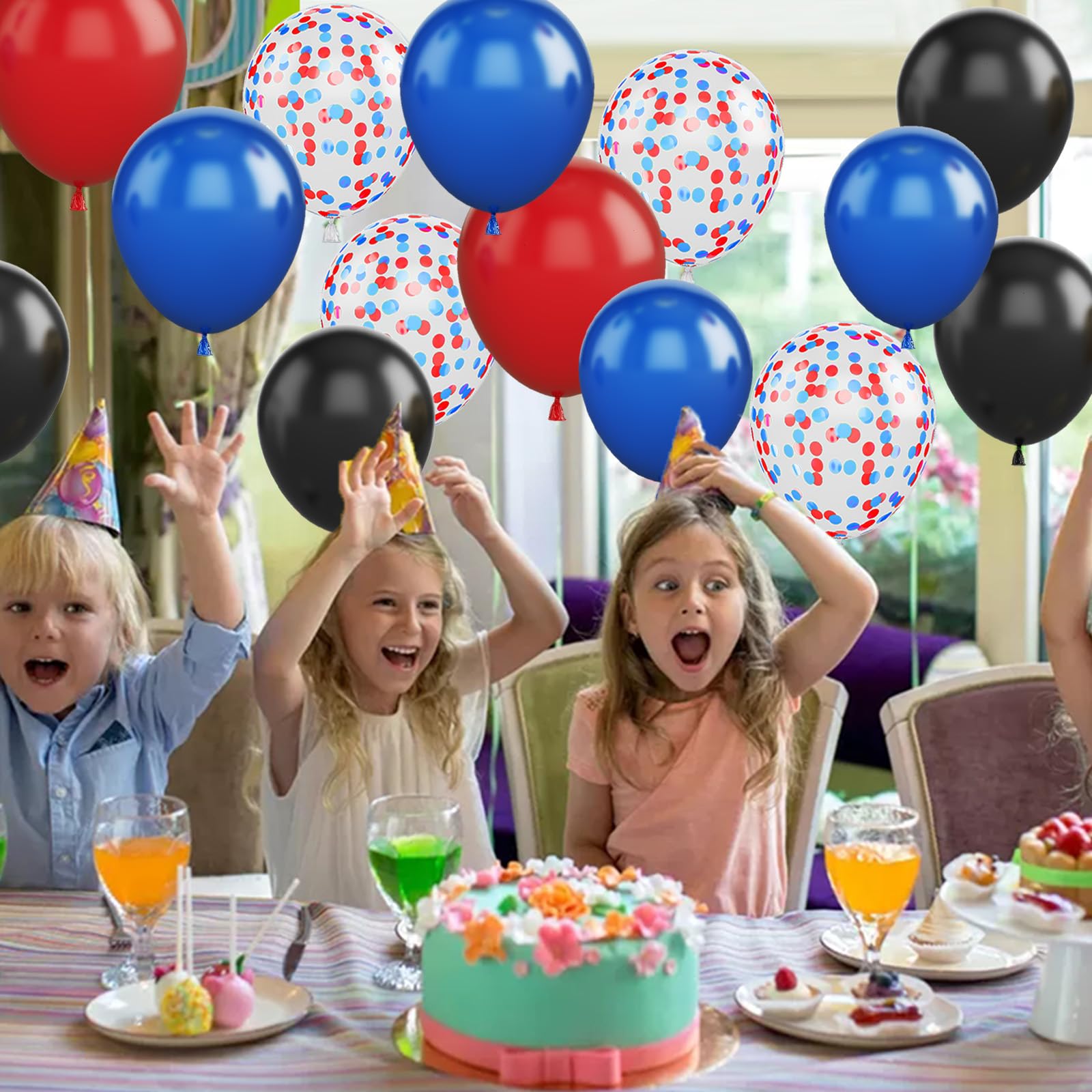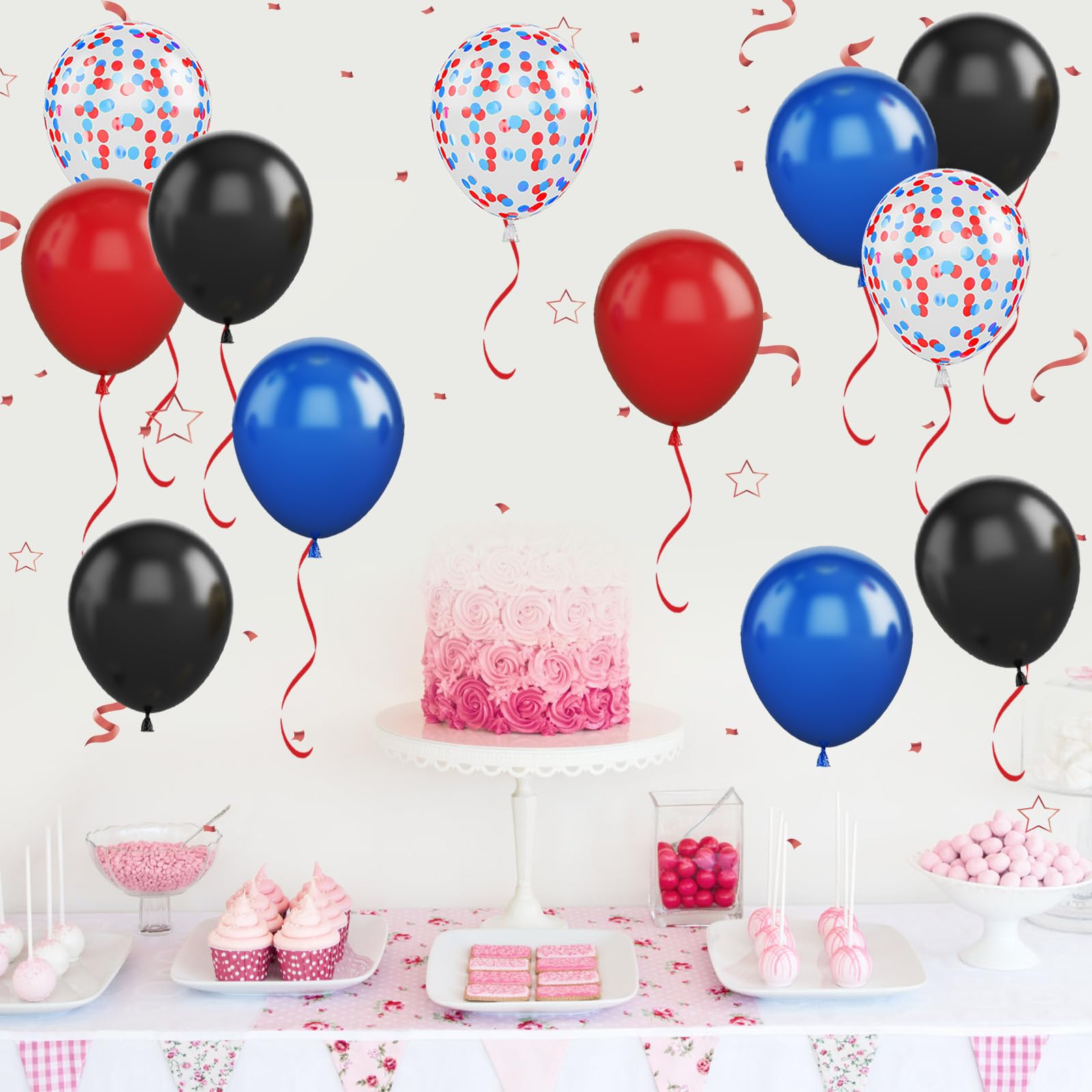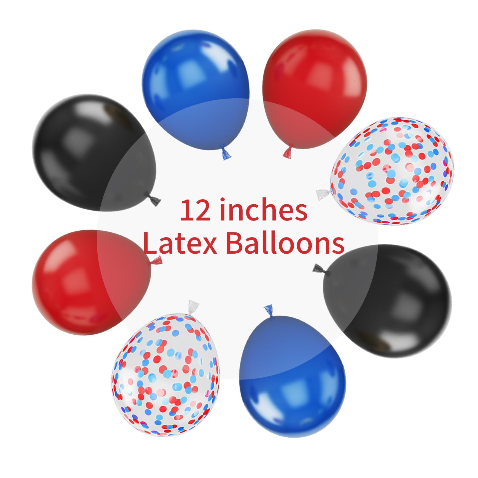 12 Inch red blue black balloon set: Package content includes 7 pcs red balloons, 5 pcs confetti red blue Balloons, 8 pcs royal blue balloons, 10 pcs black balloons, a balloon ribbon.The color combination meets all your party imagination.