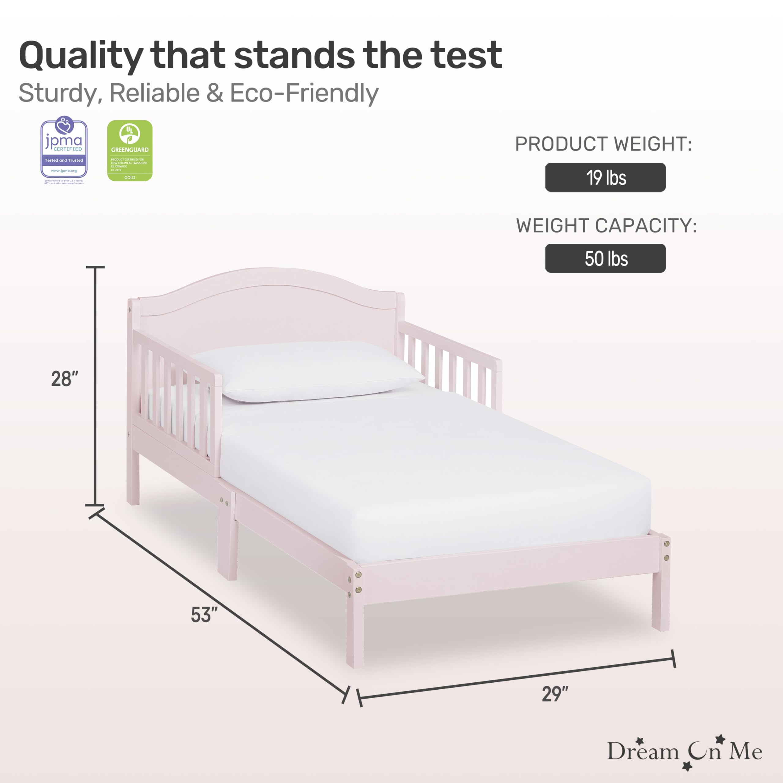 Make the crib-to-toddler transition easy and reassuring with the Dream On Me Sydney Toddler Bed. Sitting low to the floor so little legs can climb in and out confidently, the Sydney includes two side safety rails and center legs for reinforced stability, while sturdy wooden slats provide reliable mattress support. Its chic, modern silhouette with a bell-shaped full panel headboard blends beautifully into any kid’s room, and the elegant, non-toxic finishes complement a wide range of décor. Safety is built in: the Sydney is JPMA certified, meets or exceeds all applicable ASTM and CPSC standards, and is free of phthalates, latex, lead, and BPA. Designed to fit a standard-size crib mattress (for the best fit, pair with a Dream On Me non-toxic, Greenguard certified standard crib mattress), it offers a compact footprint that works in rooms of all sizes. Dimensions: 53" L x 29" W x 28" H; product weight: 19 lbs; maximum weight limit: 50 lbs.