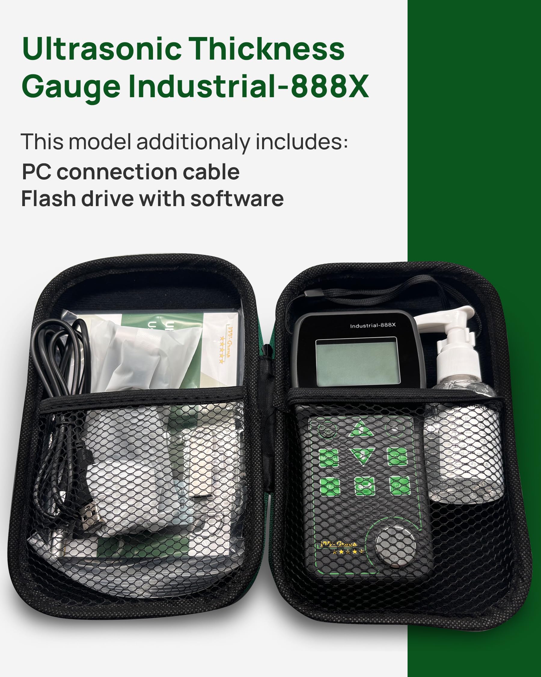 PC CONNECTION: Ultrasonic thickness gauge Industrial-888X has the ability to connect to a PC, and measurement data can be exported in XLSX or PDF formats. For this purpose, this model additionally includes a PC connection cable and a flash drive with software.