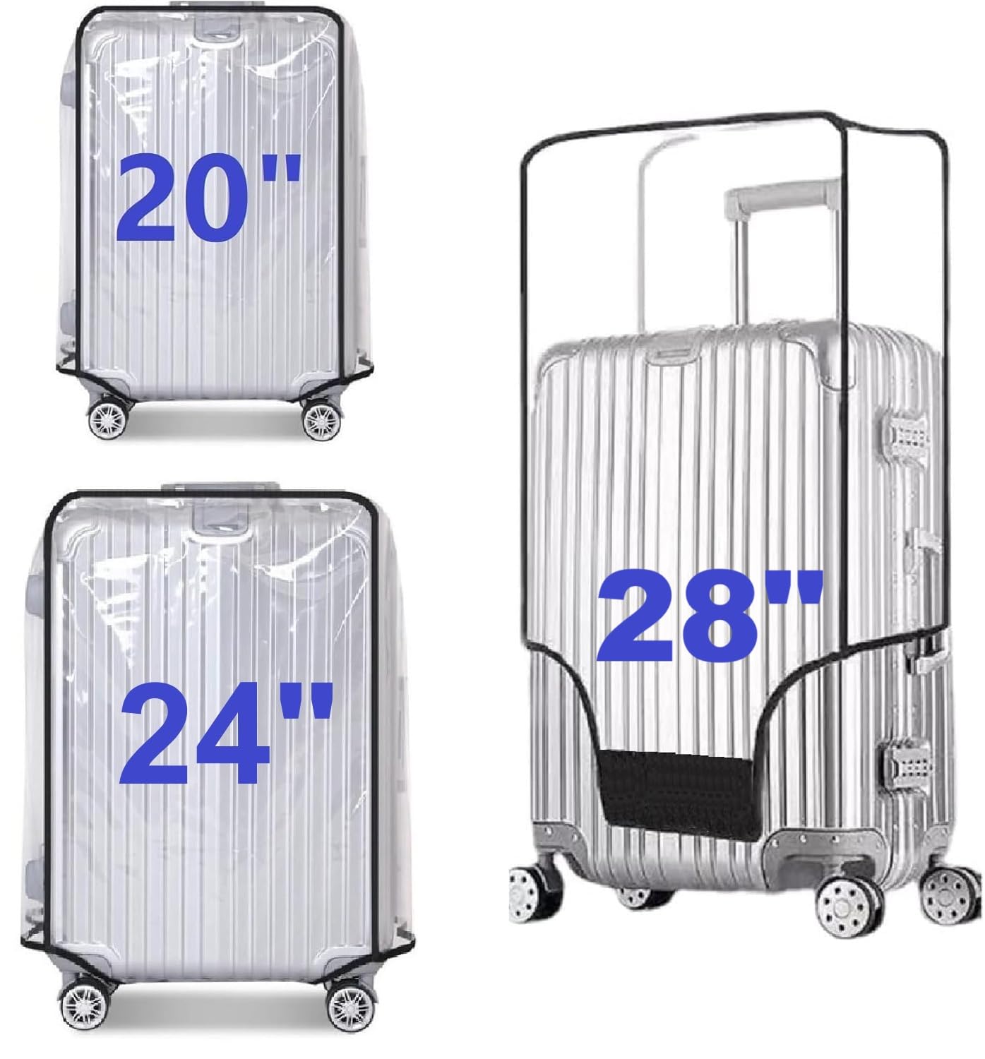 PVC Suitcase Cover Size: 20inch Suitcase cover size is about18.5''H x 14.17''L x 9.44''W, not includes the wheel height ,24 inch Suitcase cover size is about 22.44''H x 16.92''L x 11.41''W, not includes the wheel height ,28 inch Suitcase cover size is about 25.98''H x 19.68''L x 11.81''W,not includes the wheel height,Pls make sure your Suitcase size before place the order.