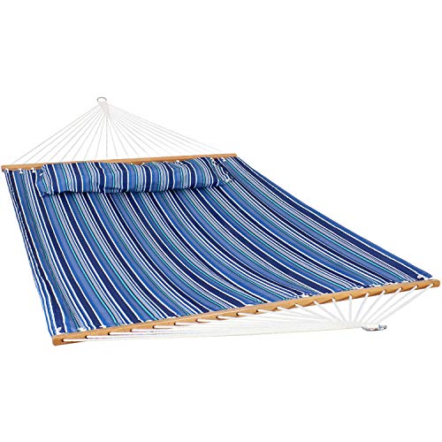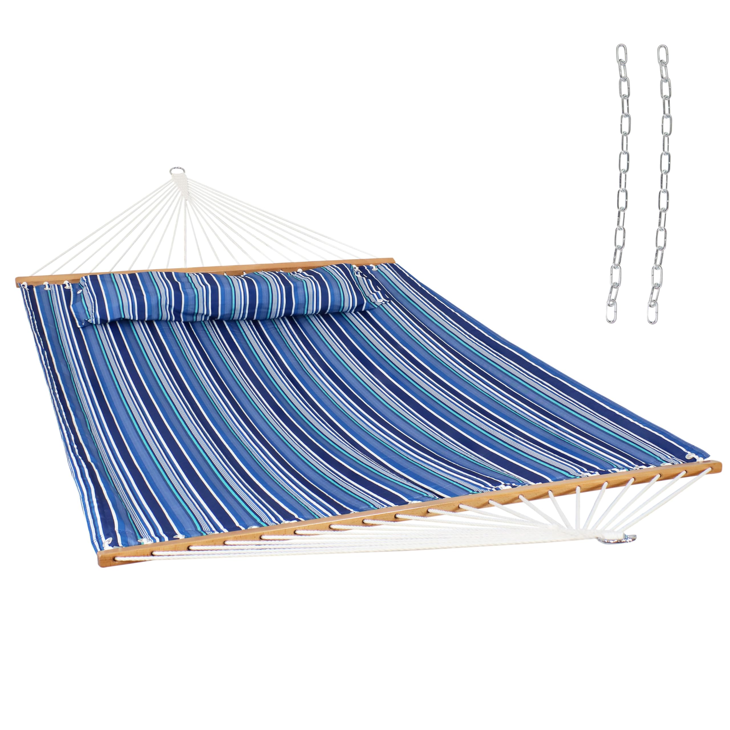 VERSATILE HANGING OPTIONS: The quilted hammock features attached chains for easy hanging. This two person hammock swing can be tied between trees, poles, or used with a 12' to 15' hammock stand (not included). It's wonderful for a variety of indoor or outdoor locations including the backyard, campsite, patio, sunroom, or bedroom.