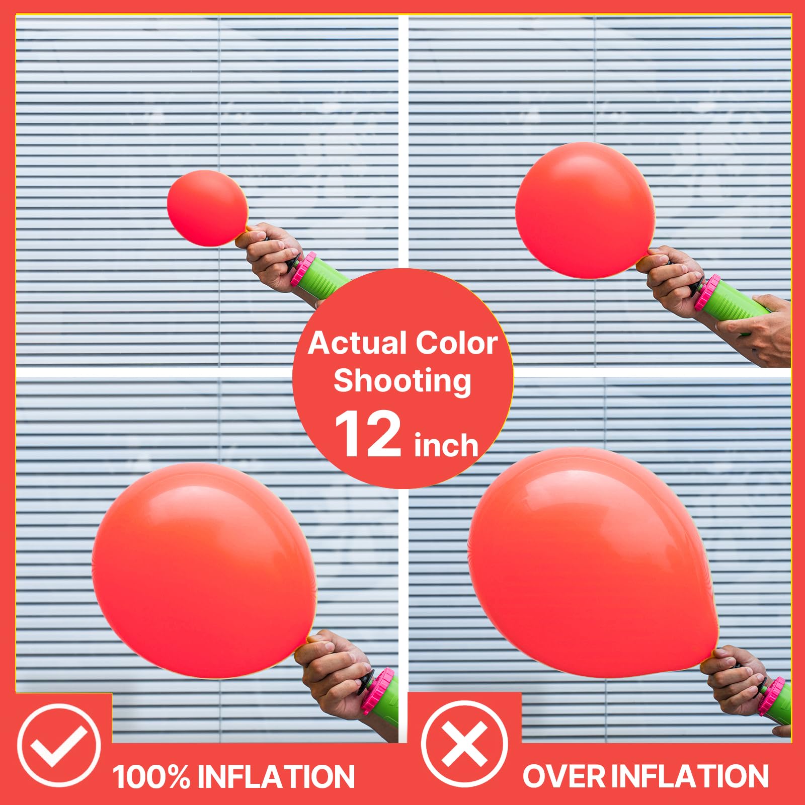 ATTENTION & WARNING: Please DO NOT overfill the balloons and also avoid sunburn, overheat, pointed object and excessive friction. Control the amount of air inflated into each balloon to achieve your ideal balloon size