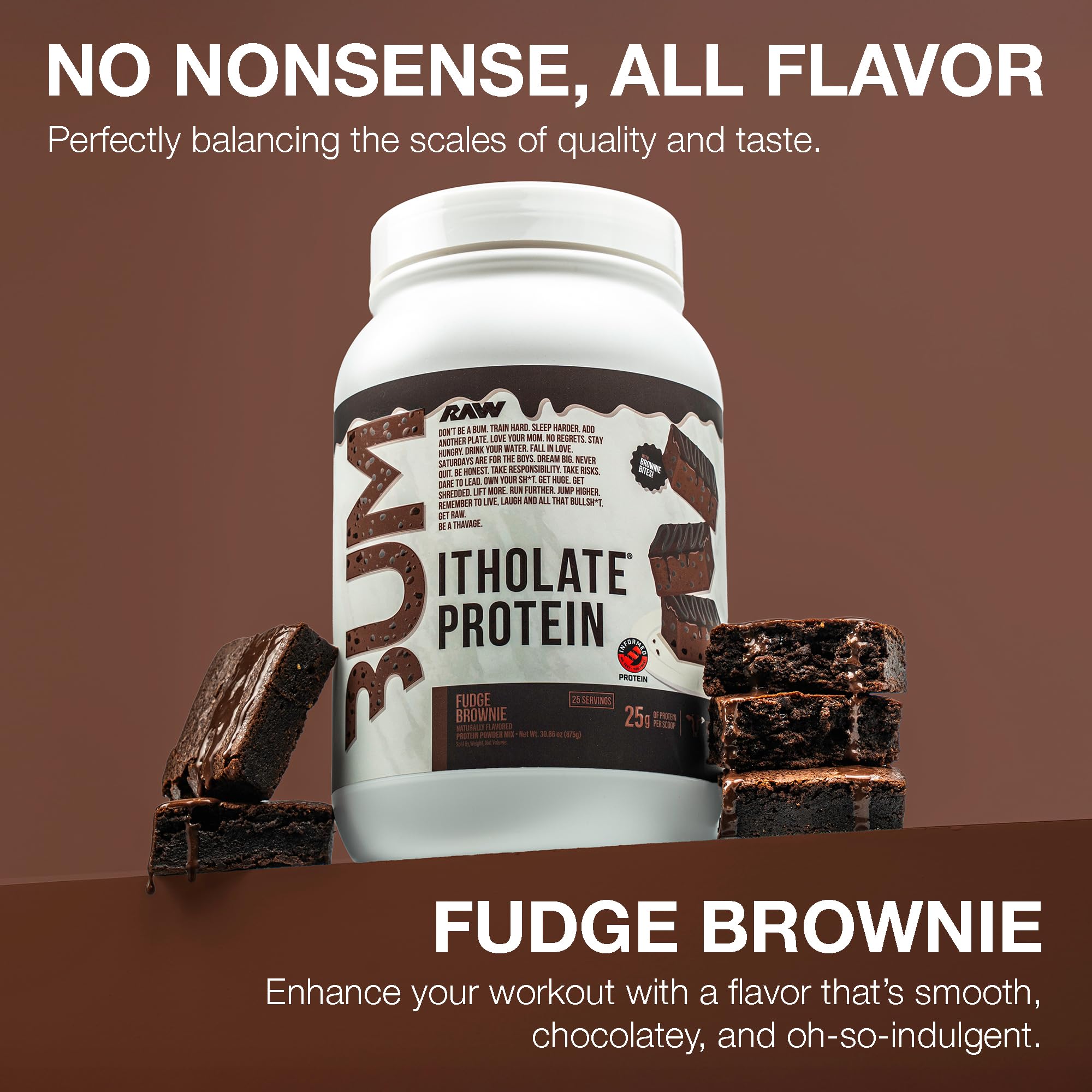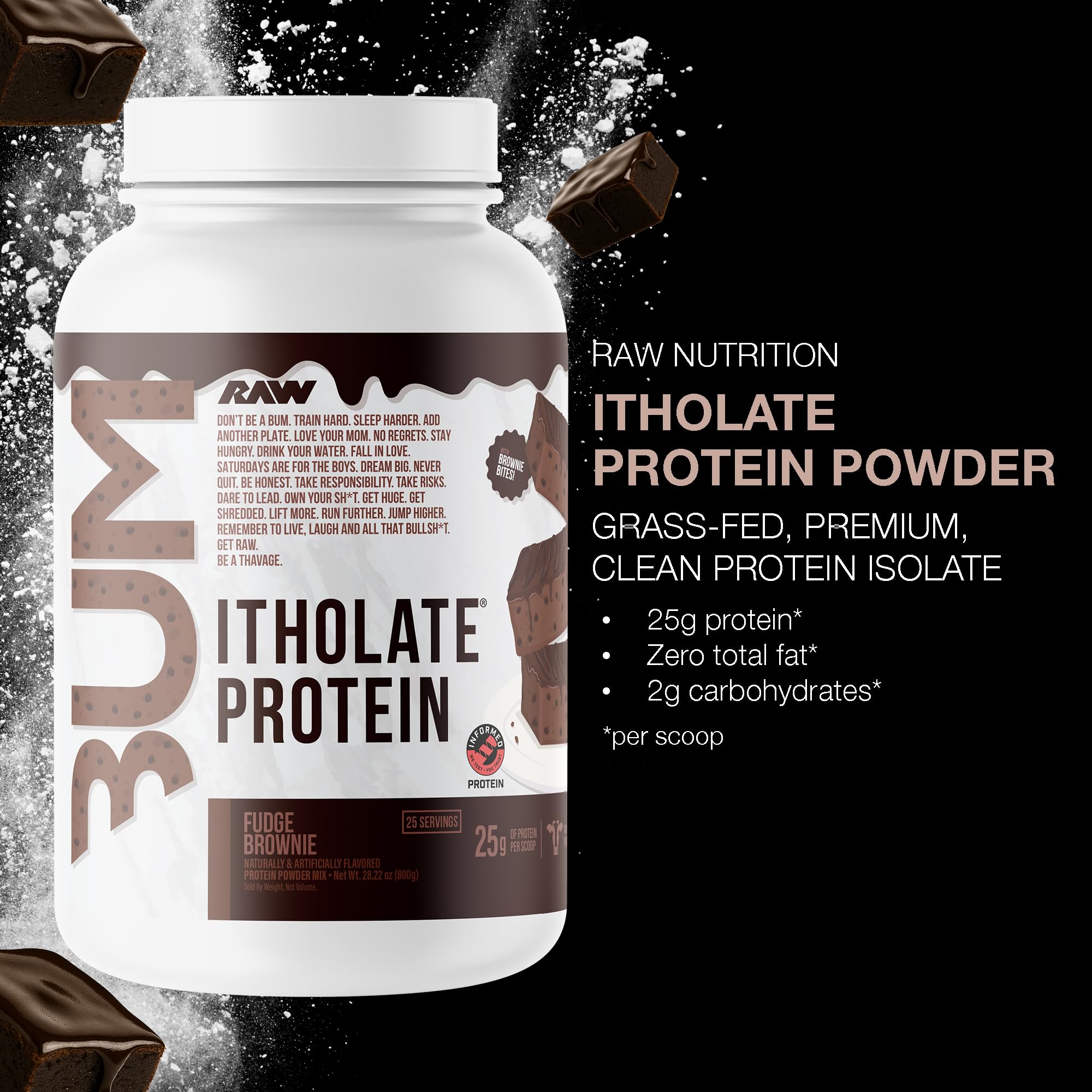 Fudge Brownie Itholate Protein Powder: RAW Nutrition’s Itholate Protein is a clean, premium protein powder that delivers all the essential amino acids your body needs to support muscle growth and repair. Each serving is packed with 25g of the highest quality protein to make sure you're reaching maximum potential. 25 servings, 2.25 lbs.