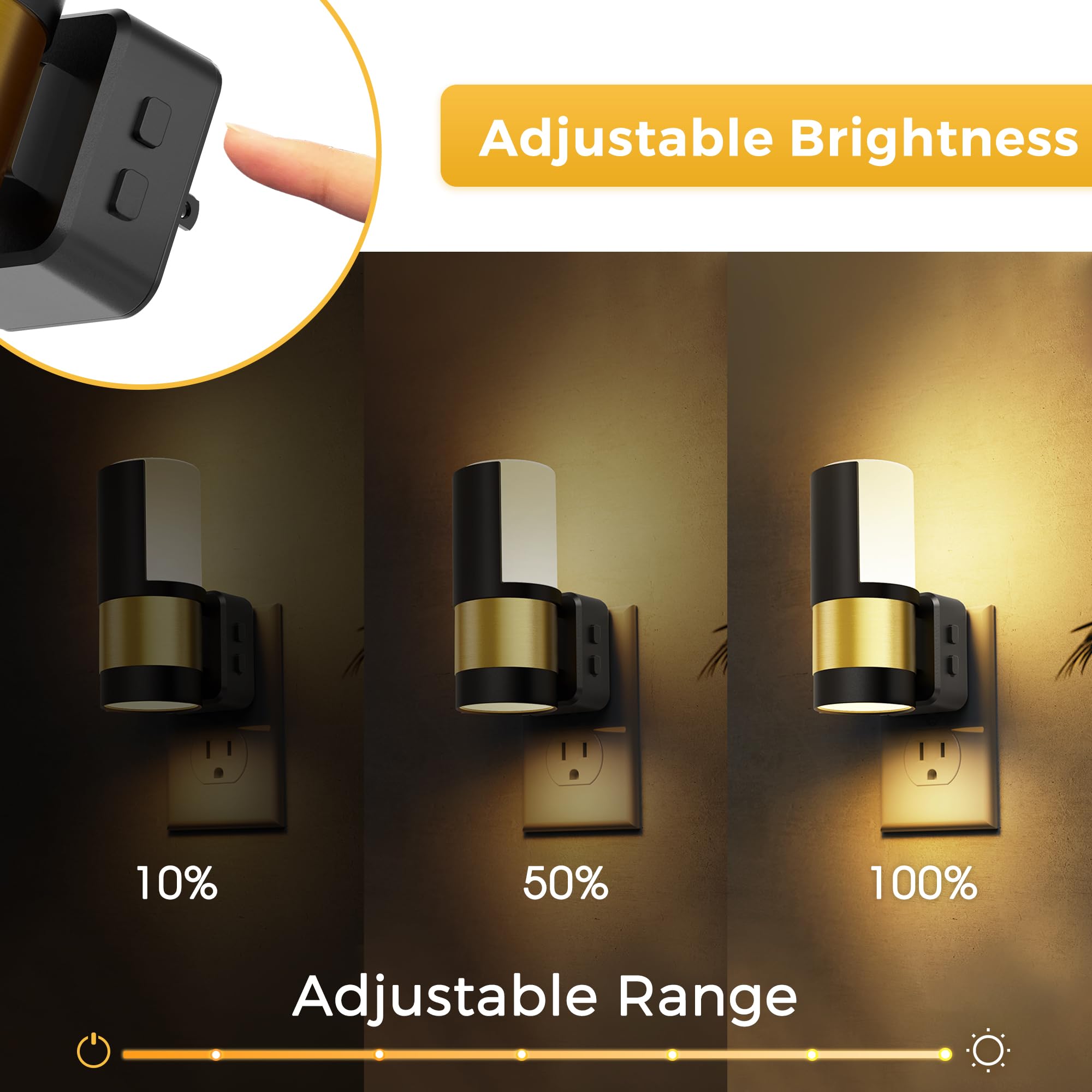 Dimmable Night Lights Plug into wall: By pressing the button above, you can select from three color temperatures: Amber 1600K, Soft White 3000K, and Daylight White 5000K. Short-press the button below to select from three brightness levels: 10%, 50%, and 100%.