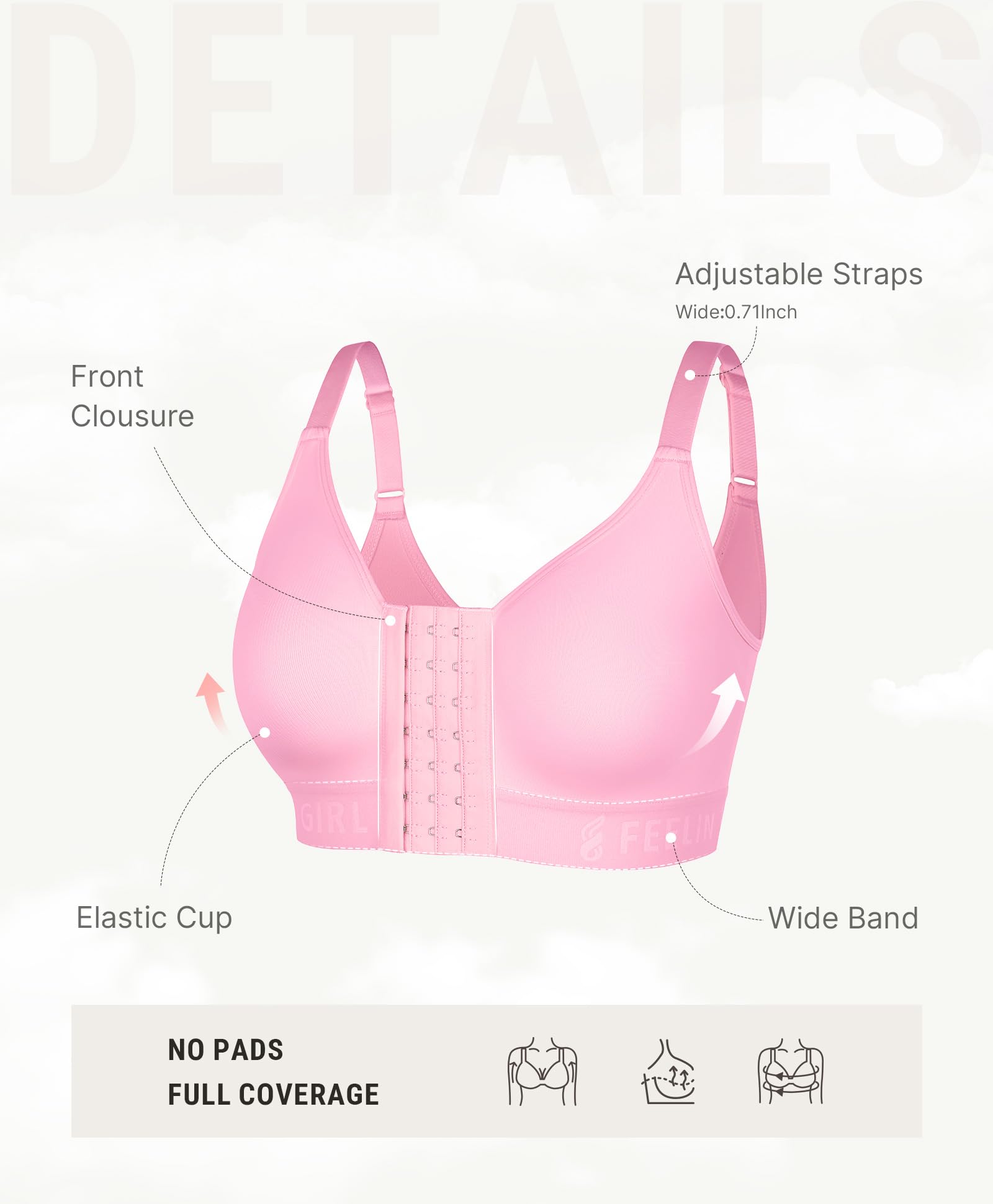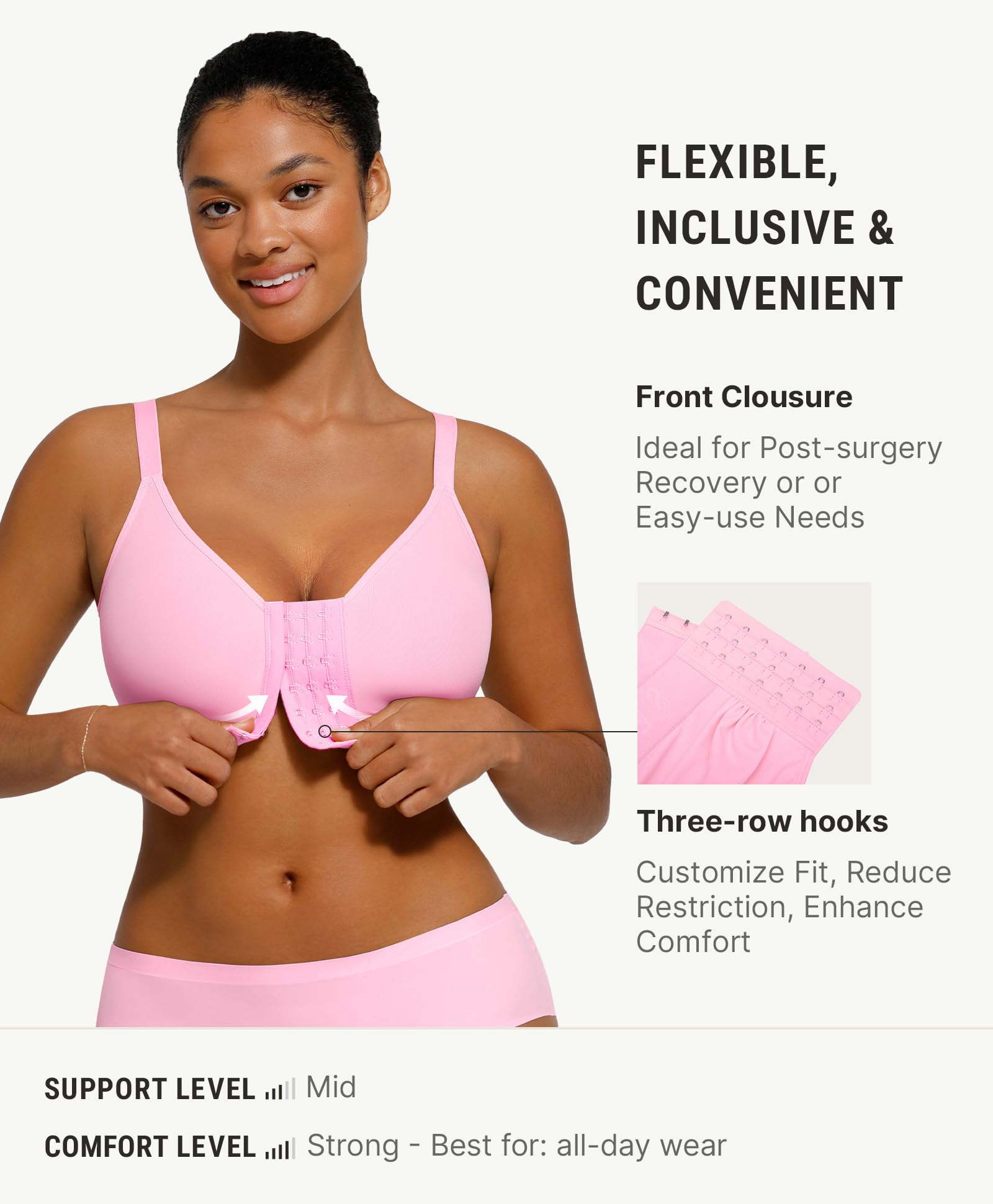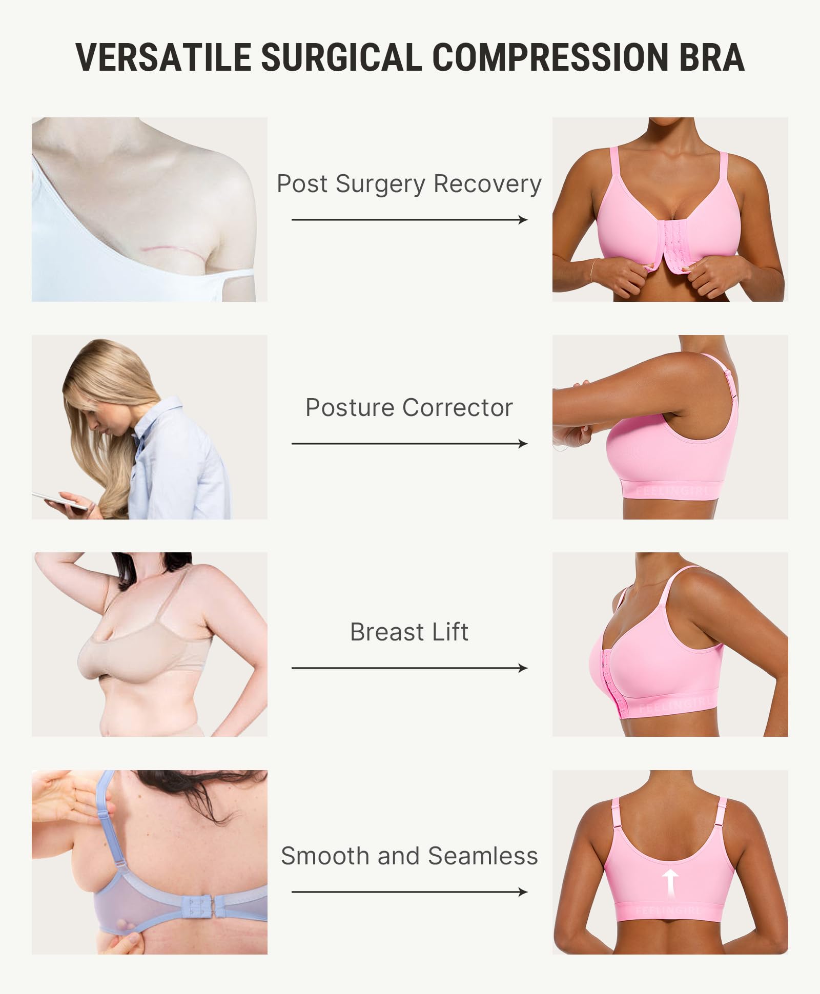 ADJUSTABLE FRONT CLOSURE BRAS FOR WOMEN: This post surgery compression bra blends style and support. With comfortable adjustable shoulder straps, it allows you to customize compression levels as needed. Multiple front closures and easy-access design let you adjust compression as you heal, easy wear and removal, facilitating postoperative examinations. This mastectomy bra ensures smooth recovery and lasting comfort.