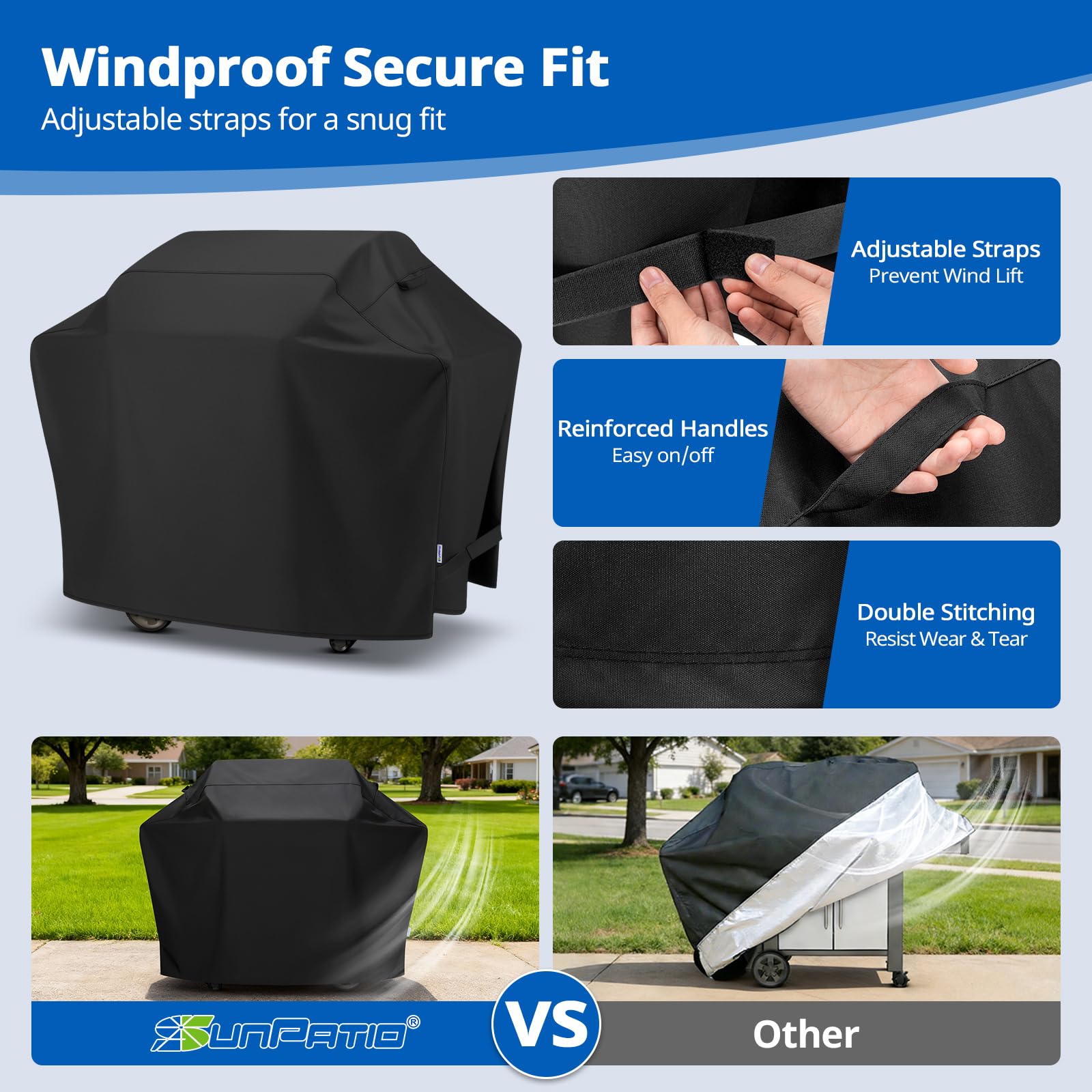 Adjustable Fastening Straps - Two fastening straps at side of the gas grill cover are easy to attach and detach, can be adjusted for a proper fit and keep cover securely in place to prevent the grill cover from blowing away in windy days.