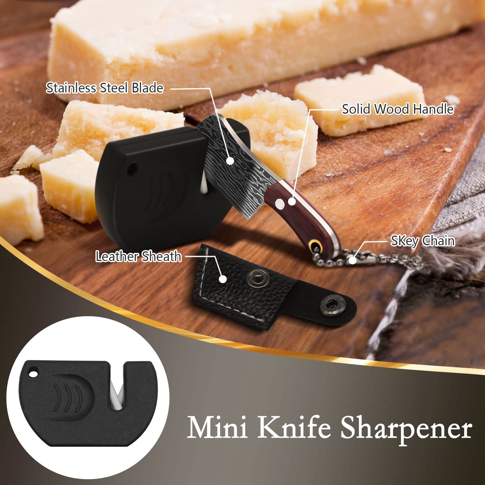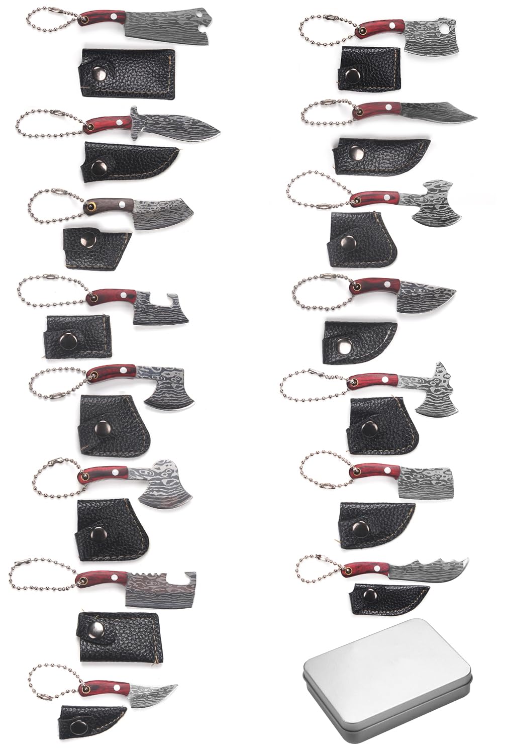 Affordable Set:You will get 6 mini knife keychain in different shapes, each with a sheath and chain. 1 Exquisite mini knife sharpener. 1 Tin box to store them. same quality, same price, we have one more mini sharpener than the same product