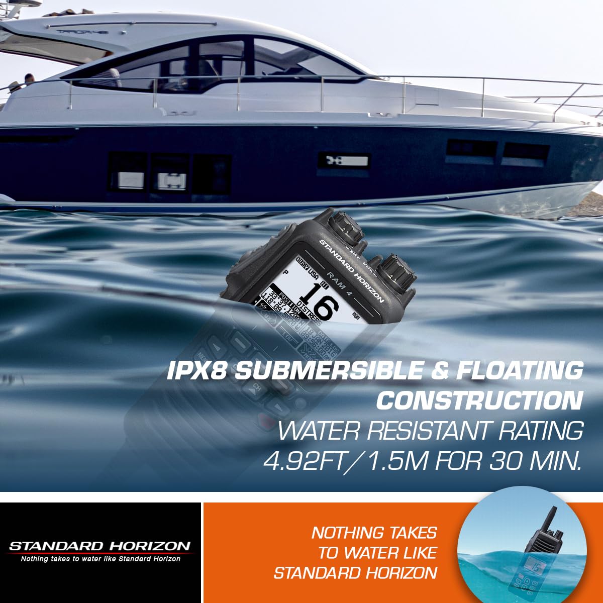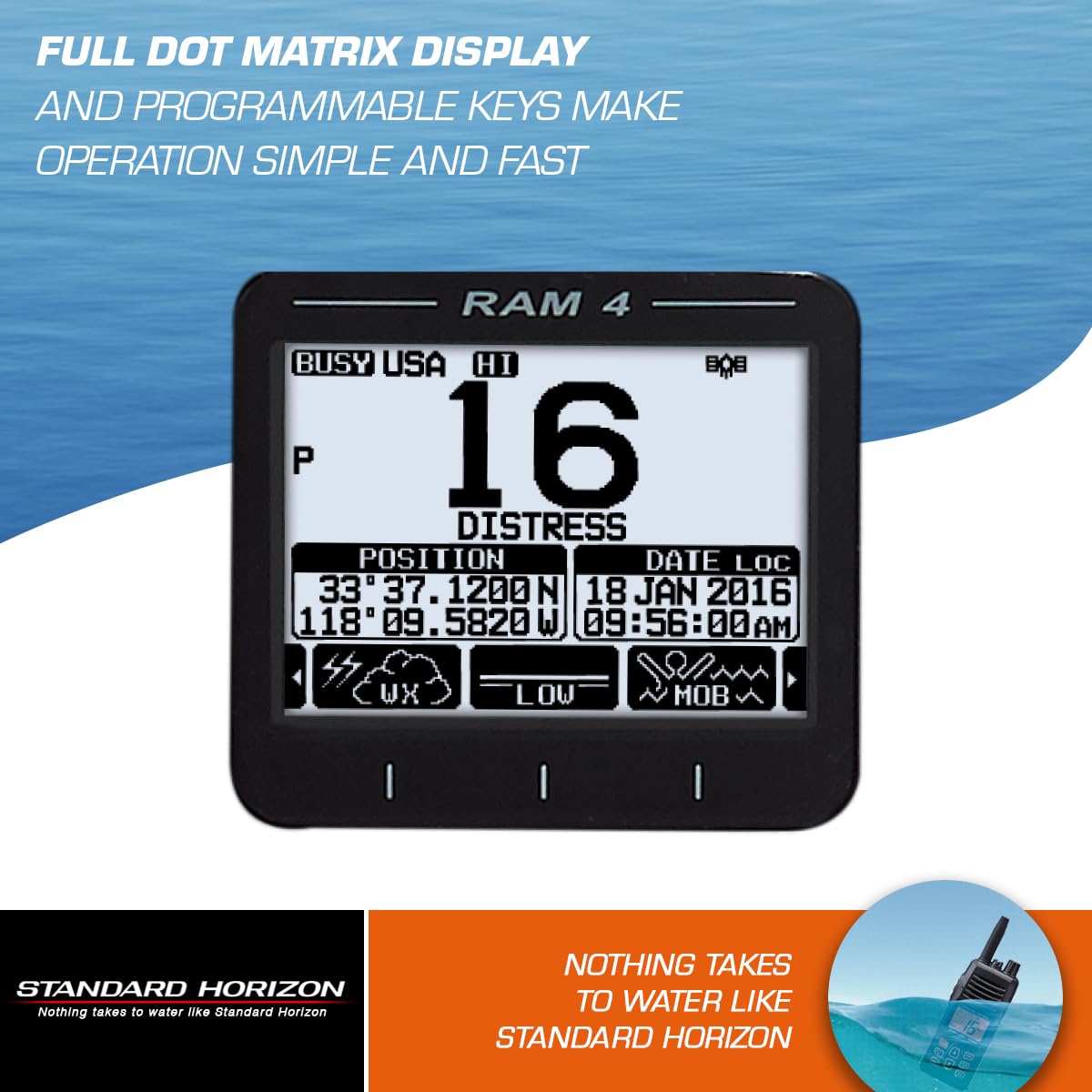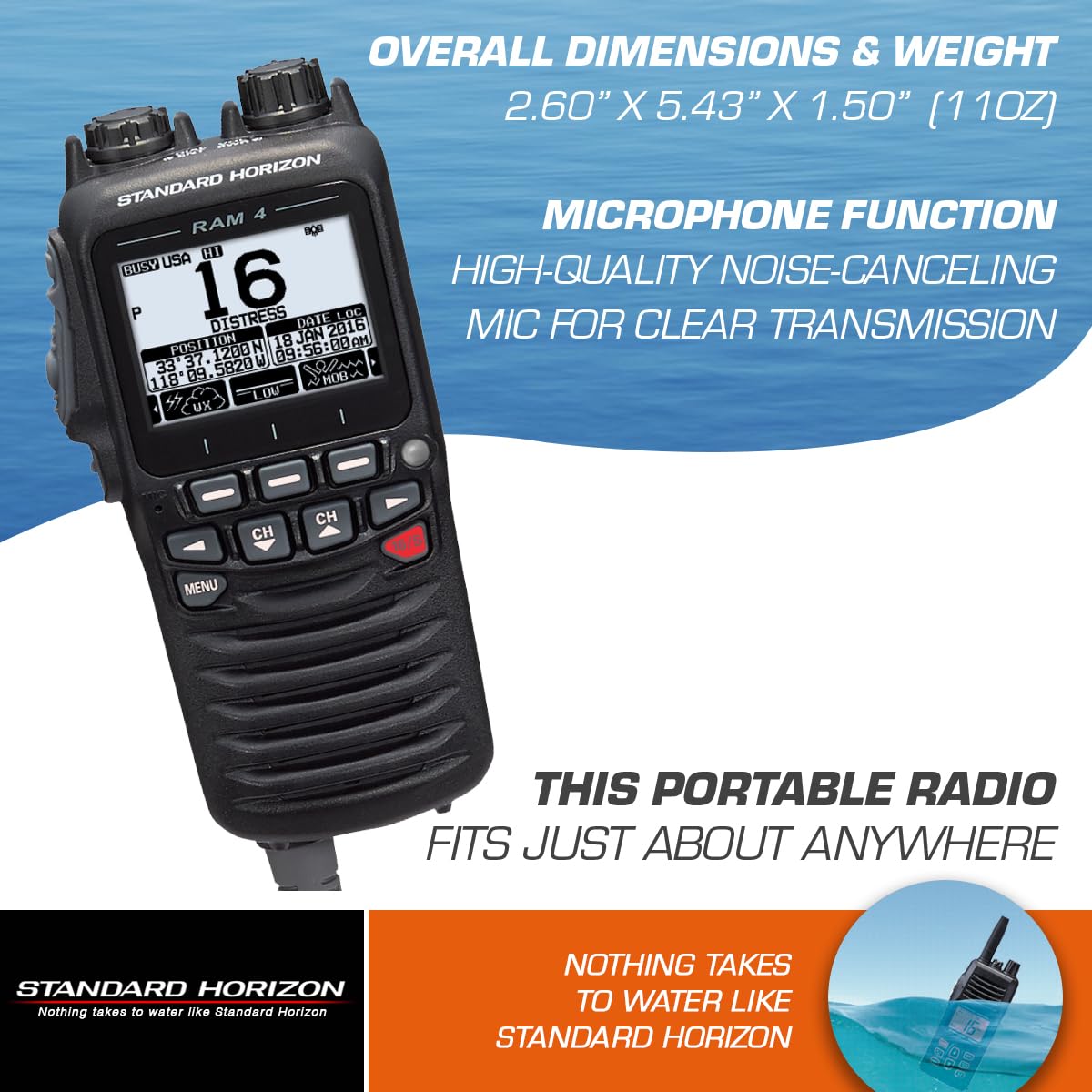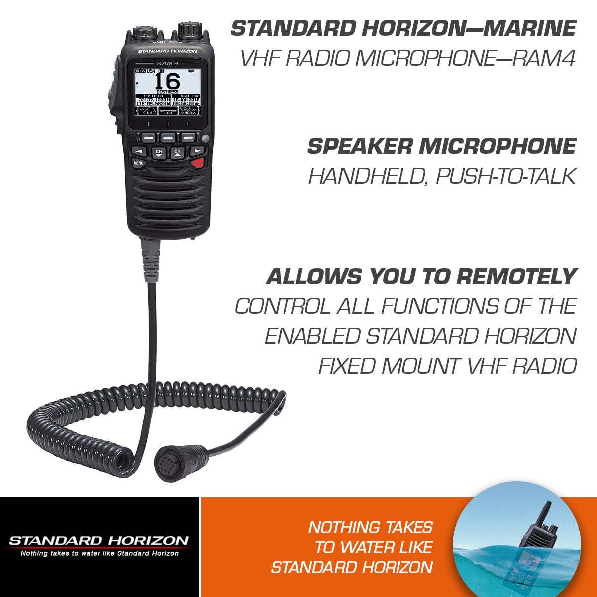 The Standard Horizon SSM-70H (RAM4) is a 2.5-inch wired remote access microphone in black. It enables full control of compatible VHF radios from remote boat locations.