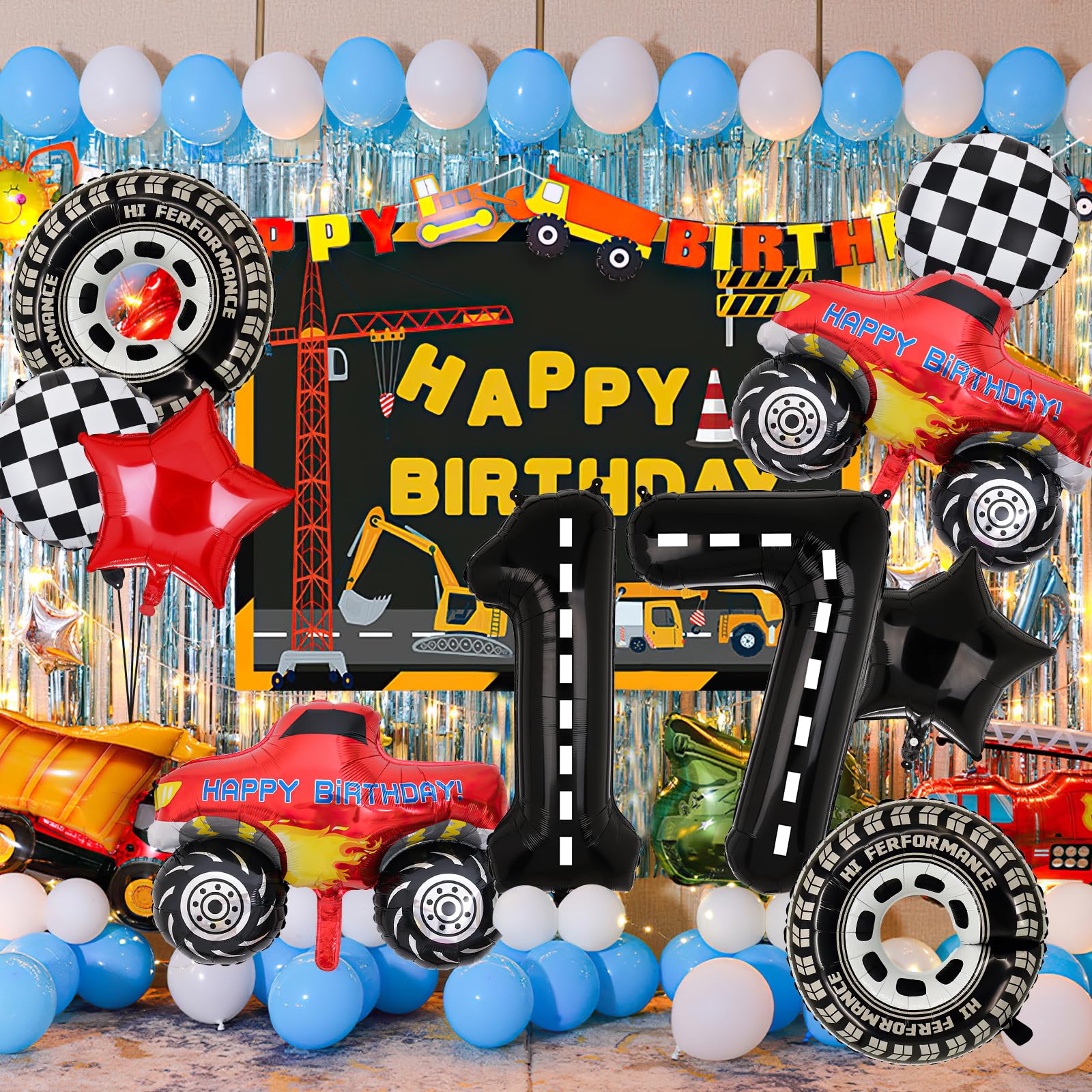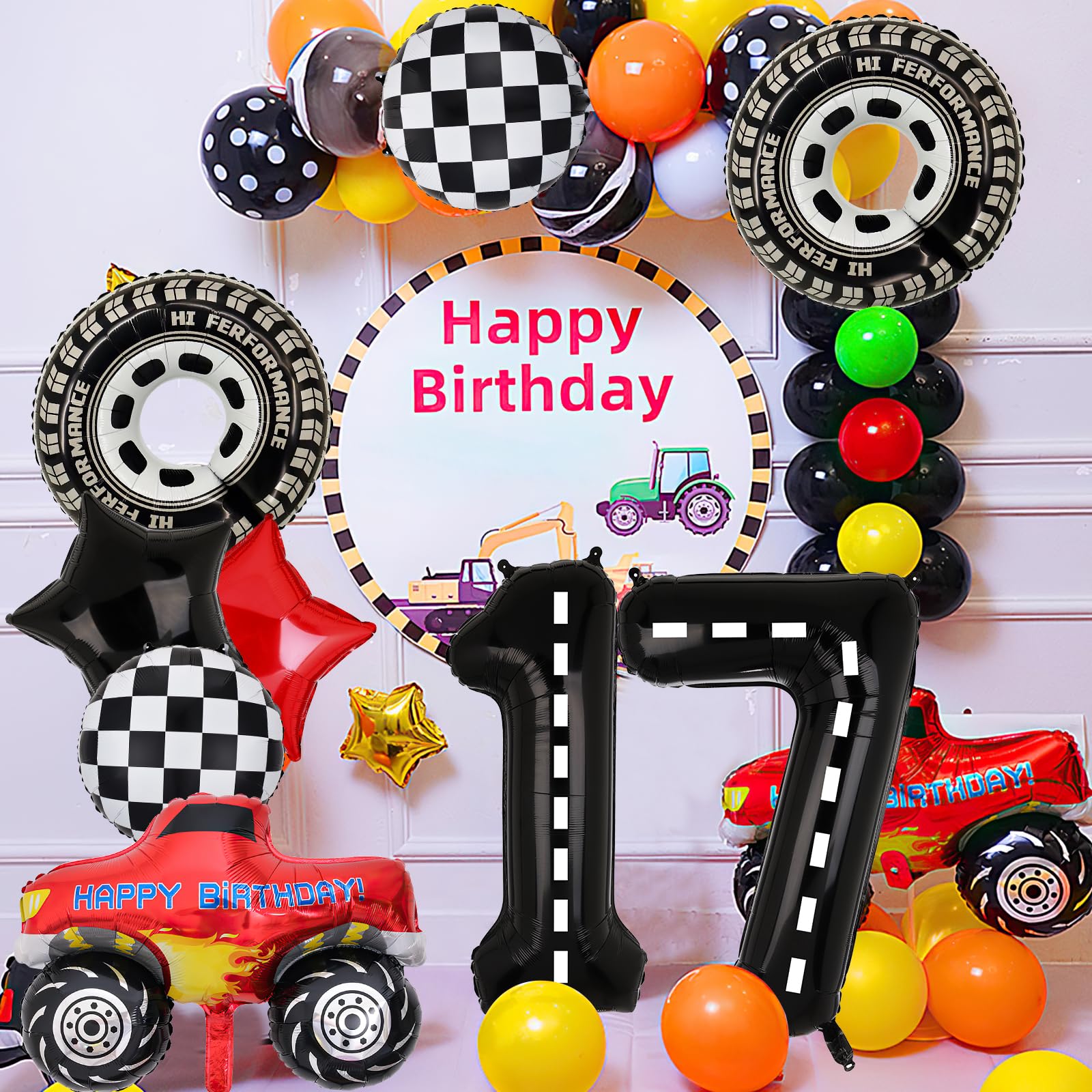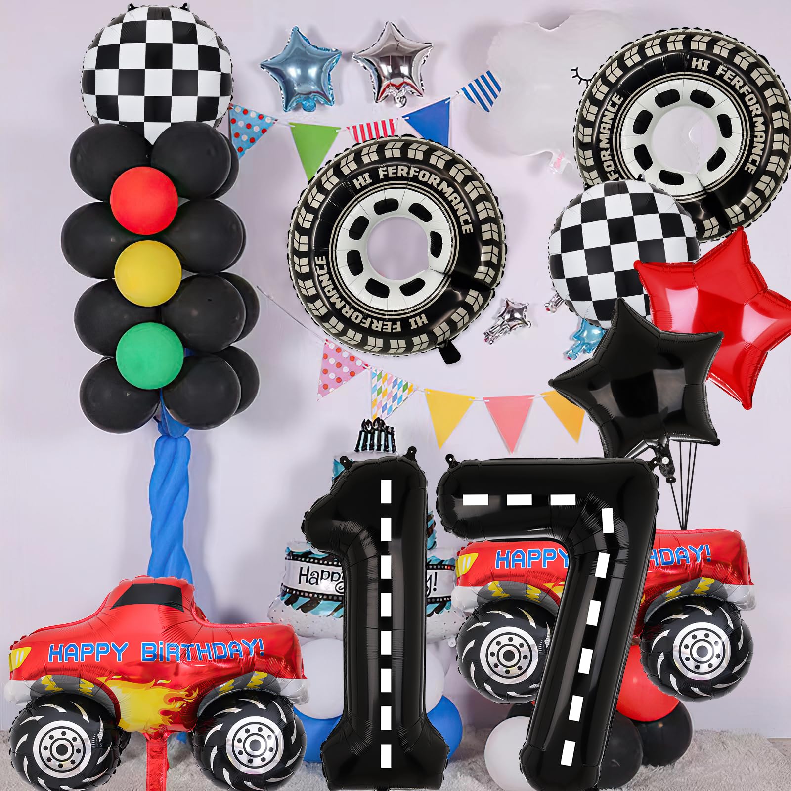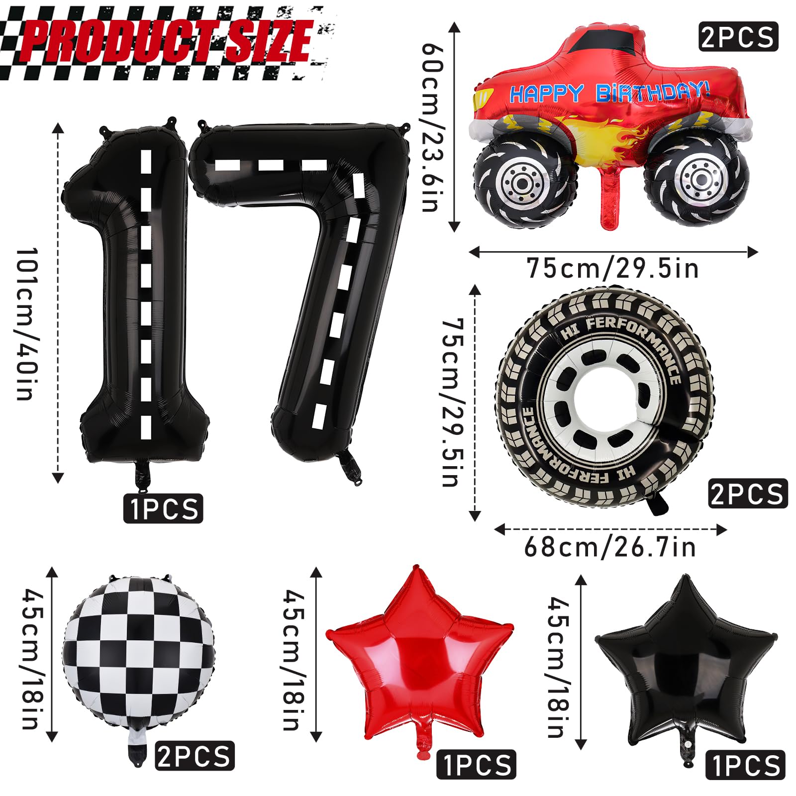 Package Included: 2PCS Giant Size Truck Foil Balloon, 2 pcs tire wheel balloon,2pcs Round Racing Foil Balloons, 18" Red and Black Star Balloons, 2PCS 40" 17 Number balloon.Totally 10PCS. Perfect for a Truck Racing Car Theme Party.
