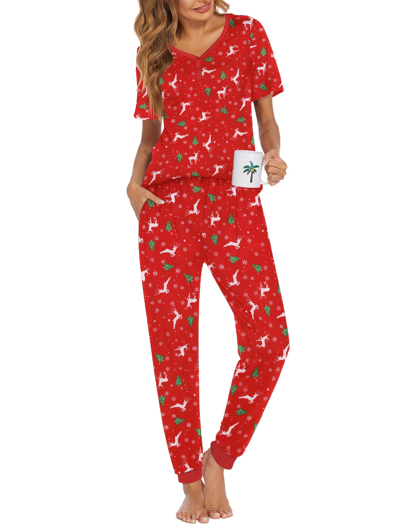 Short Sleeve Tops: The sleepwear pj features with v-neck and button tops. Simple pullover styling for easy fit. Stylish and elegant ladies sleepwear night set