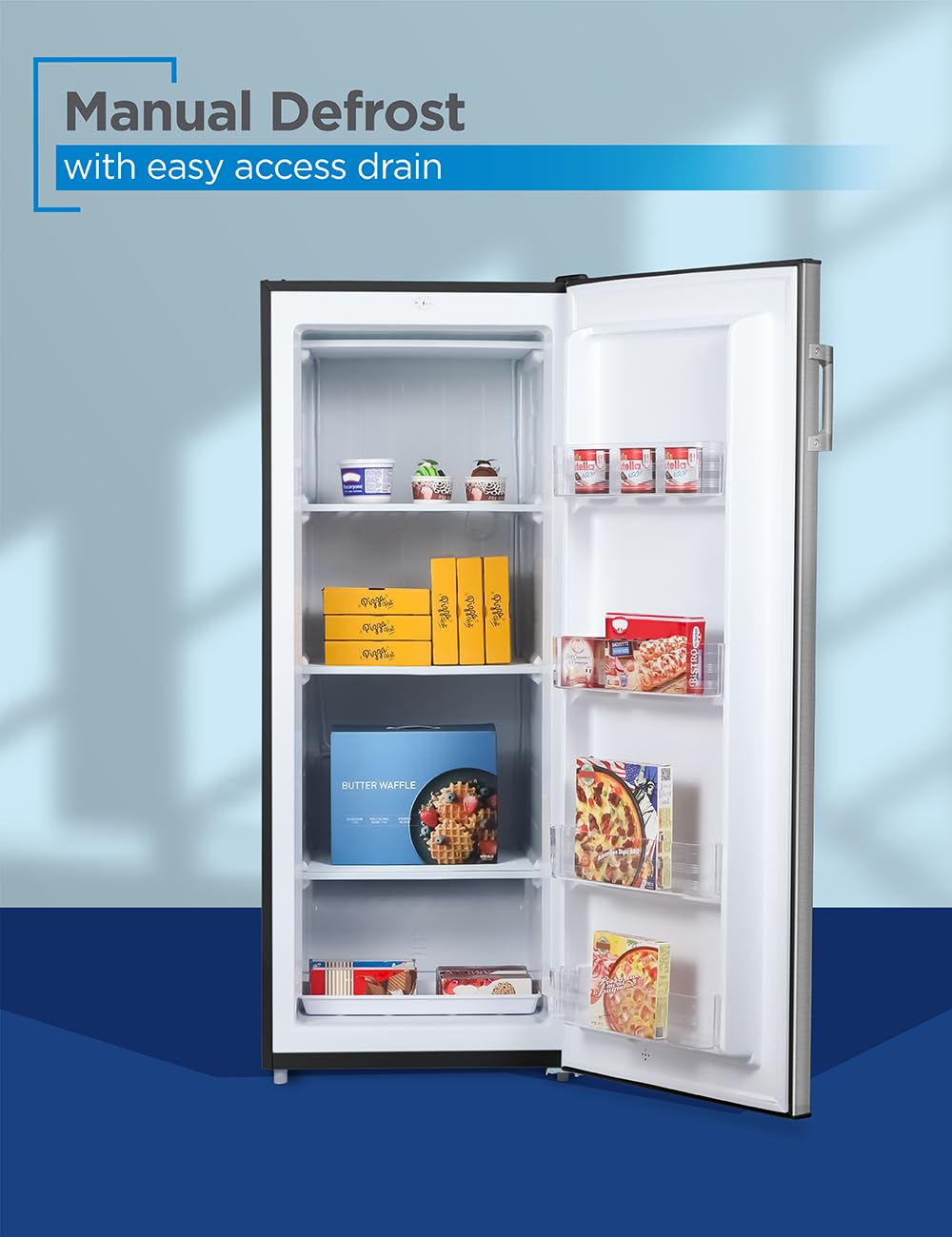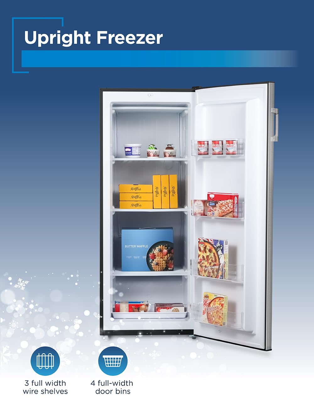 Efficient Storage Solutions: Featuring 3 full-width freezer shelves and 4 door bins, this standing freezer upright provides organized storage and easy access to your frozen items
