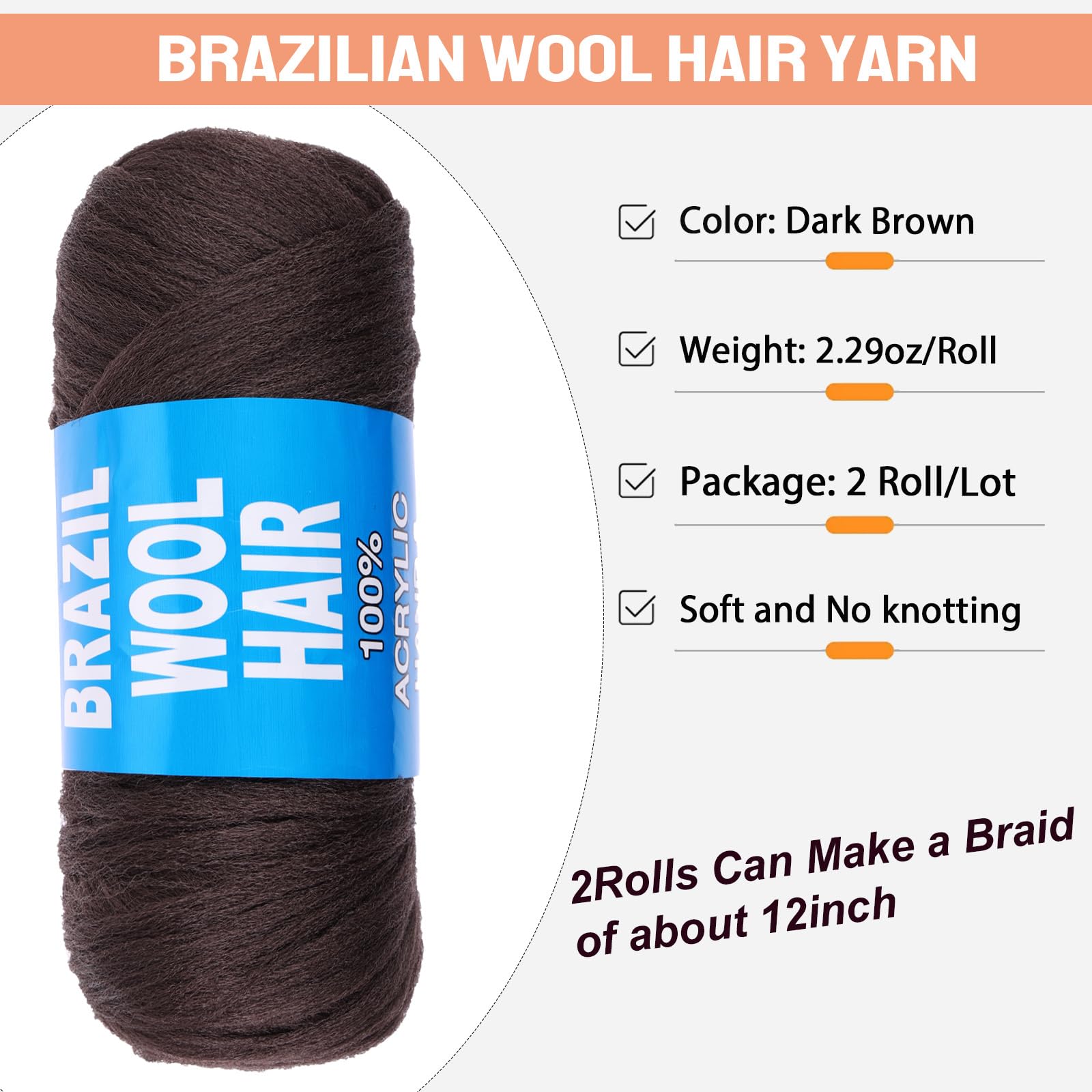 【Material & Advantage】:Brazilian Wool Hair Yarn Acrylic Hand Knitting very light in weight, soft and easy to install, natural glossiness,silky texture just like your own hair, does't harm the scalp. It's the first choice for hair braiding.