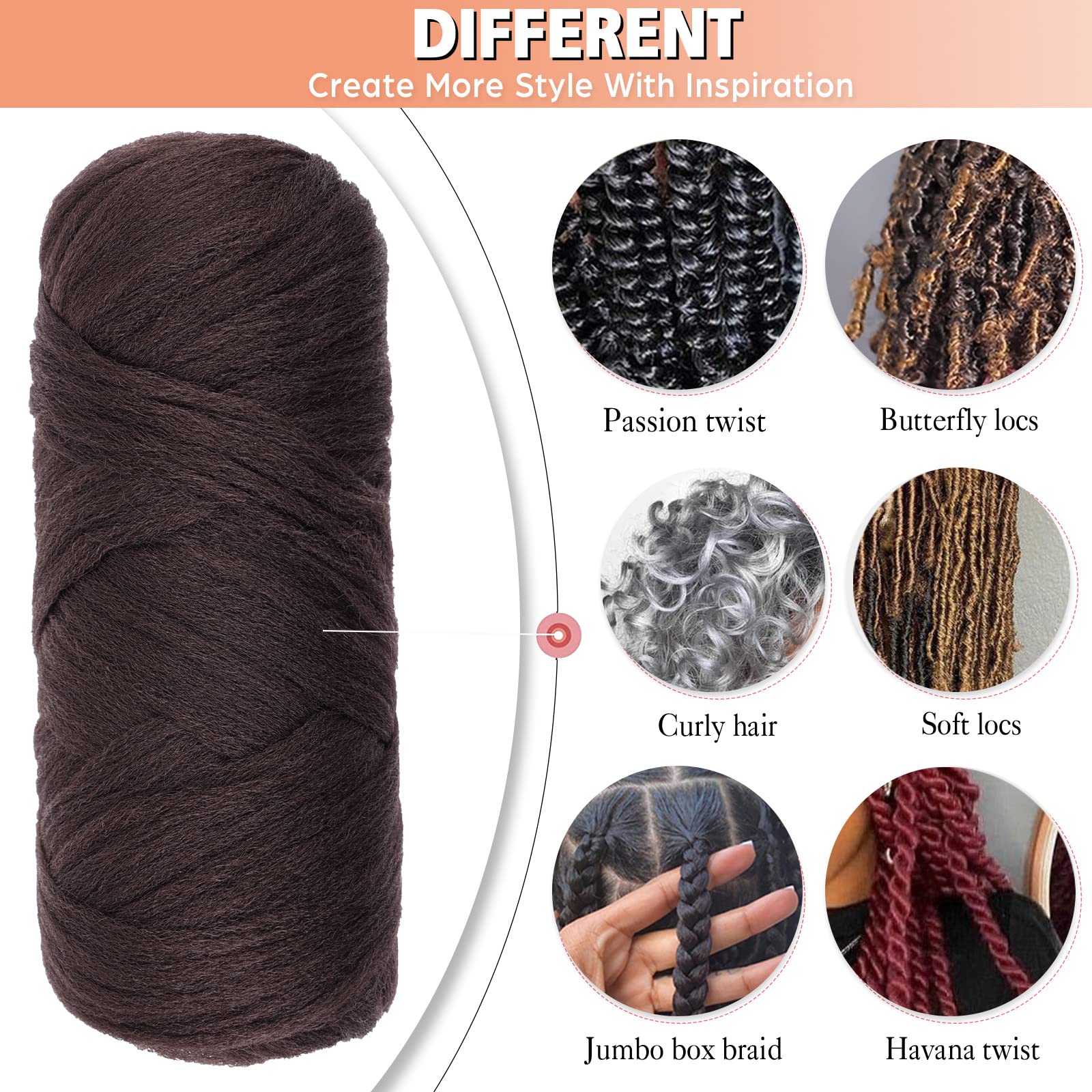 【Different Style】:Brazilian wool hair is the perfect material for hair braiding, African dirty braid, Senegalese Twists, Goddess Faux Locs Crochet Hair, Passion Twist, Koroba Braid Crochet Hair Dreadlock Extensions and so on, it does it all.