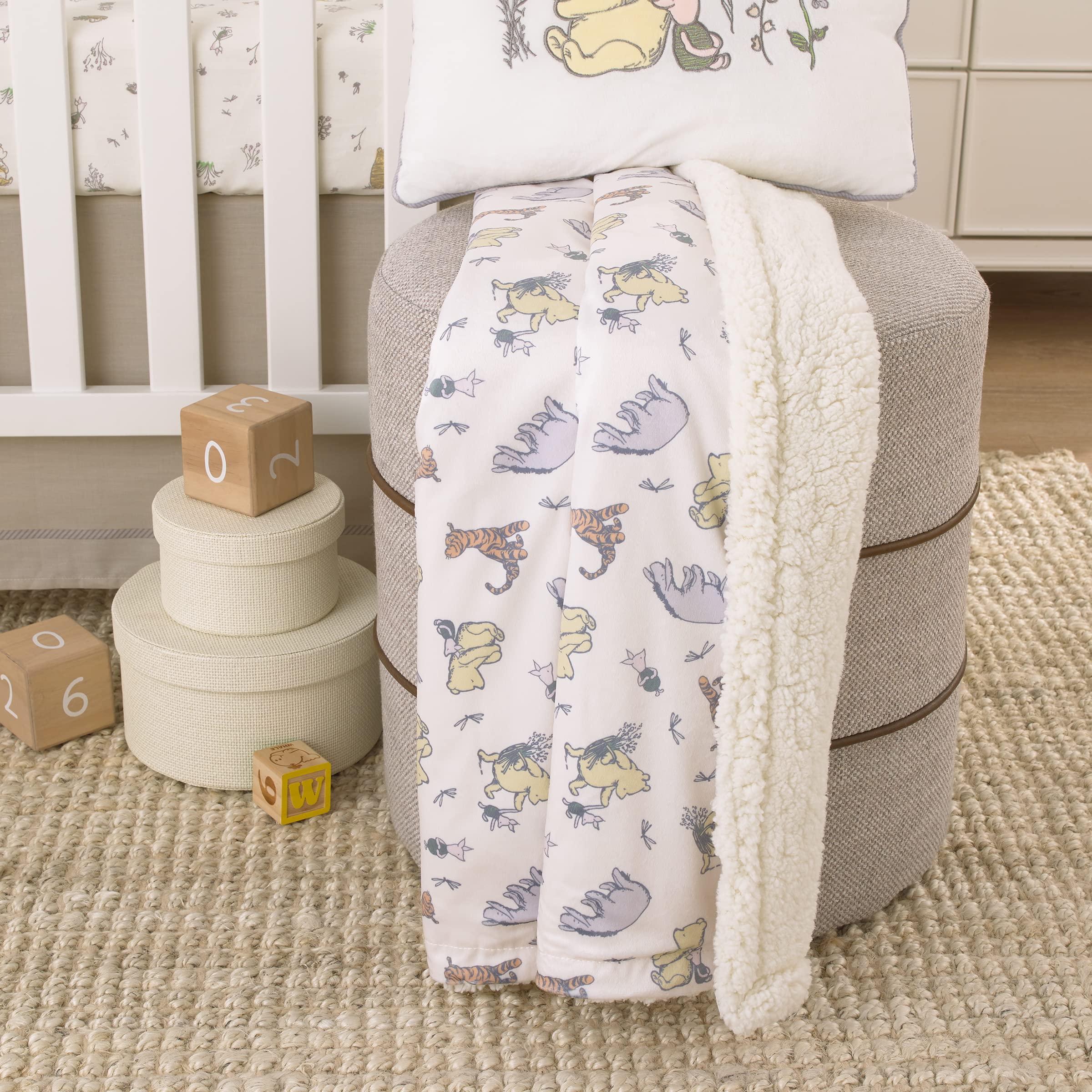 The Naturally Friends Sherpa Baby Blanket features Classic Pooh, Piglet, Tigger, and Eeyore