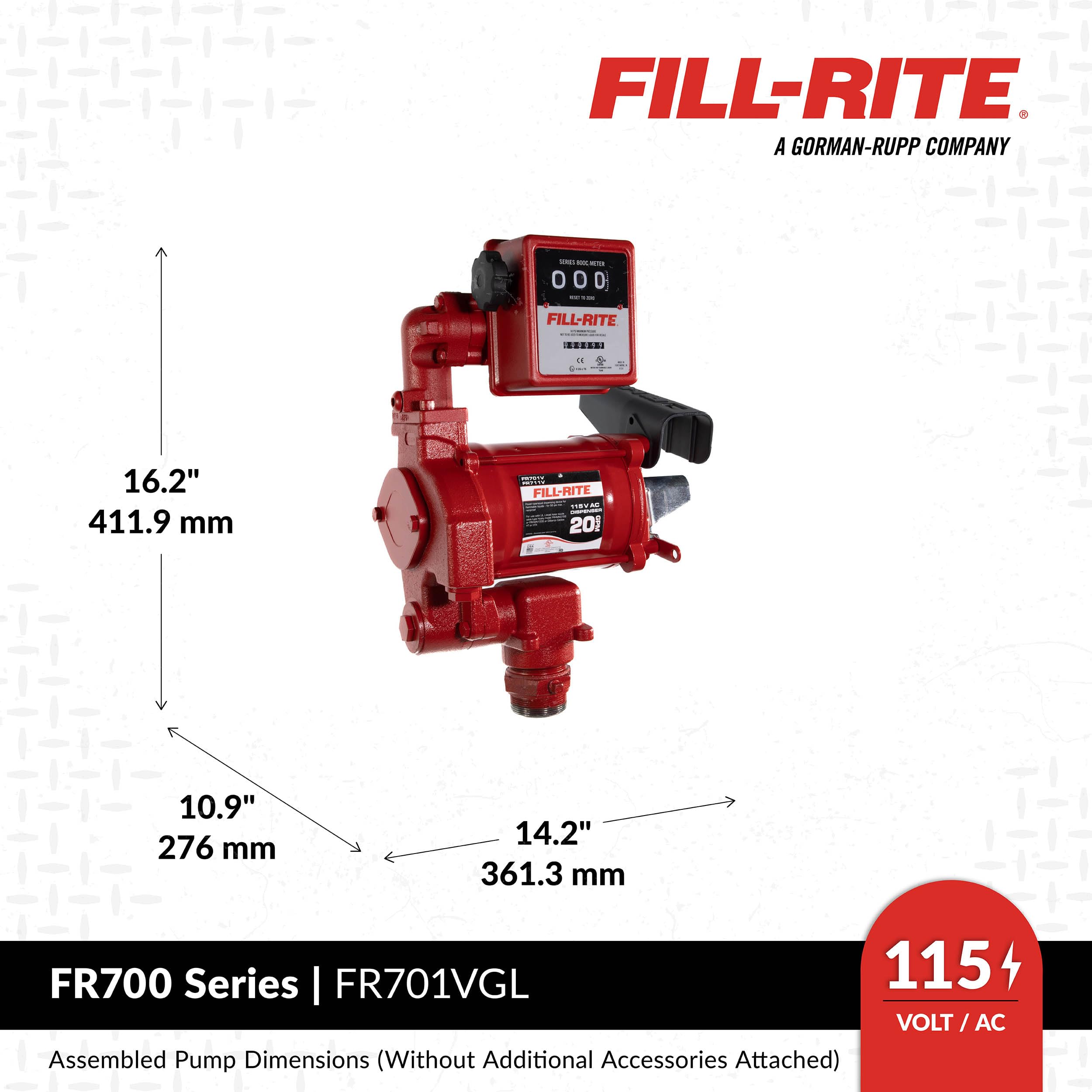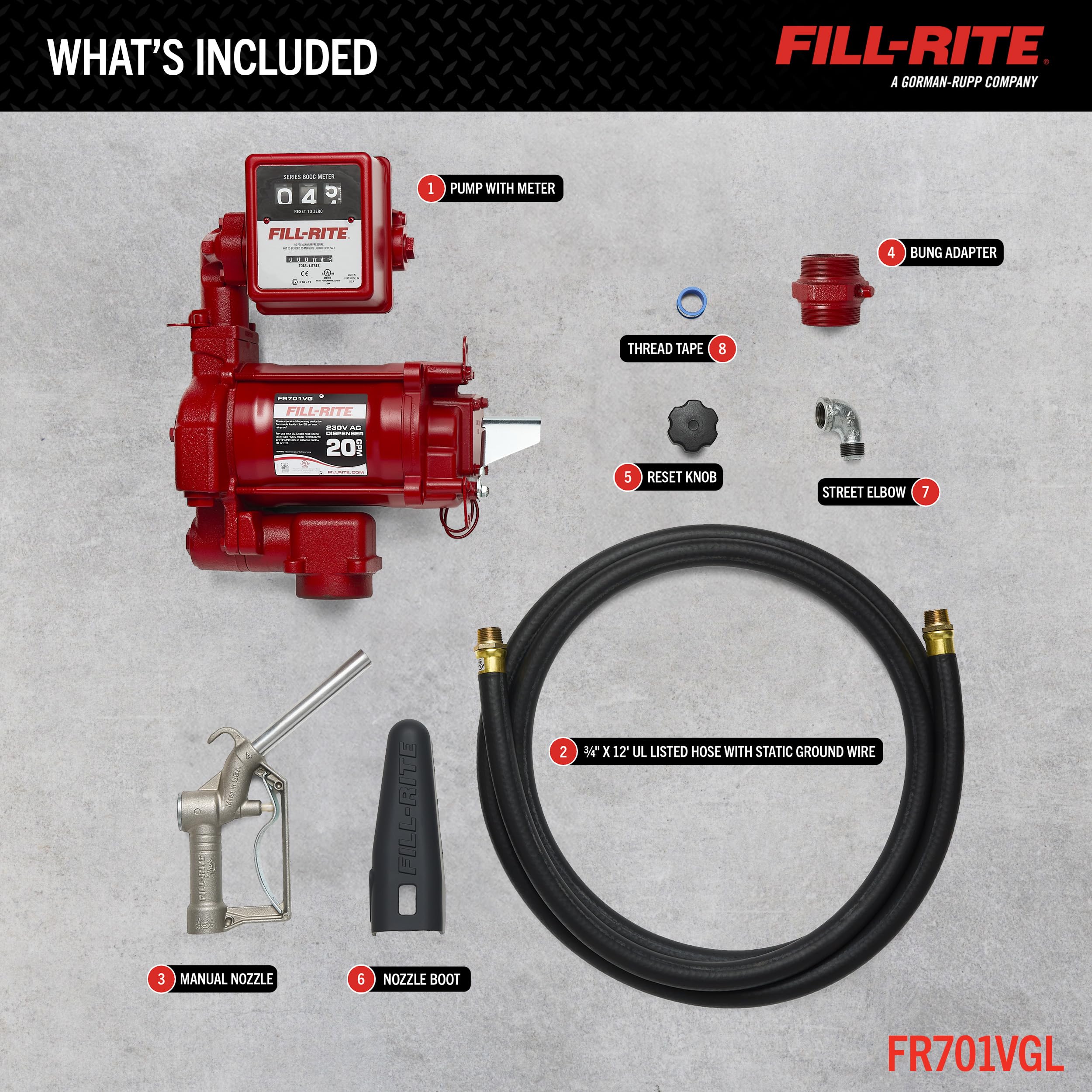 The FR701VGL model is a 230V AC, 75 LPM, heavy-duty fuel transfer pump. This pump and accessory bundle comes complete with a 807CL meter, 3/4" x 12' hose, 3/4" manual nozzle, and installation components. This is an authentic product from the trusted Fill-Rite® brand. It's made in the USA with globally sourced materials and built for quality, reliability, and safety.