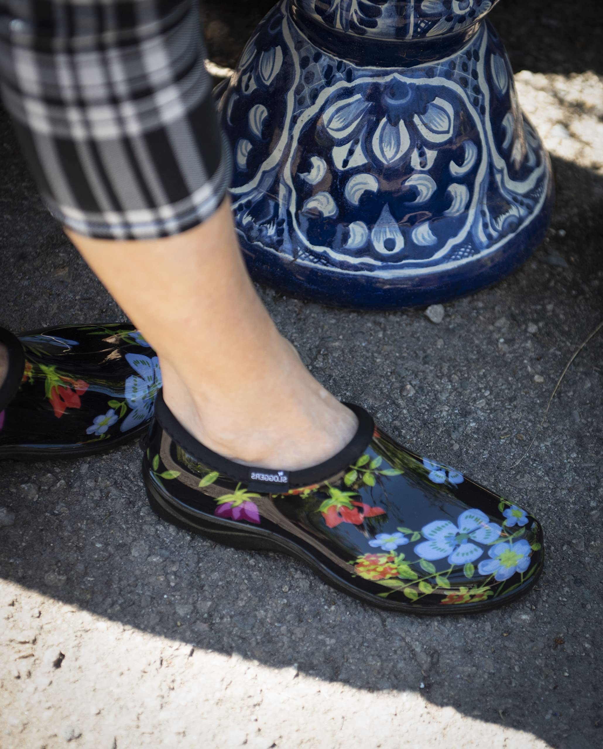 Description Product Description Designed with a honeycomb heel section that not only reduces weight, but also adds a spring to your step. Sloggers clogs, shoes, ankle boots and rain boots come with “All-Day Comfort” premium insoles to keep your feet supported all day. Sloggers signature deep lug tread provides the same stability and support as a real work boot. Made with 90% recycled material. Sloggers are easy to care for and clean. Hose them off or wash off in the sink. Remove insole to airdry. Amazon.com Cultivate all the enjoyment you can from your garden in the Midsummer garden shoe from Sloggers. Brilliant floral design meets mud- and puddle-proof construction so you can get out there after a refreshing spring shower and stay decidedly un-soggy. A low-cut ankle offers range of motion for easier kneeling and squatting as you work the soil. From the Manufacturer Women's Garden Shoe Midsummer, 6, (Black), Ea.