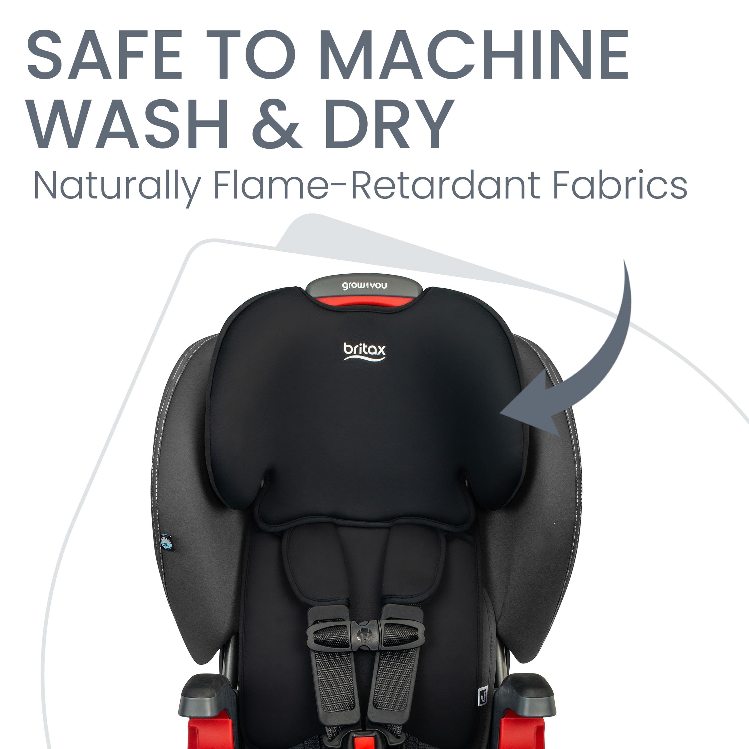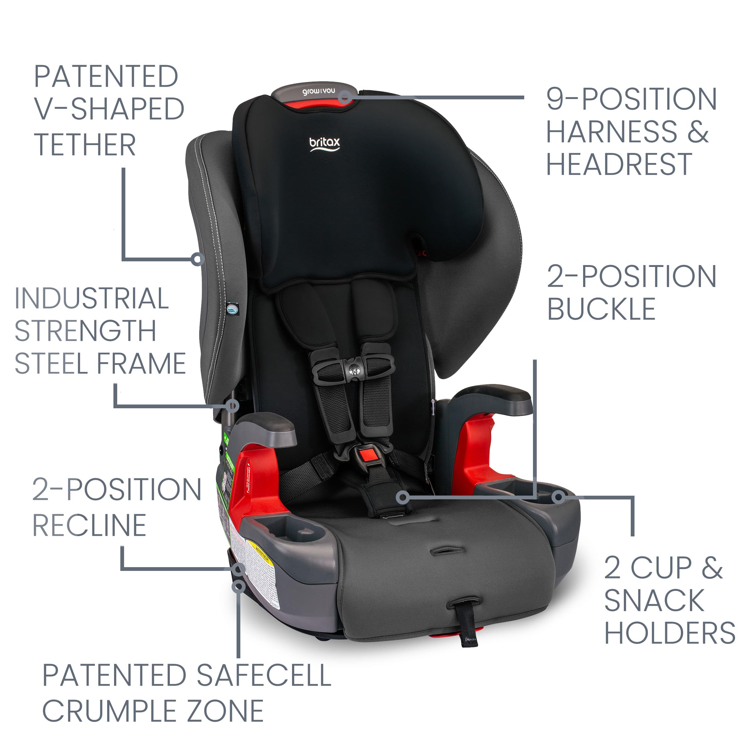 Find a car seat that grows with your child from toddler to big kid age with the Britax Grow With You(TM) harness-2-booster car seat. This high back booster seat starts as a 5-point harness car seat and converts into a belt-positioning booster that works with your car's seat belt. Installing this toddler car seat is simple using the premium, quick-push LATCH connectors. Quickly adjust the 9-position harness and headrest using just one hand for the proper fit as your child grows. Once they’re ready to use the seat belt, the 5-point harness tucks away, transitioning the seat to a belt-positioning booster. The color-coded belt guide helps you and your child route the seat belt through the right paths for a secure fit. This forward facing car seat is made with naturally flame-retardant fabrics and foam that are safe to machine wash and dry. SafeCell(R) Technology in the base acts as a crumple zone for additional protection for your growing child. This booster features armrests, 2 cup holders and stay-put harness pads, so even big kids enjoy the ride.