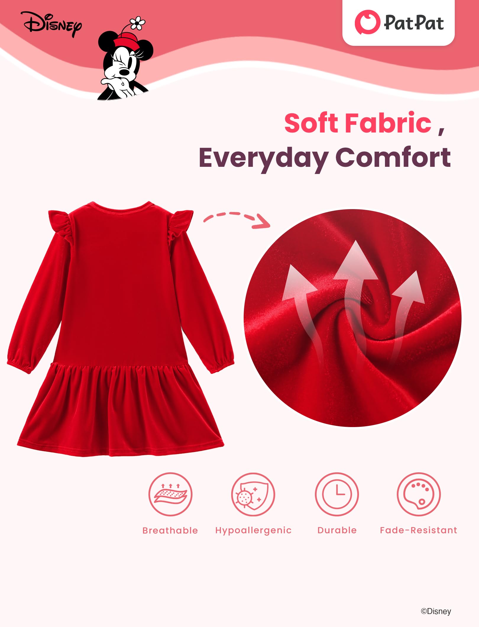 Soft and Durable Fabric: Crafted from soft, high-quality red velvet, this dress is comfortable and gentle on your child’s skin, ensuring all day wearability. The fabric is durable enough for everyday wear, resistant to fading and wrinkling, ensuring long-lasting comfort for toddlers in Disney toddler dresses