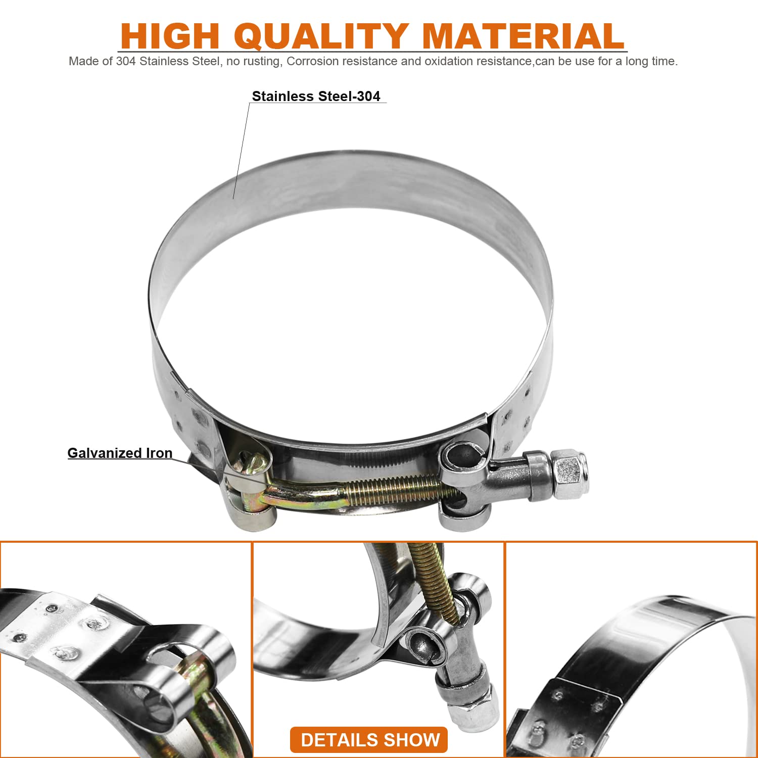 【High-quality material】 ---The T bolt clamp steel band is made of 304 stainless steel, and the material is color-plated zinc spring, smooth, burr-free and durable.