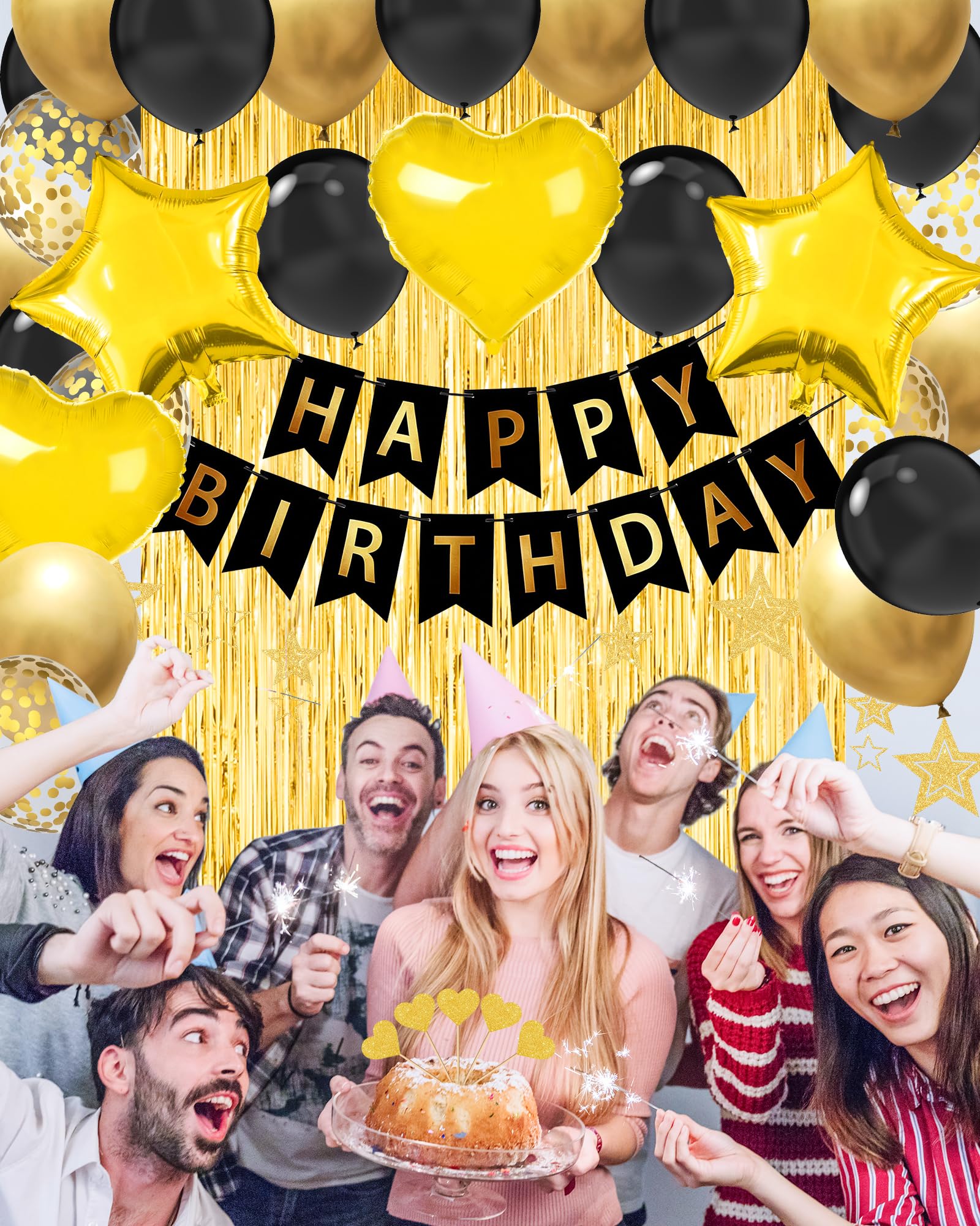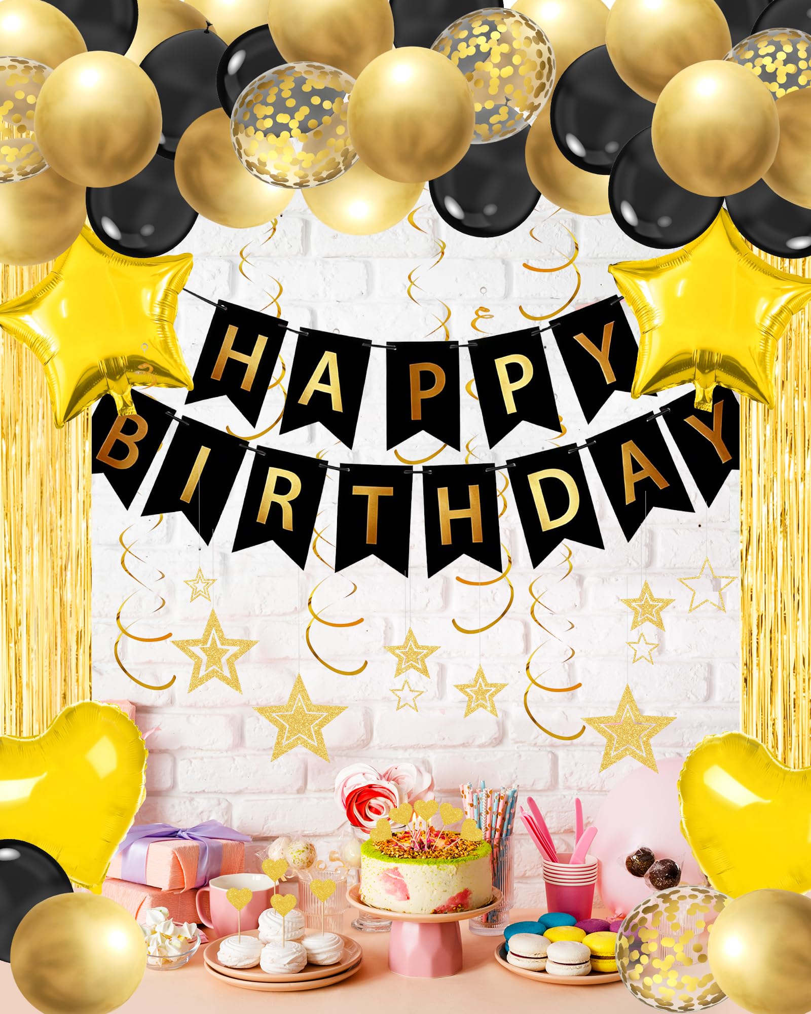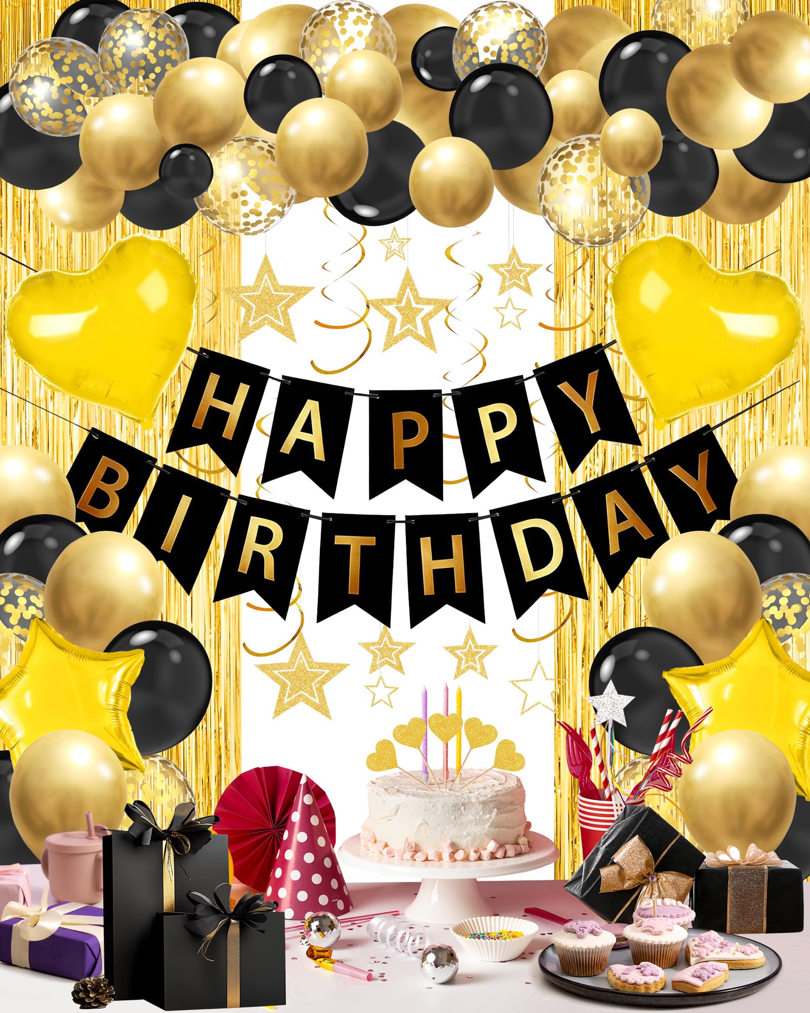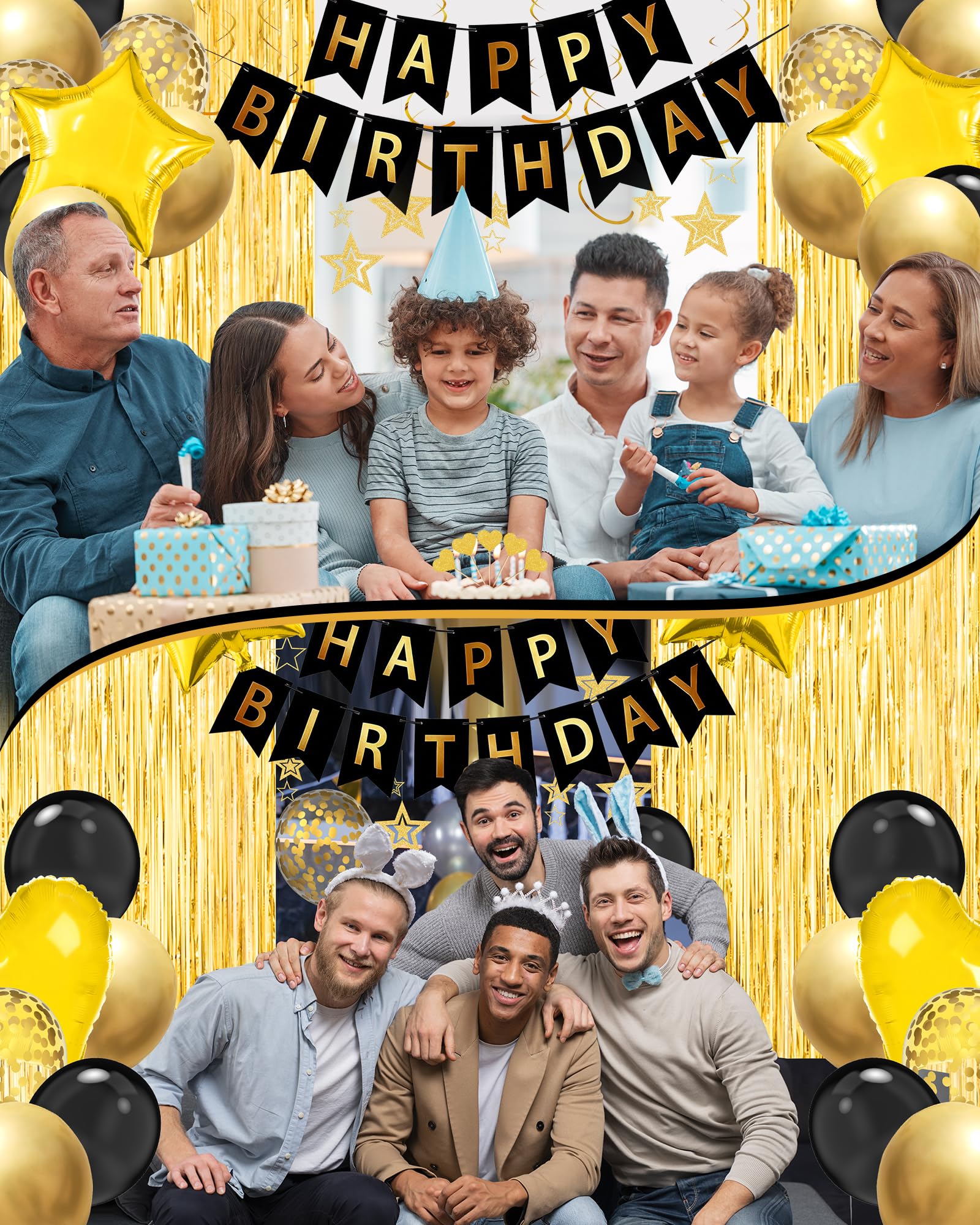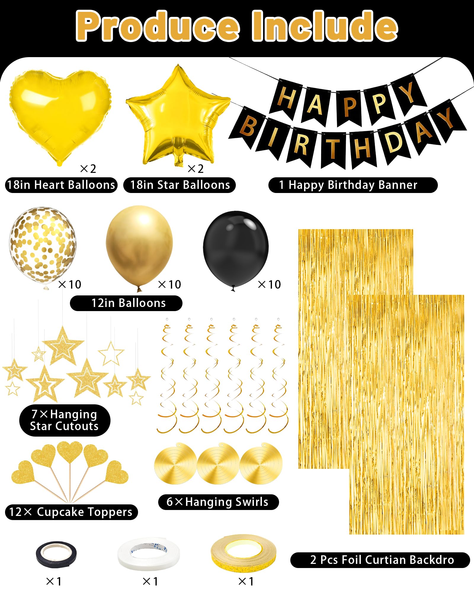 VALUE PACK: This golden birthday party decorations including all stuffs you need for boys and men birthday party: 1 string of Happy Birthday Banner, 2pcs 3.28*6.56ft Foil Curtain Backdrops, 20pcs golden and black latex balloons, 10pcs gold confetti balloons, 4 pcs heart and star shaped foil balloons, 6pcs golden hanging swirls, 7pcs glitter golden hanging stars, 12pcs cupcake toppers, 2pcs ribbon and 100 dot glue.
