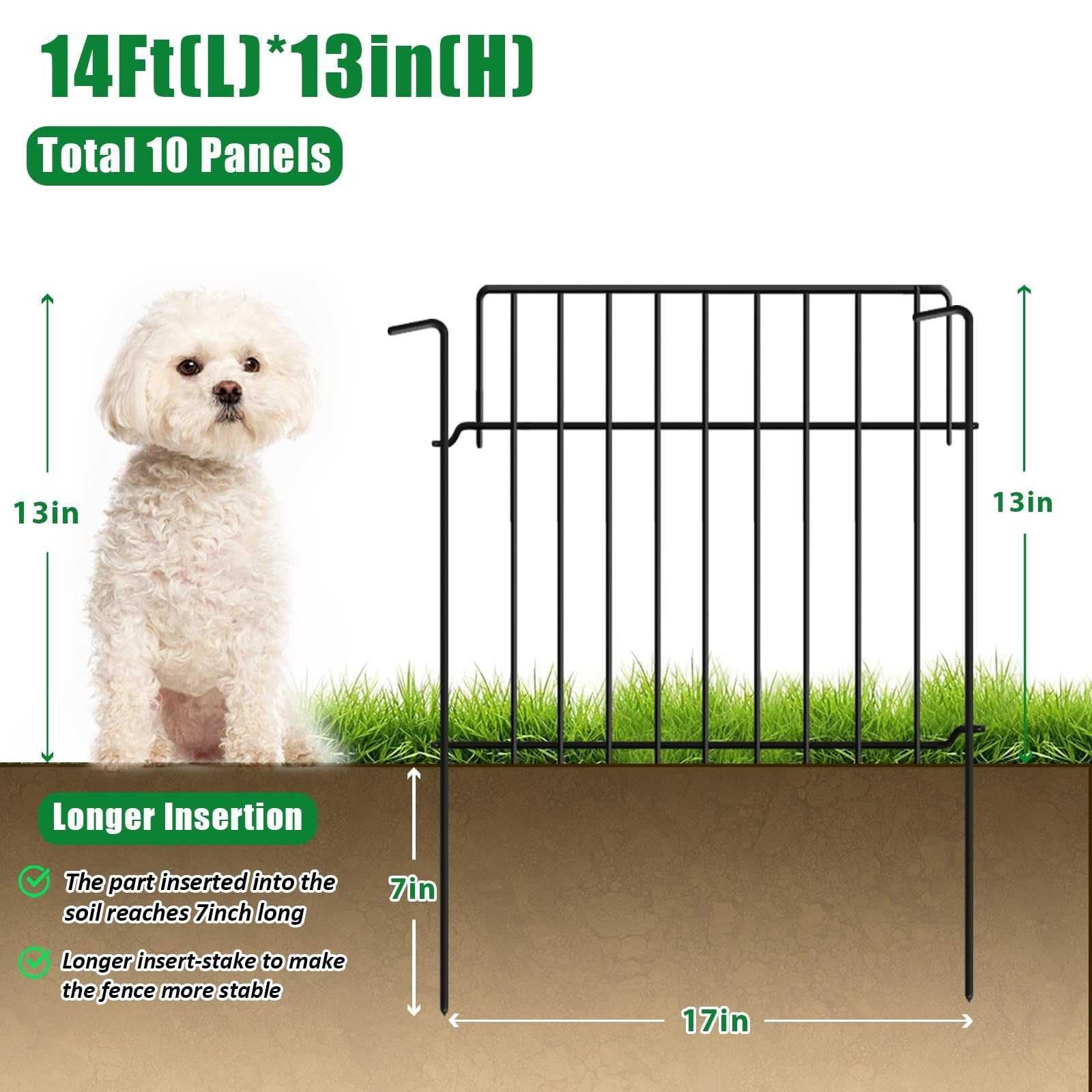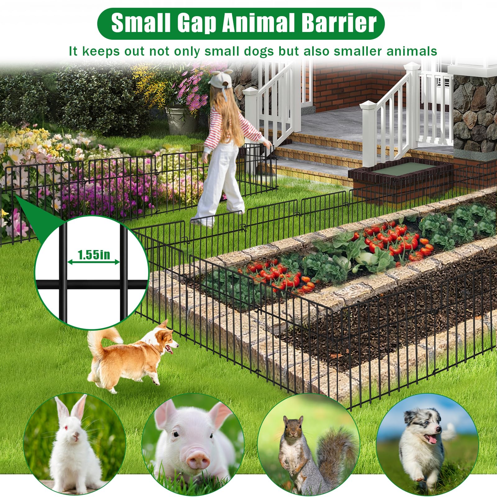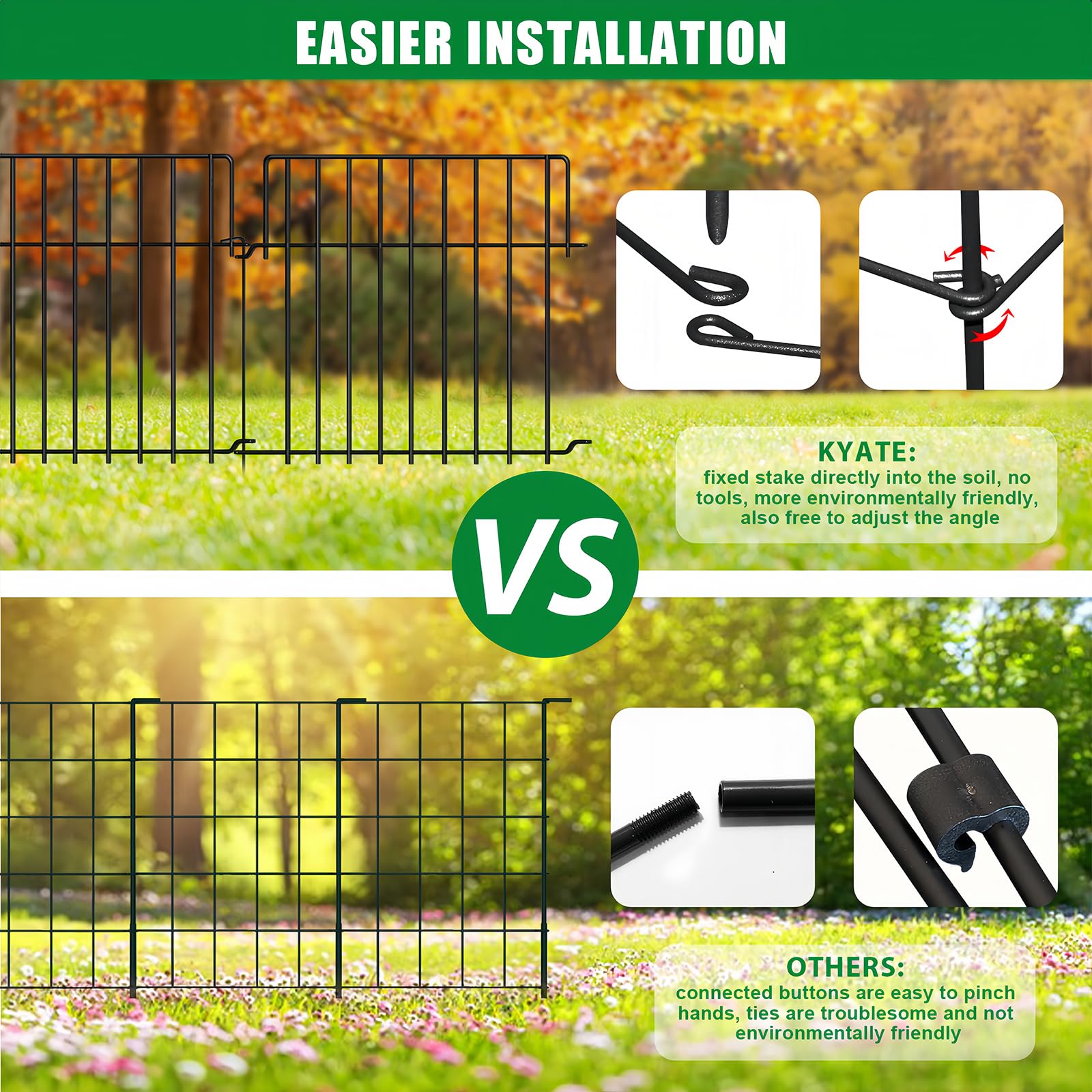 Versatile Garden Fence - A Sturdy And Decorative Solution For Your Outdoor Space! The no dig fence is made of high-quality metal wire, with a rust-resistant coating that ensures long-lasting durability against various weather conditions. Each piece of fence has a height of 17 inches and a width of 13 inches. The fixed stake is 20 inches in length, of which the insertion into the soil is 7 inches in length, providing a more stable base than traditional fencing. The gap width of the plate is 1.44-inch, it effectively prevents small pets like hamsters, hedgehogs, and groundhogs from escaping. Not only does this garden fence serve as a decorative barrier for flower beds, but it can also function as an animal barrier fence, dog fence, or even a temporary fence for outdoor events. With its no-tool assembly, installation is quick and easy, and it can be shaped to suit your specific needs. Add a touch of elegance to your garden with our garden fence!