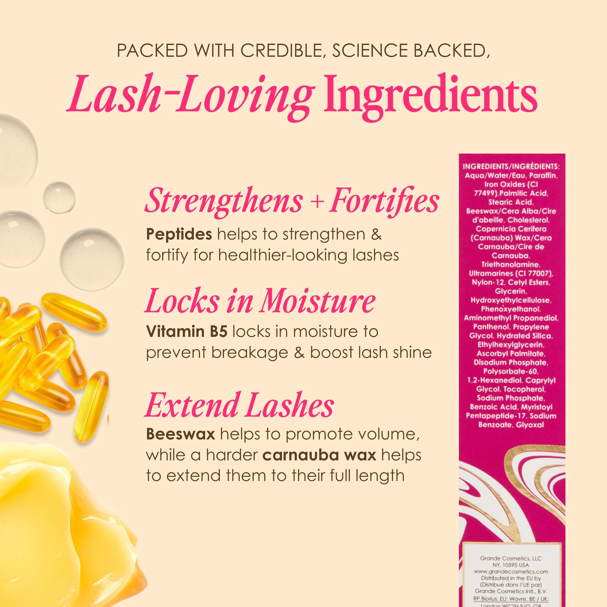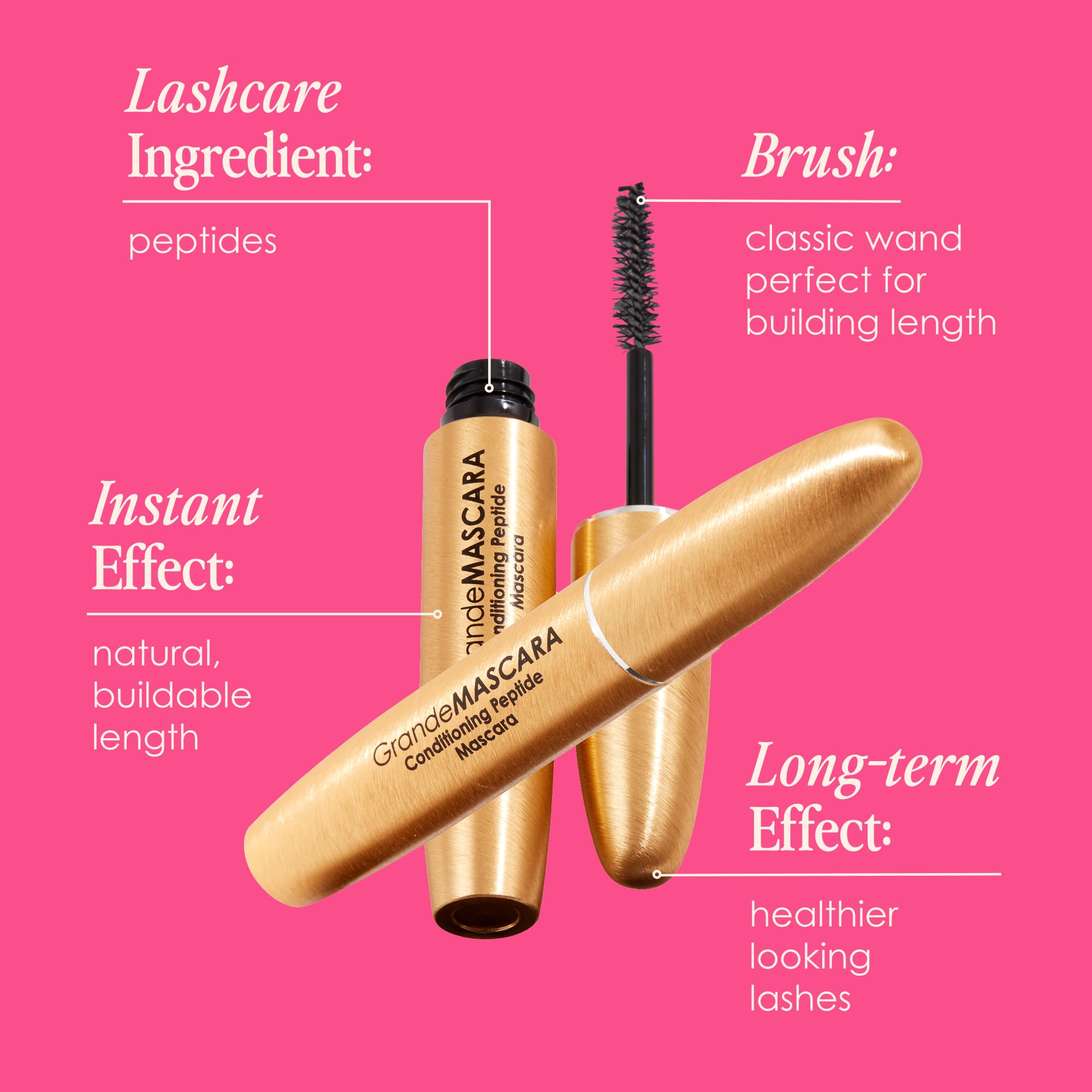 Product Description Condition while you coat! This exclusive mascara not only provides volume and length, but is infused with a lash-loving blend of peptides, panthenols, and natural waxes. These key ingredients condition your lashes while you coat them to promote the appearance of healthier looking lashes over time. Its buildable, clump-free, water-resistant formula is easily removable to prevent lash breakage while keeping the lashes flexible and strong. The applicator brush is made with the perfect combination of hard and soft fibers to lift lashes and achieve ultimate volume. Ophthalmologist tested. Suitable for contacts and lash extensions. INGREDIENTS: Water/Aqua/Eau, Paraffin, Iron Oxides (CI 77499), Palmitic Acid, Beeswax/Cera Alba/Cire d'abeille, Cholesterol, Copernicia Cerifera (Carnauba) Wax/Cera Carnauba/Cire de carnauba, Triethanolamine, Stearic Acid, Ultramarines (CI 77007), Nylon 12, Cetyl Esters, Glycerin, Hydroxyethylcellulose, Phenoxyethanol, Aminomethyl Propanediol, Panthenol, Propylene Glycol, Hydrated Silica, Ascorbyl Palmitate, Ethylhexylglycerin, Myristoyl Pentapeptide-17. Brand Story Enhance your own natural beauty with the Grande Collection! Our mission is for you to be able to enhance your own natural features, including your real lashes, lips, brows & hair with safe & effective formulas.