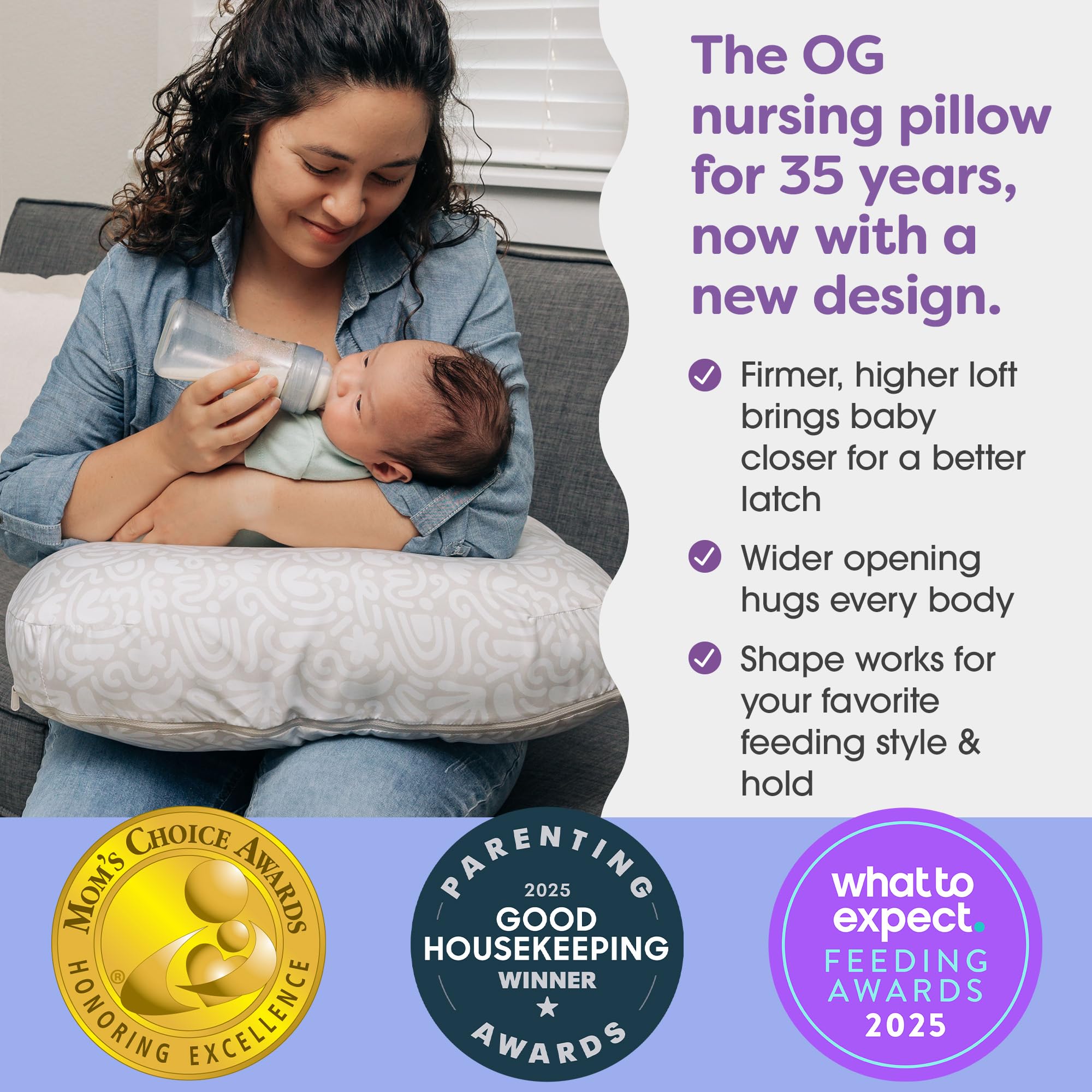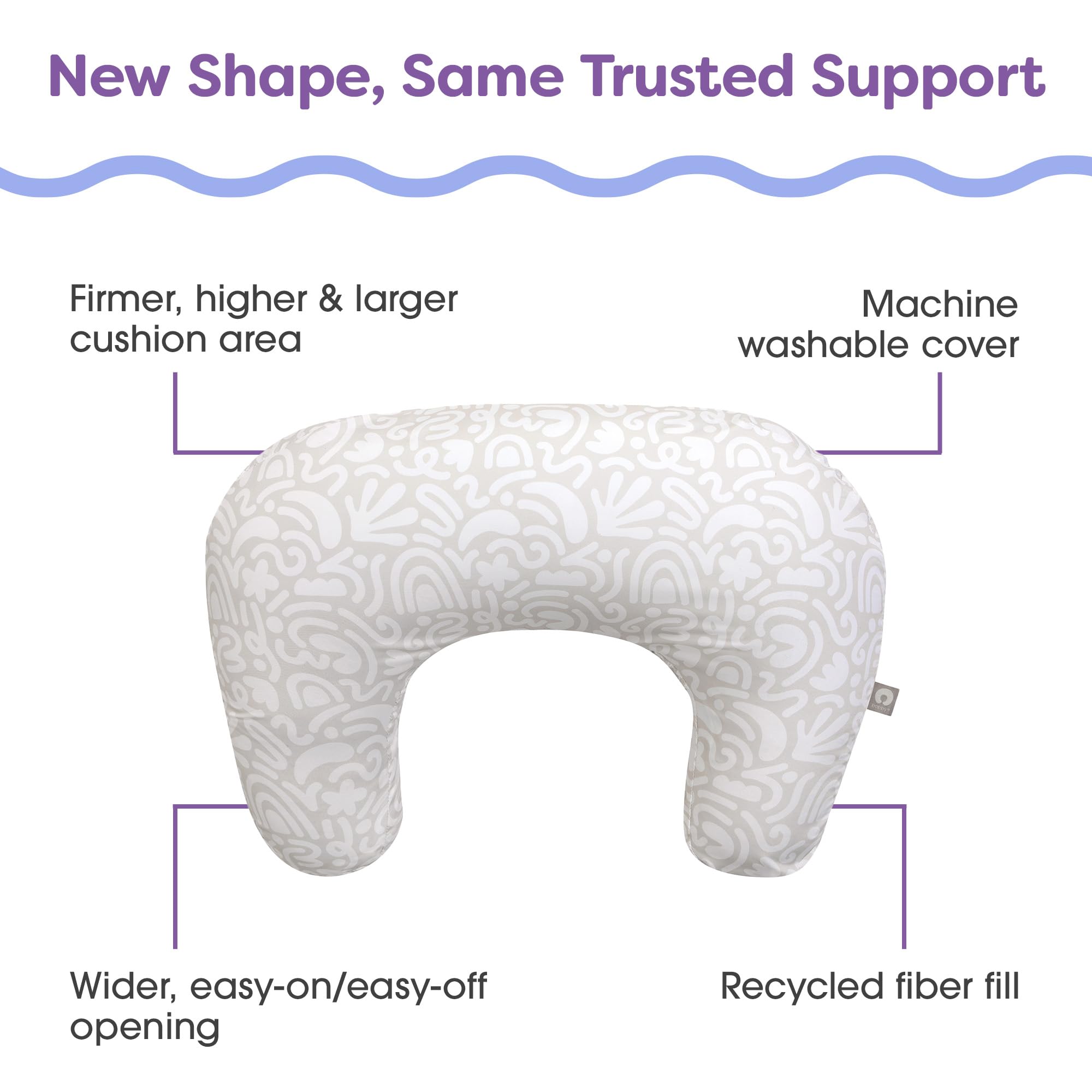 Introducing the Updated Boppy Nursing Pillow, your comfy, snuggly sidekick for feeding moments. This redesigned cutie, dreamed up by clever moms, gives your arms and back a break while keeping baby at the perfect angle for breastfeeding and bottle feeding. Did you know the average nursing mom clocks over 35 hours a week feeding? Talk about a full-time job. But fear not, our Redesigned Boppy Nursing Pillow is here to save the day (and night), just as our Original Boppy Nursing Pillow has done for 35 years. With its updated, versatile design, you can cradle, cross cradle, or football hold with ease. This pillow’s got your back (literally) with its larger, firmer shape that hugs every body type just right, keeping baby snug and positioned just right. It’s small enough to fit in your rocking chair or glider but big enough to deliver all the support you need. No wonder it’s been a registry must-have and a favorite among moms, dads, caregivers and lactation consultants alike for over three decades. The easy-on, easy-off, beltless design has a wider opening and means you can pop it on with one hand—because what mom or dad has two free hands? Plus, its removable cover is machine washable for those inevitable messes. Filled with hypoallergenic, recycled fiber, it’s as carefree as it is cozy. Got a laundry day? No worries. We’ve got extra covers so you can always have a fresh one ready. Just remember, this pillow is for supervised awake-time only—no snoozing allowed! Trust Boppy to keep you and your baby comfy, happy, and oh-so-confident. Let’s make feeding time the best time.