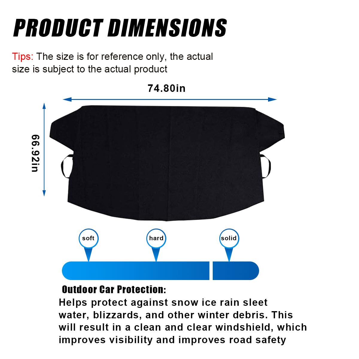 【Wide Application】: The size of the front window protector is 74.8×66.92 inches, which can fully cover the rear windshield of most vehicles, such as cars, trucks, SUVs, and lorries, saving you time to scrape ice every day.
