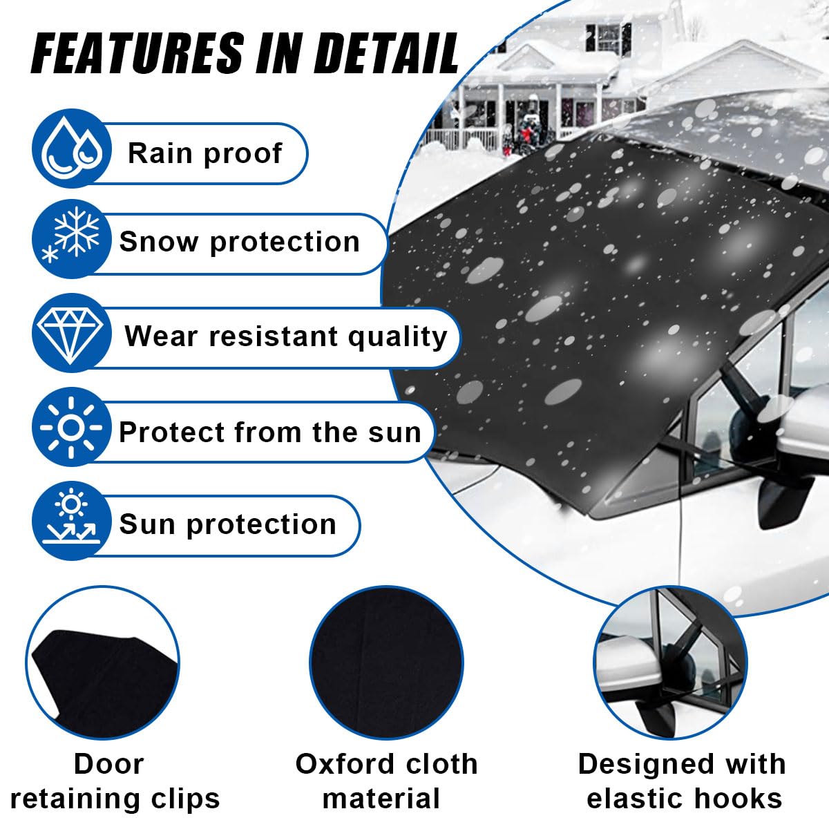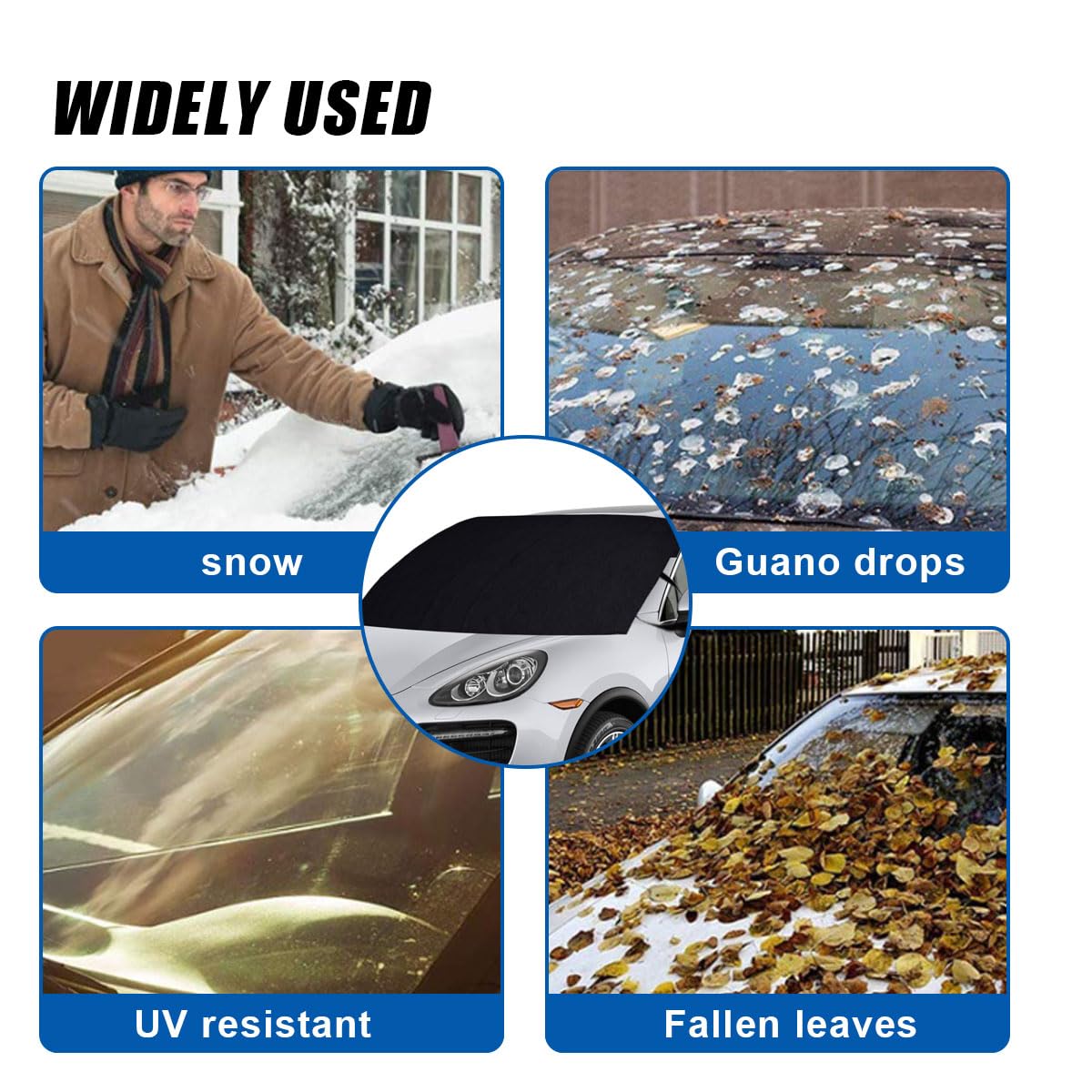 【High-Quality Materials】: The front windshield snow cover is made of high-quality Oxford cloth, which is soft and resistant to tearing, and is not easily cause scratches when covered on the car; the waterproof performance can prevent rain and snow from penetrating into the protective cover, and it is easy to remove snow.