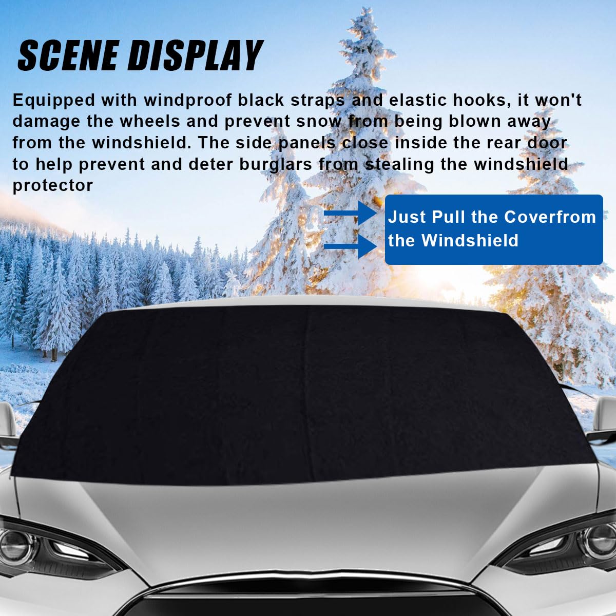 【Easy Installation】: The front windshield snow cover is very easy to use. Just fix the strap on the rear veiw mirror, place the two side wings on the inside of the car door, and close the door to complete the installation; remove the strap and the protective cover when removing.