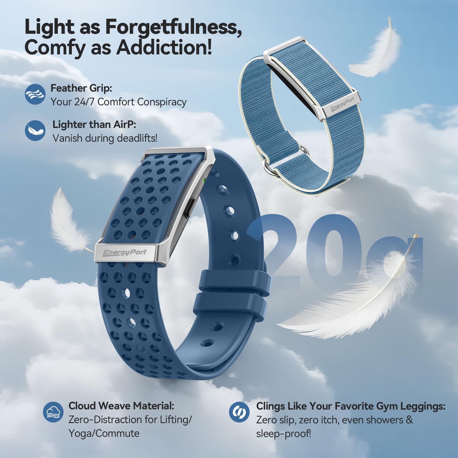 24/7 FEATHER-LIGHT COMFORT—Revolutionary 25g design (50% lighter than competitors) feels invisible. Cloud-like skin-friendly material ensures zero discomfort during workouts/commuting/sleep. Patented dual strap system: nylon (sweat-proof) + silicone (hypoallergenic). Stays secure like sportswear - no slipping/irritation. Shower-safe for true 24/7 comfort.