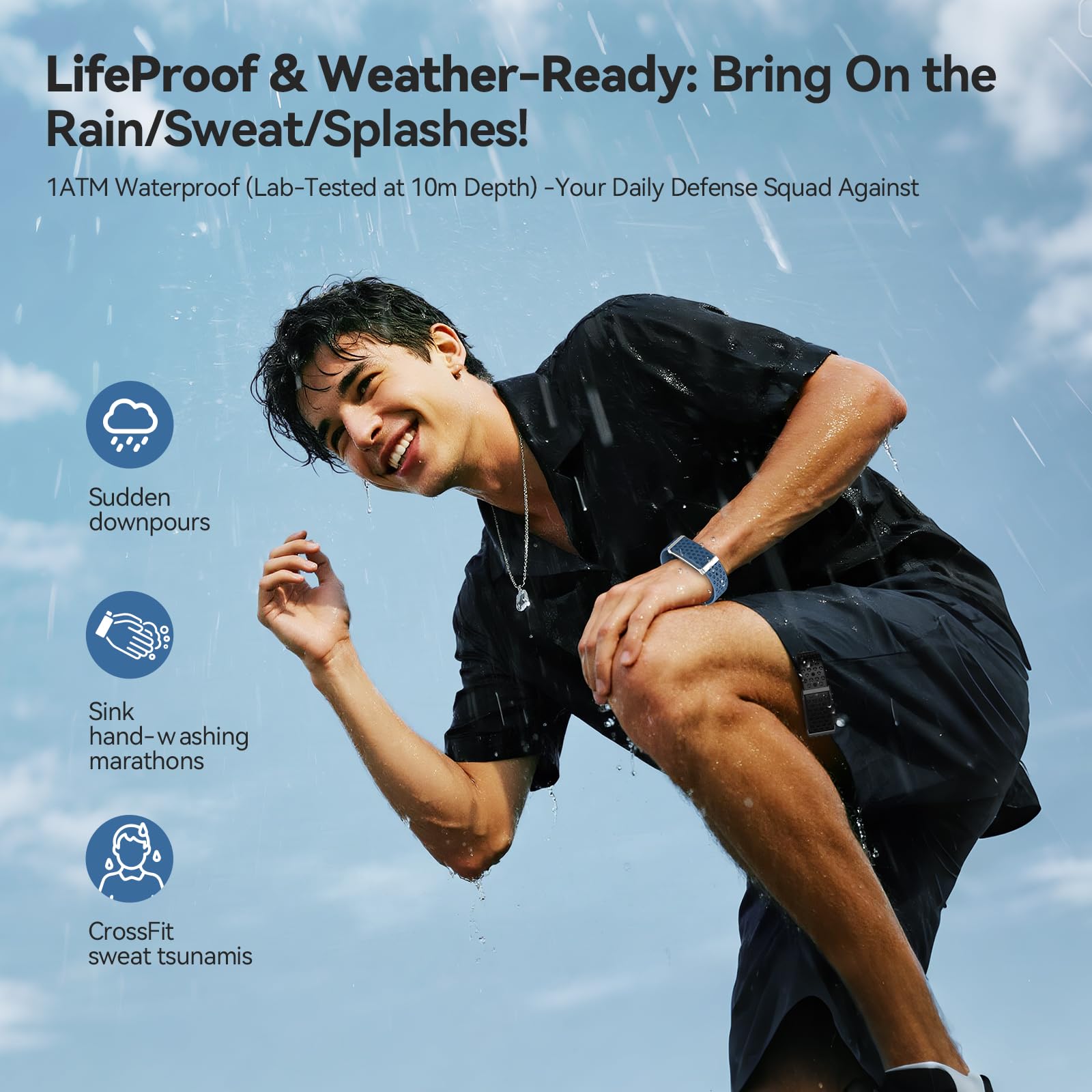 45-DAY BATTERY & WATERPROOF—Ultra-long battery: 45-60 days standby, 20-30 days regular use (3x industry standard). Single charge lasts 30 days - ideal for travel/camping. 1ATM waterproof (10m depth) handles rain/sweat/handwashing. Live freely without charging worries. (Avoid hot water immersion)