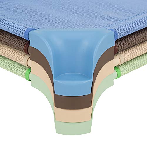 After long hours of play or learning, the Sprogs Stackable Daycare Cots provides your little ones with the perfect place to cozy up and relax for a safe nap. These child-friendly sleeping cots are designed with care to ensure a comfortable napping surface for preschoolers and sleepy toddlers, making them great for classrooms, daycare centers, or any room in your home. For optimal convenience in the classroom, the copolymer corners on each cot nest together tightly to allow you to neatly stack them up to 24 high for compact storage after nap time, and rolling casters (sold separately) can be attached to the bottom of the cots to simplify set up and clean up. The durable, non-flammable mesh fabric with a vinyl coating makes clean-ups a breeze - simply scrub the cot with a damp soapy sponge and wipe it dry. Constructed with a sturdy 18-gauge steel frame, these naptime cots withstand years of heavy-duty use and support up to 150 pounds, and they're backed by a 20-year warranty. Each Greenguard Gold Certified children's cot is easy to assemble and measures 52" L x 23"W x 5"H to fit neatly in classrooms or homes without taking up too much space.
