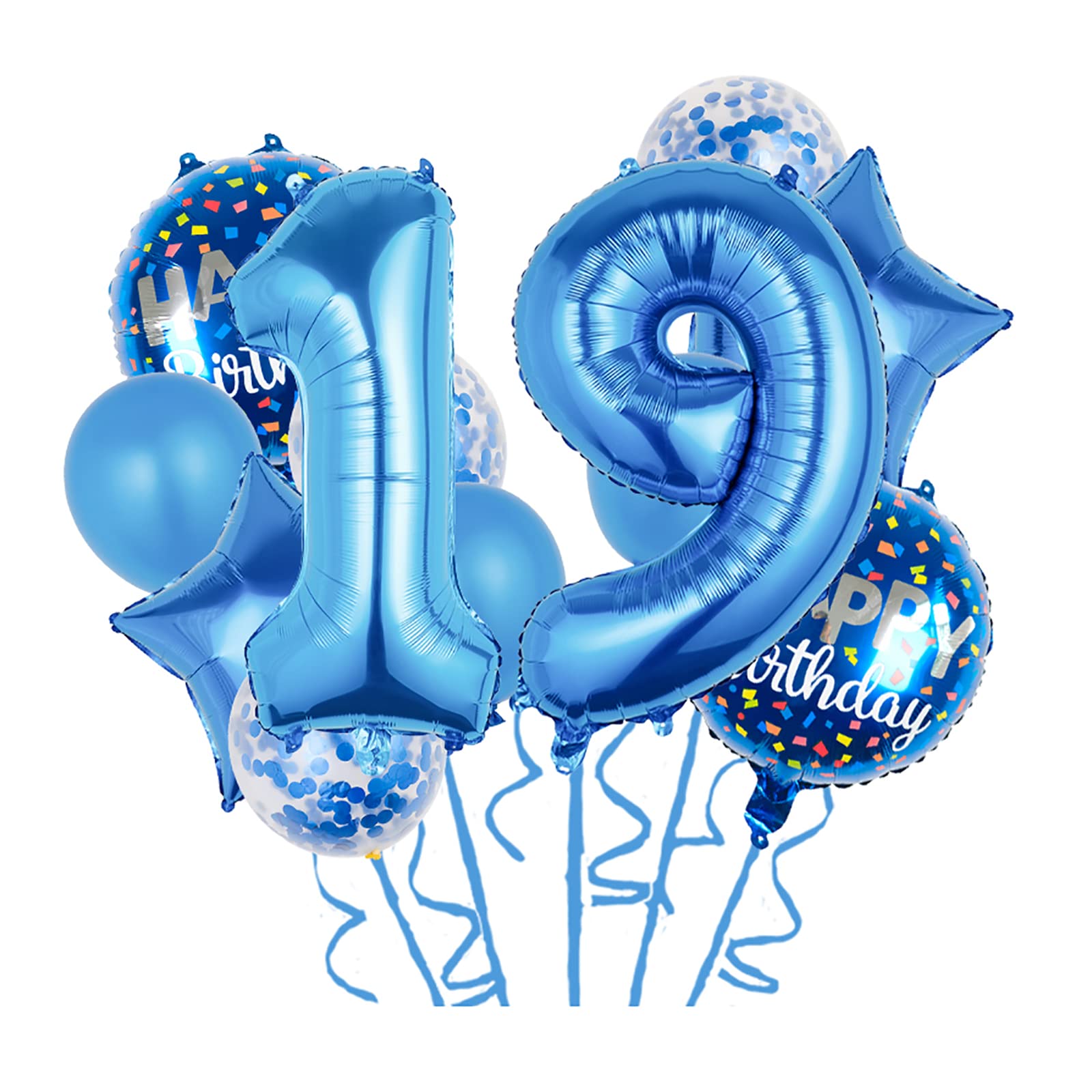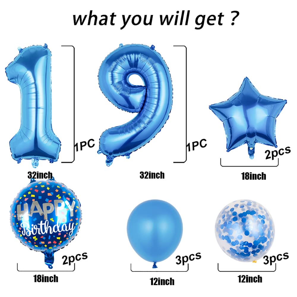 Package comes with 2pc 32 inch Number 19 Foil Mylar Balloons, 2 pcs 18 inch Letter Balloon, 3 pcs 12inch blue latex balloon, 3 pcs 12 inch blue confetti balloon, 2 pcs 12inch stars,1 ribbon.