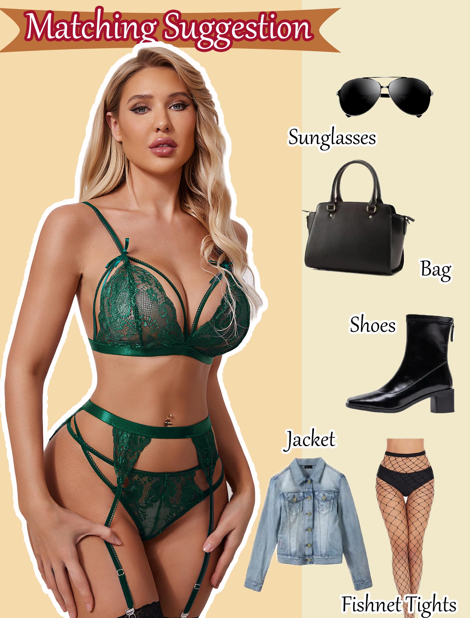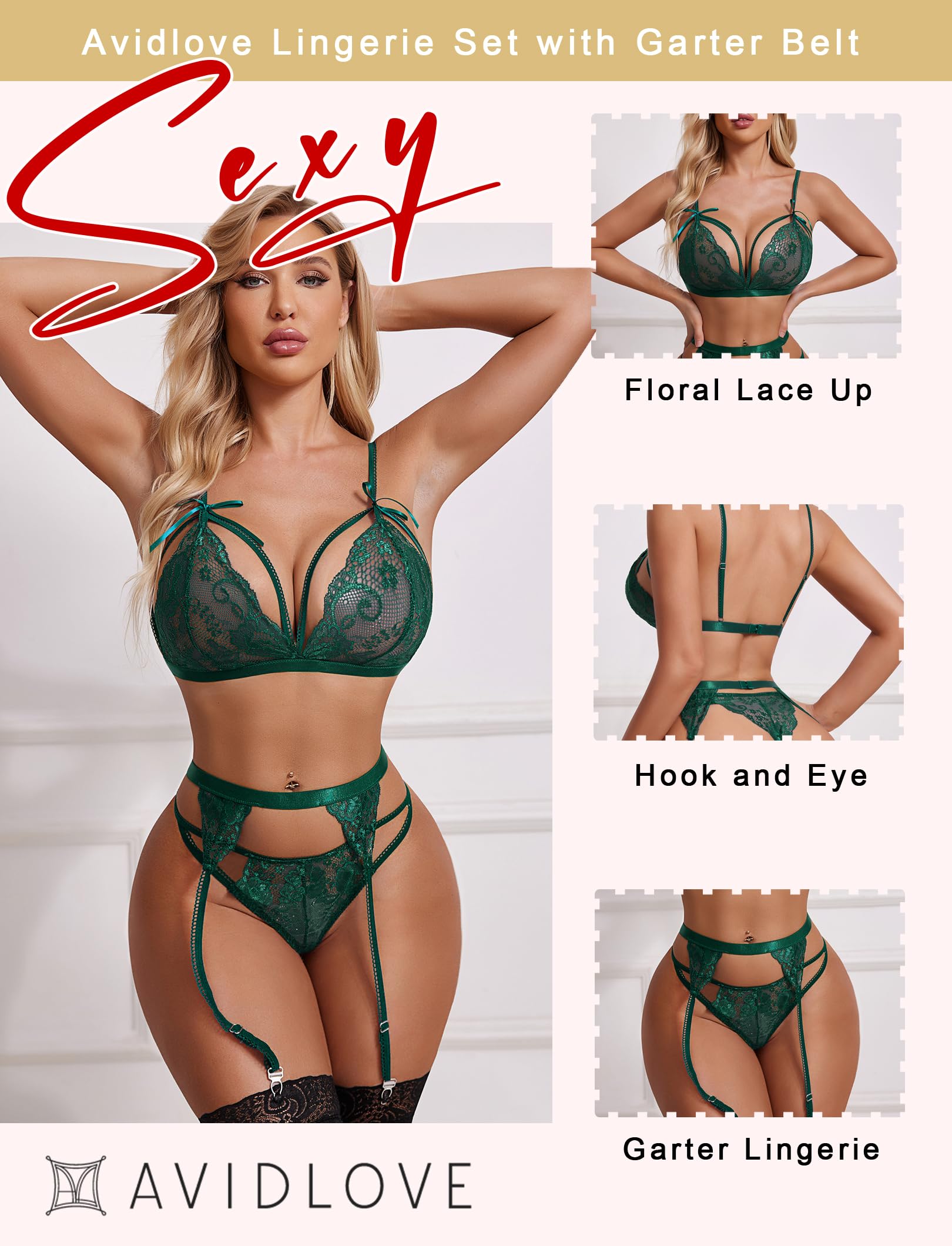 Avidlove Women lace lingerie set features sheer lace cups with strappy detail, satin bow accents, adjustable spaghetti straps, a hook back closure, a matching high waisted garter belt with adjustable garter straps.
