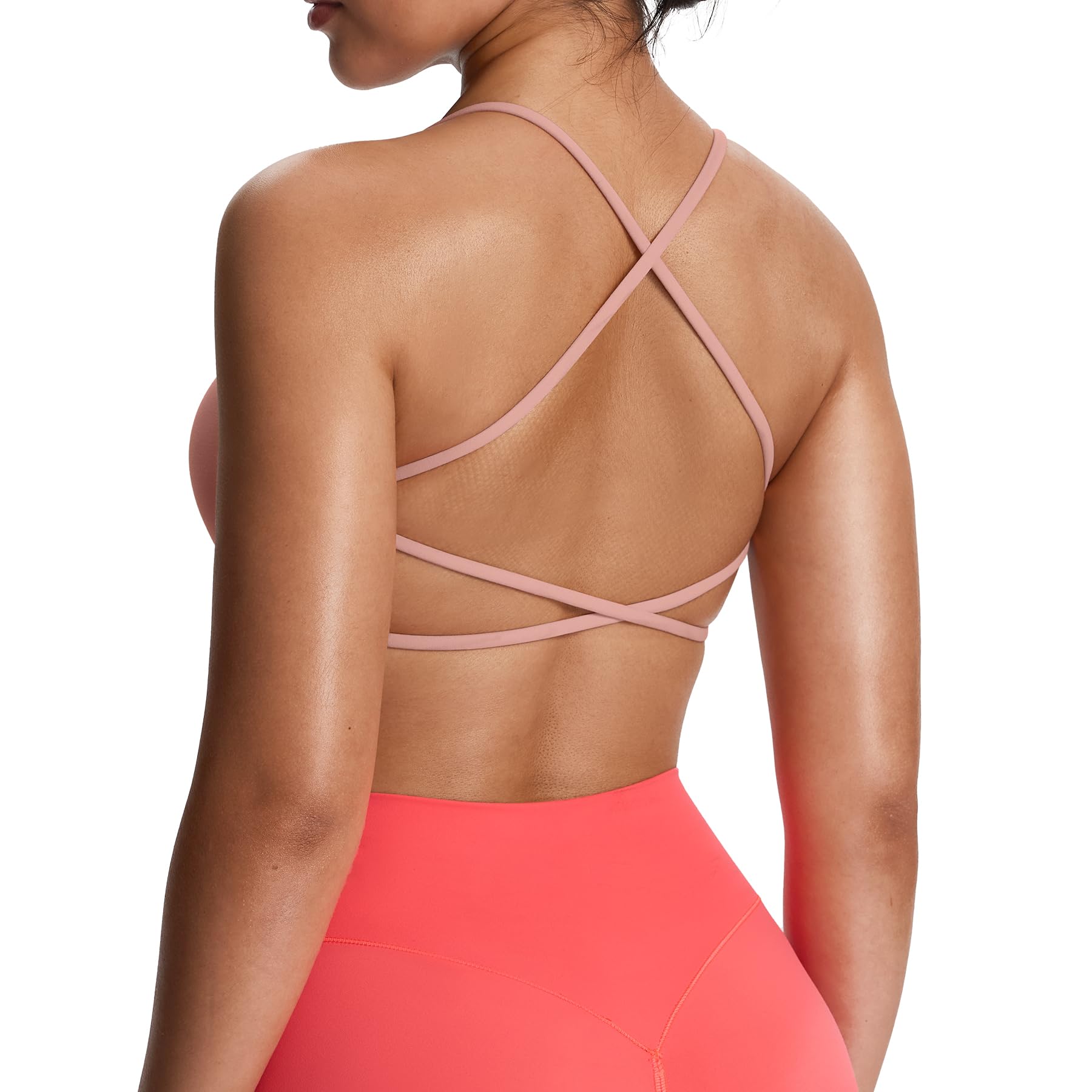 The Sienna twist womens sports bra featuring thin crossed back straps and padding, despite small straps, it doesn’t bite into your traps and cause neck pain