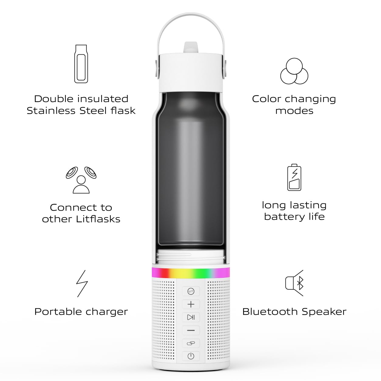 Practical Design: Featuring a built-in microphone for hands-free calls, an LED light, and a convenient carry handle, LitFlask is designed for your active lifestyle.