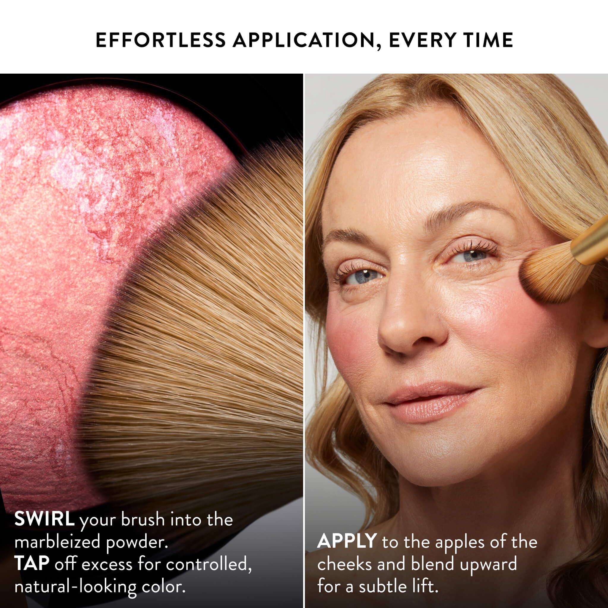 BAKED BLUSH-N-BRIGHTEN MARBELIZED BLUSH: Get an instant flush of color with a hint of radiance from this marbleized blush with a creamy texture and weightless feel. Handmade in Italy, the award-winning formula self-adjusts to your skin tone and is enriched with antioxidants, so your healthy glow is actually healthy for your skin from the inside out.
